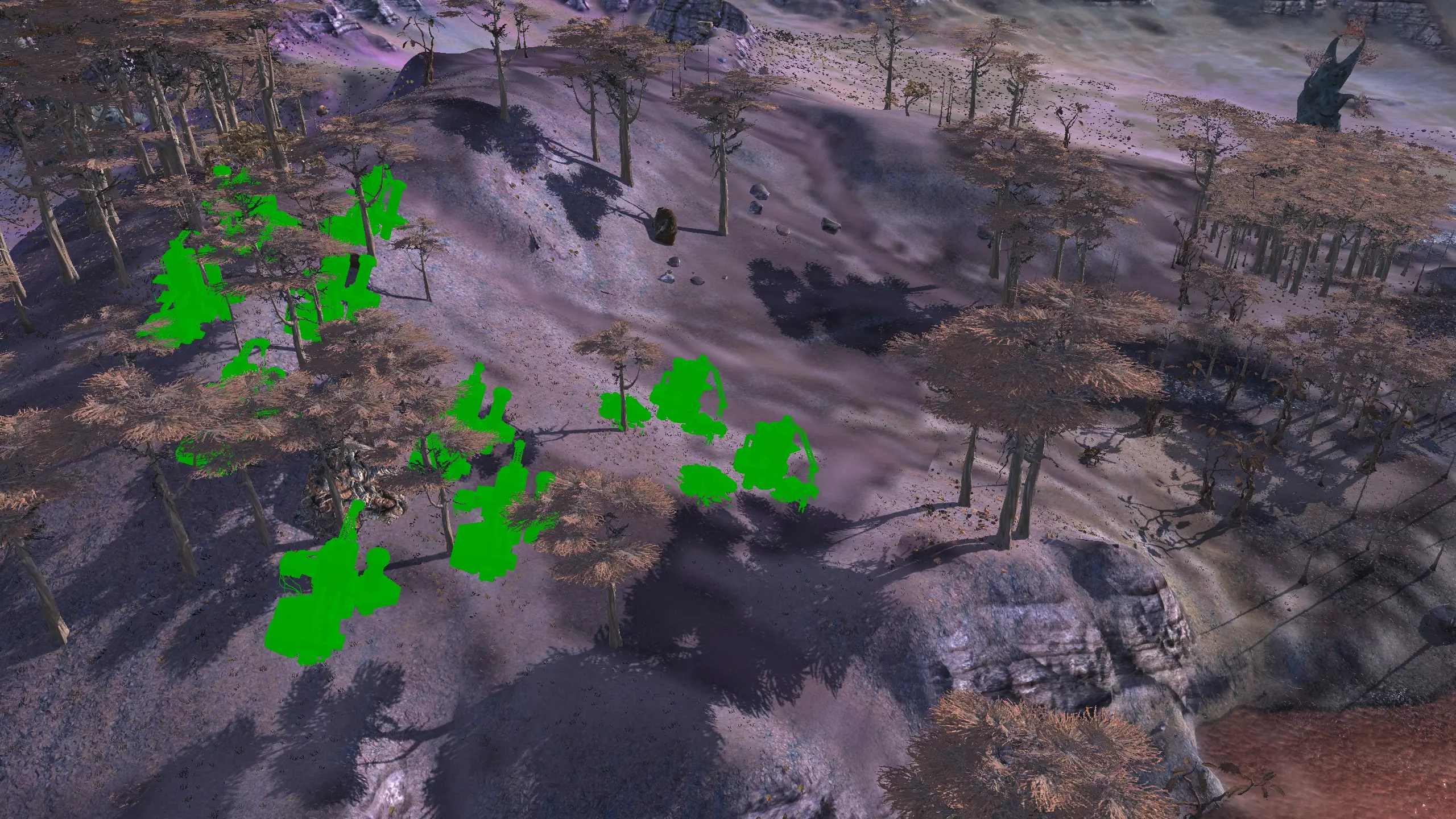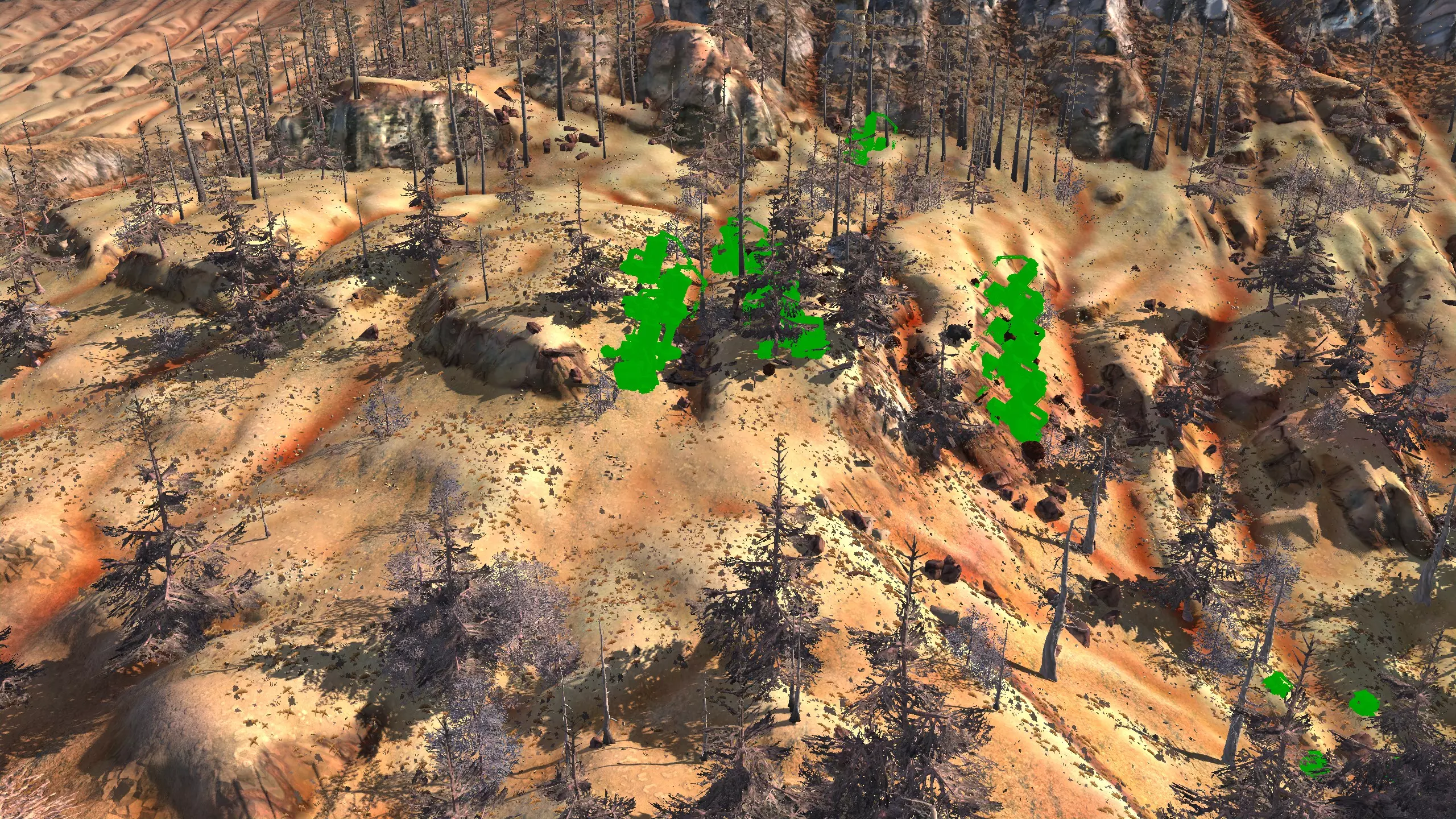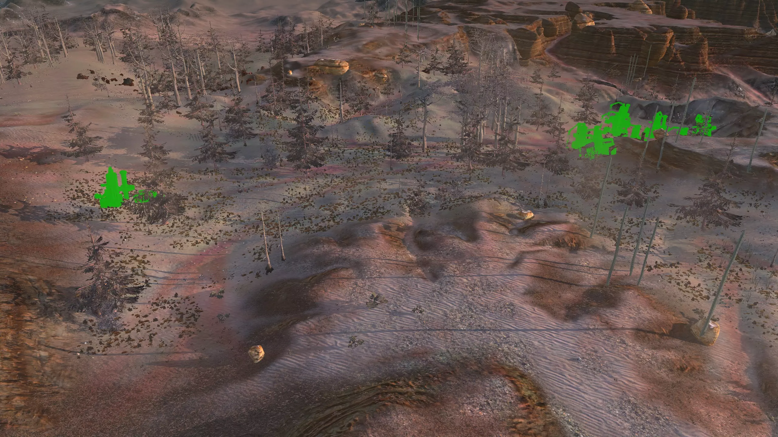 这个被社区称为【彩虹谷】的地点(我不知道这个名字的由来,但大家都这么叫)非常适合新手,因为它就在大多数玩家的游戏起始位置,而且你……通常……只需要应对相对较弱的袭击,还能获取所有必要的资源,并且有足够的空间建造。这里虽然不是特别有趣的地点,但视觉效果不错,而且满足了很多需求。资源:90%铁,约70-80%铜,100%石头,60%水,100%肥力 危险:饥饿/沙尘土匪、沙克族、骸骨强盗 2-B) 燃烧森林、黑色沙漠 燃烧森林 注意:我确实调查了整片森林,但大部分区域最终都因为建造起来太令人沮丧、不够有趣,或者和沼泽类似,布满了随机树木和其他烦人的杂物,导致大部分区域过于卡顿且麻烦,不值得你花费时间。 1)