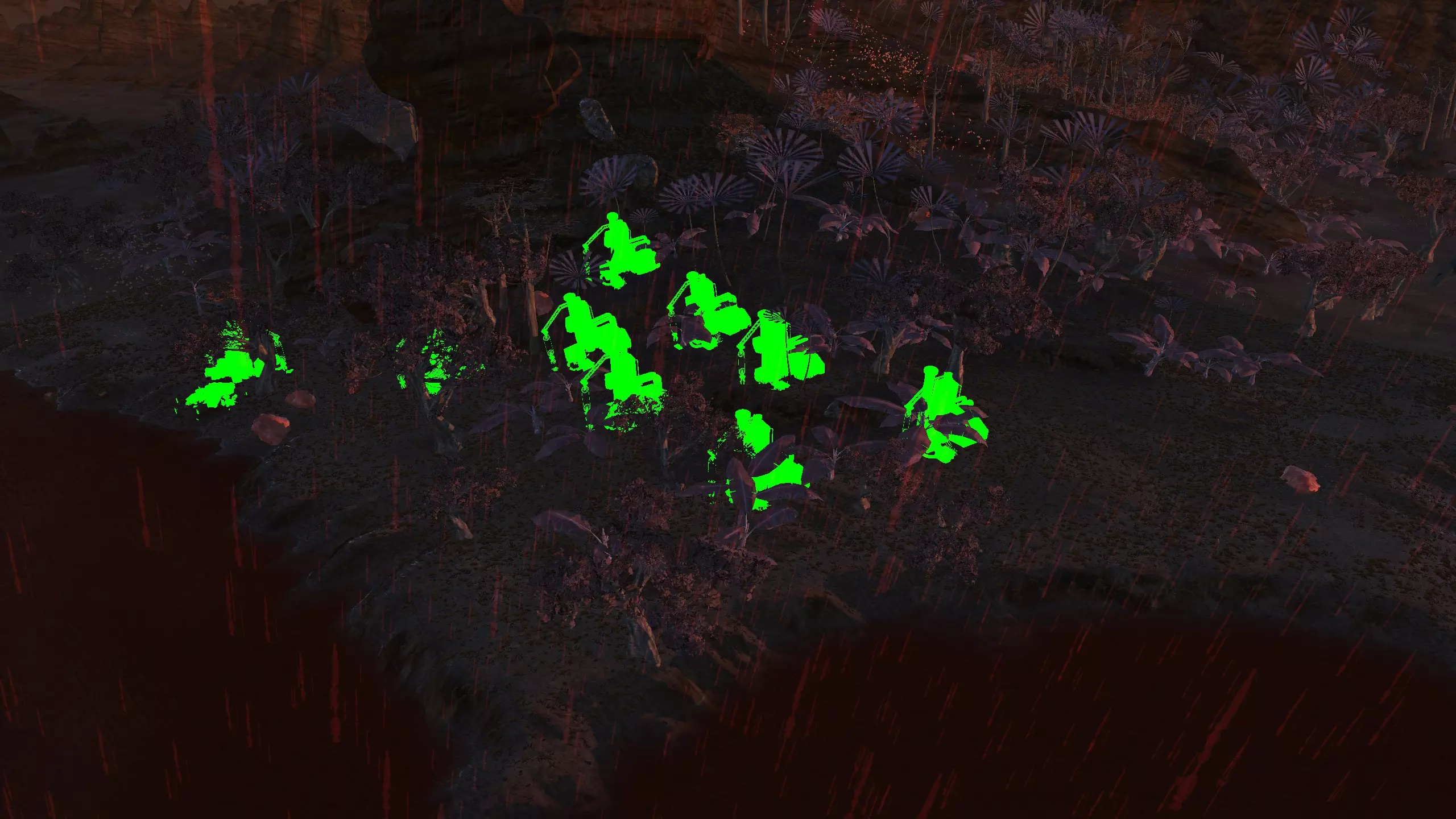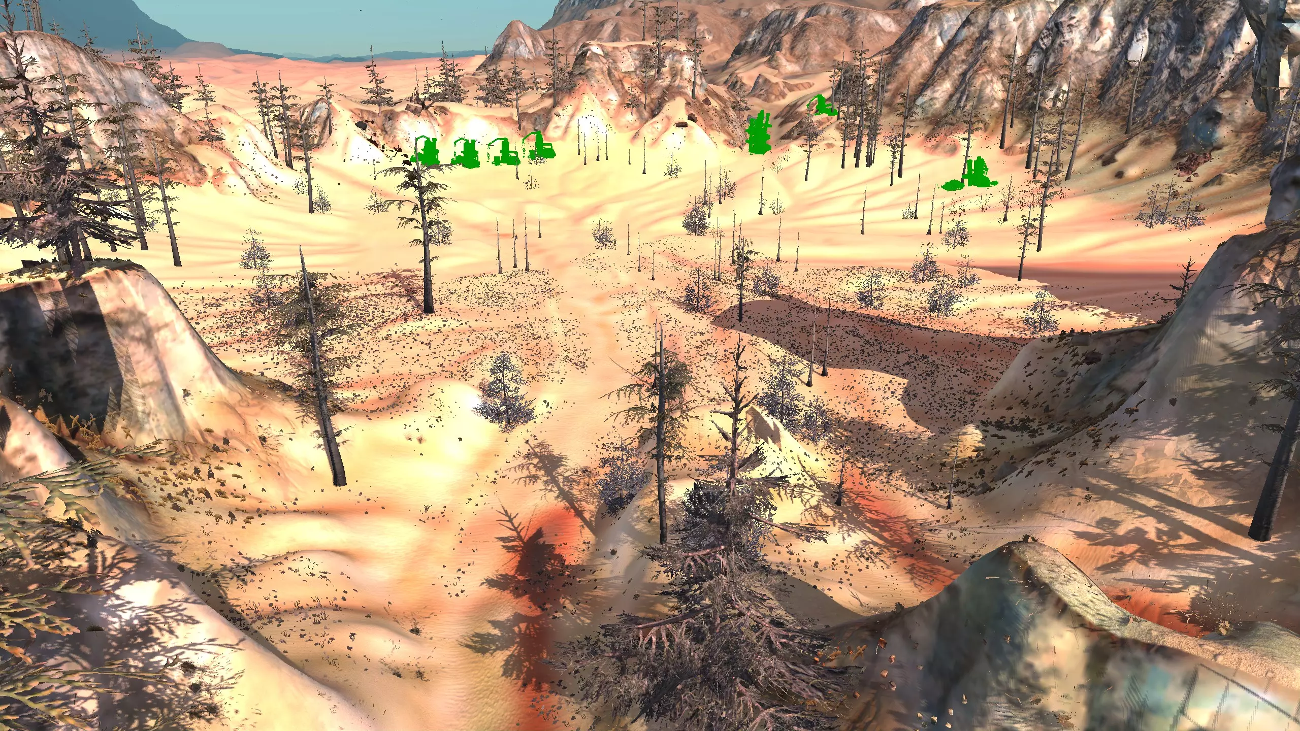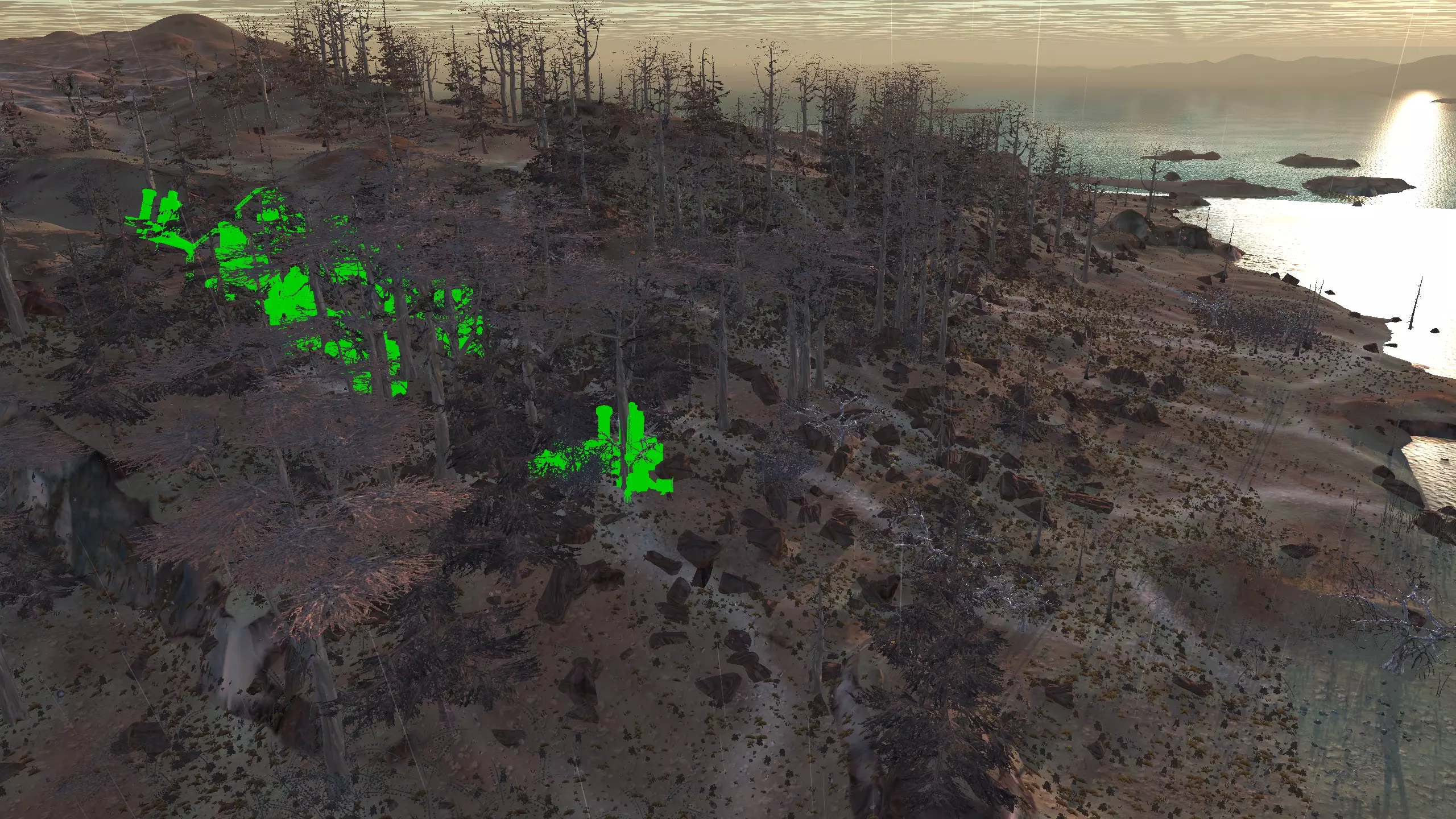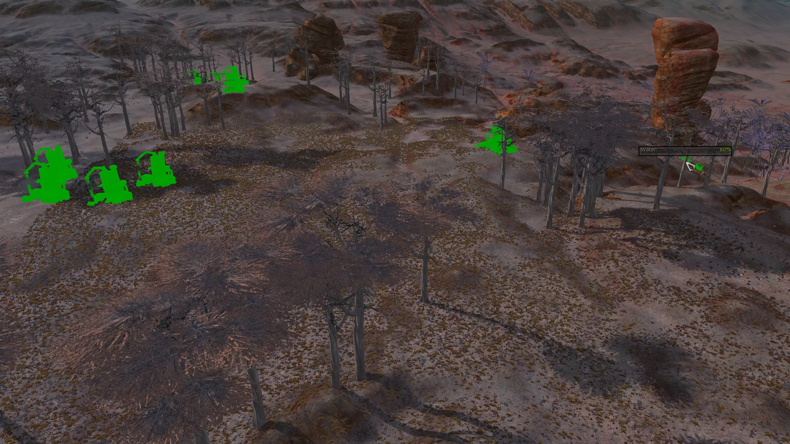 这个被社区称为【彩虹谷】的地点(我不知道这个名字的由来,但大家都这么叫)非常适合新手,因为它就在大多数玩家的游戏起始位置,而且你……通常……只需要应对相对较弱的袭击,还能获取所有必要的资源,并且有足够的空间建造。这里虽然不是特别有趣的地点,但视觉效果不错,而且满足了很多需求。资源:90%铁,约70-80%铜,100%石头,60%水,100%肥力 危险:饥饿/沙尘土匪、沙克族、骸骨强盗 2-B) 燃烧森林、黑色沙漠 燃烧森林 注意:我确实调查了整片森林,但大部分区域最终都因为建造起来太令人沮丧、不够有趣,或者和沼泽类似,布满了随机树木和其他烦人的杂物,导致大部分区域过于卡顿且麻烦,不值得你花费时间。 1)