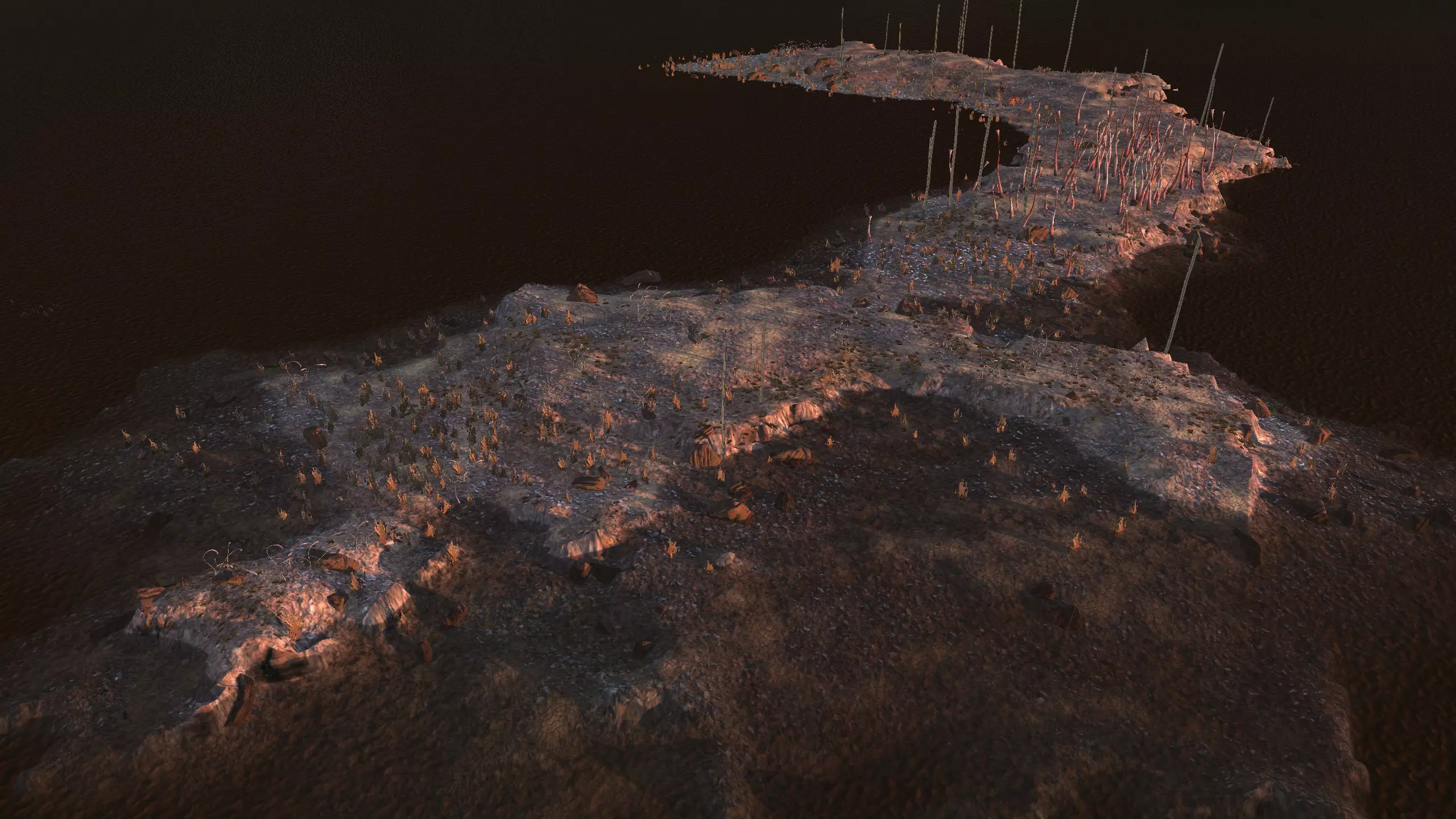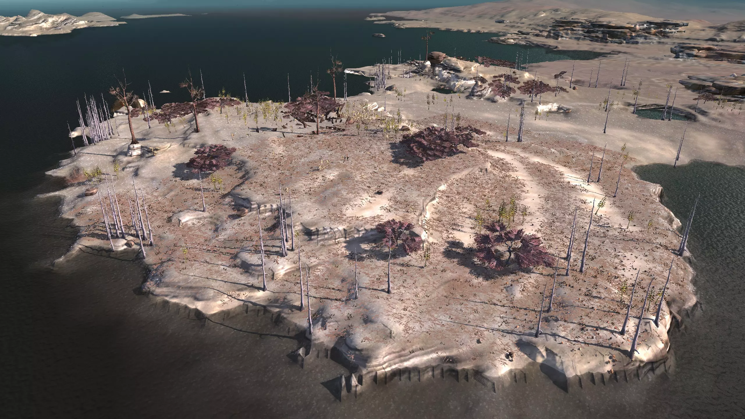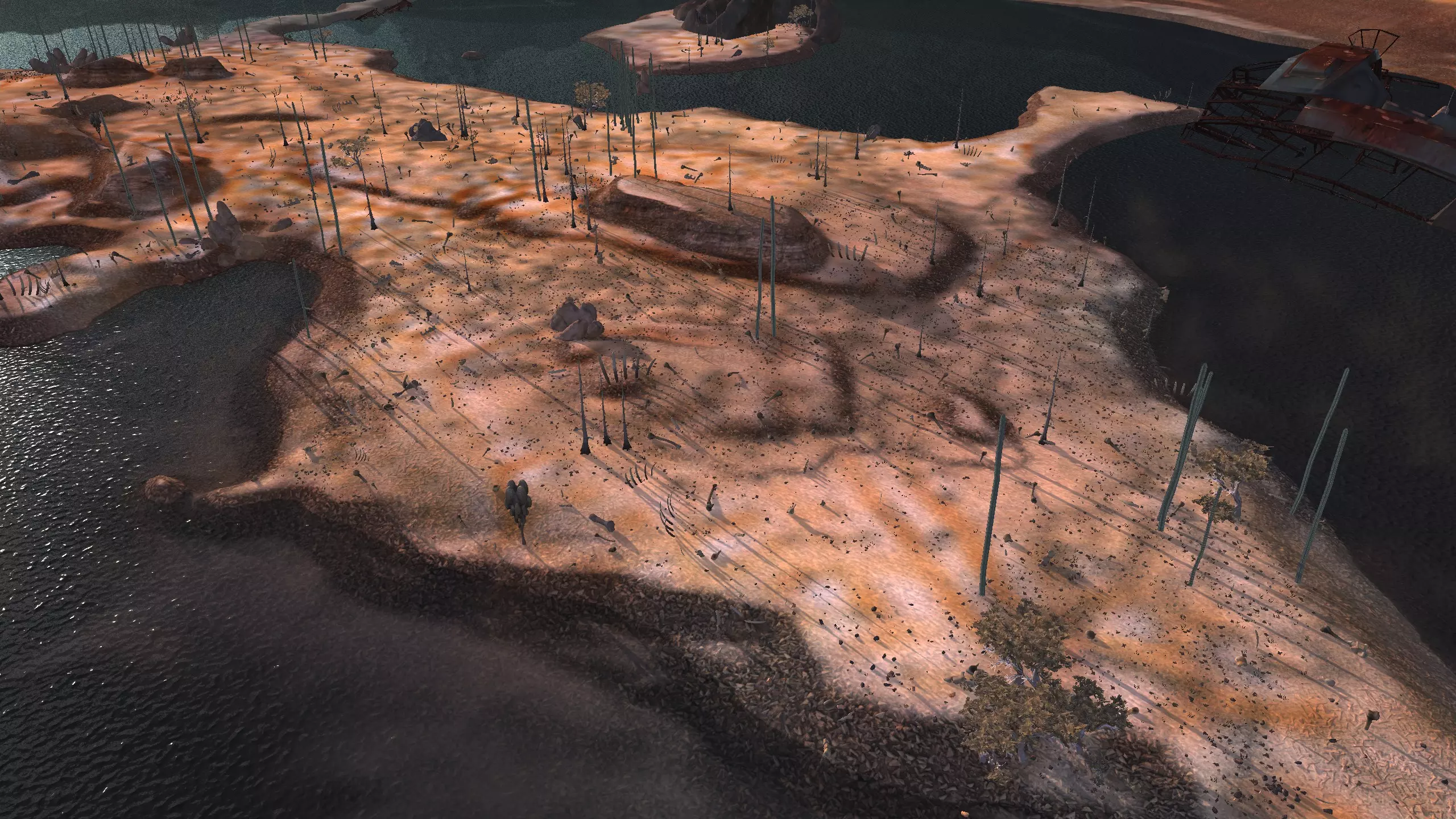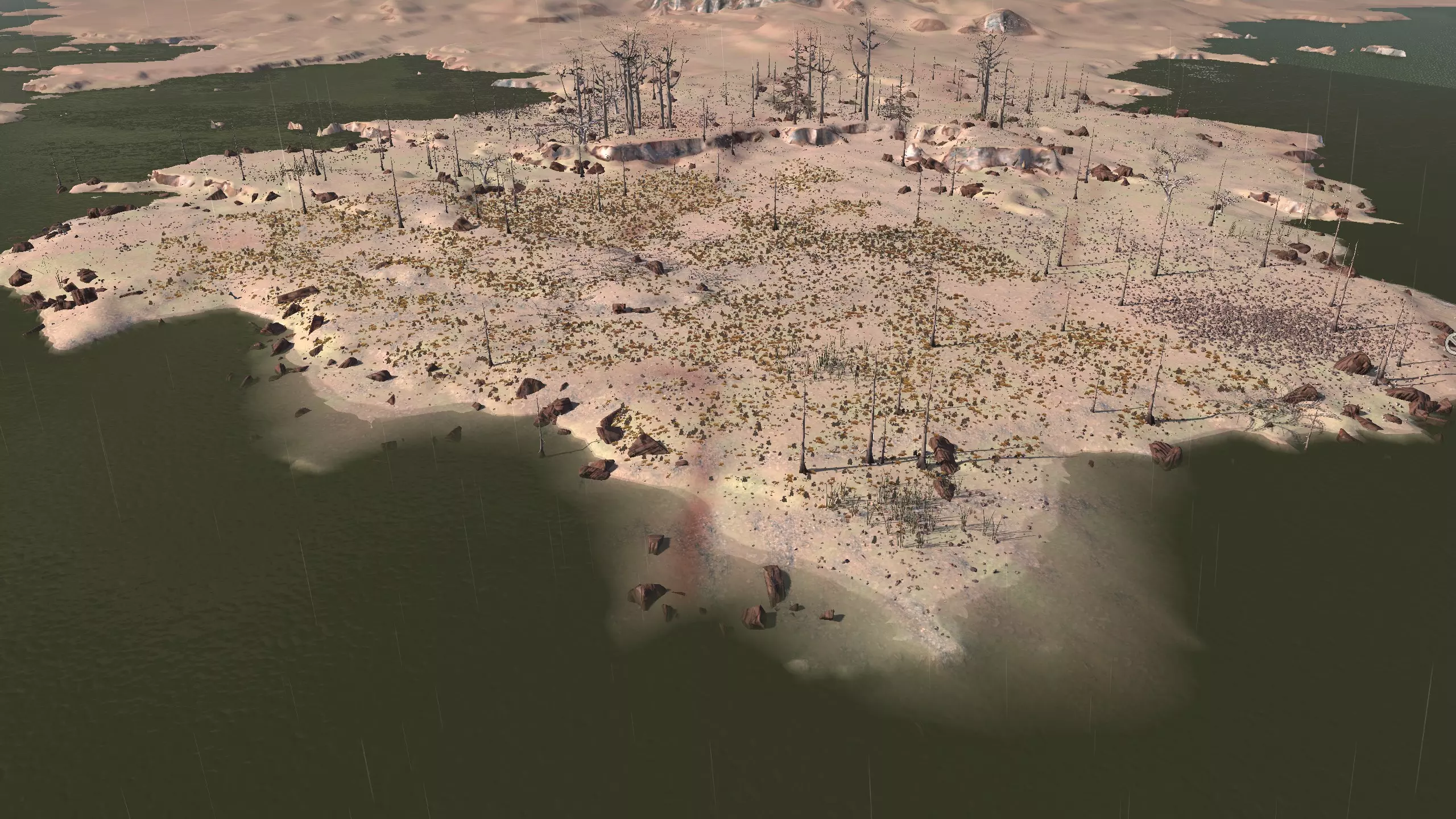 注意!这里是一个完全【什么都没有】的地点。它显示为“NONE”,但别管那个,我觉得这是个疏忽,这个地方真的应该命名为【暗指】。总之,这里什么都没有,带上你的模组,确保你有【深层钻探采矿】之类的功能,否则这个地方对你来说几乎没什么用。 我指出这个地方是因为,我就是喜欢这里宜人的海滨小镇氛围。漂亮的小海滩区域,有着温暖的沙滩、红色的棕榈树,还有一些雅致的平顶山状岩石。而且你有【超大空间】。 另外,在稍微偏北的地方有100%的水源和100%的肥沃度,或许可以把所有的食物生产设施放在那里,这样你就不用担心水培种植的问题了。资源:0% 铁,0% 铜,0% 石头,0%-100% 水,0-100% 肥力 危险:食人族!骨犬?说实话相当安全。 死亡之地 1)