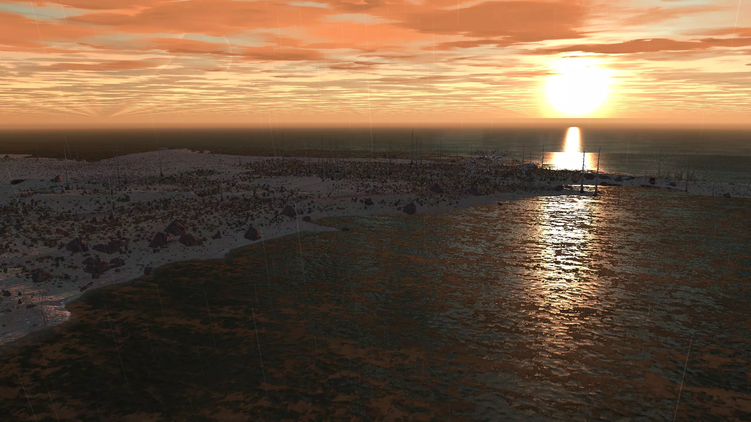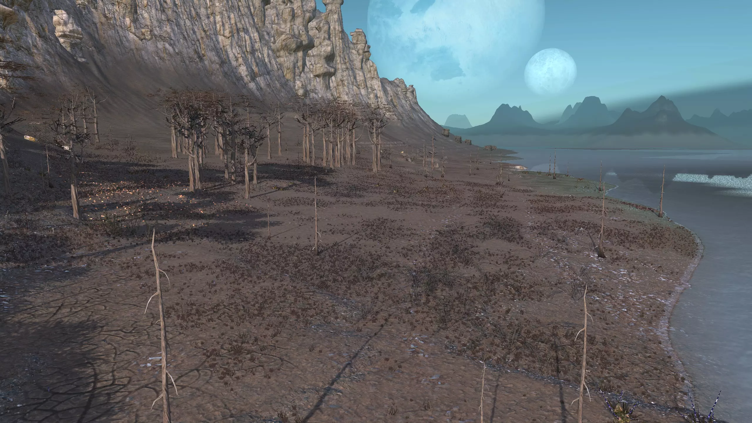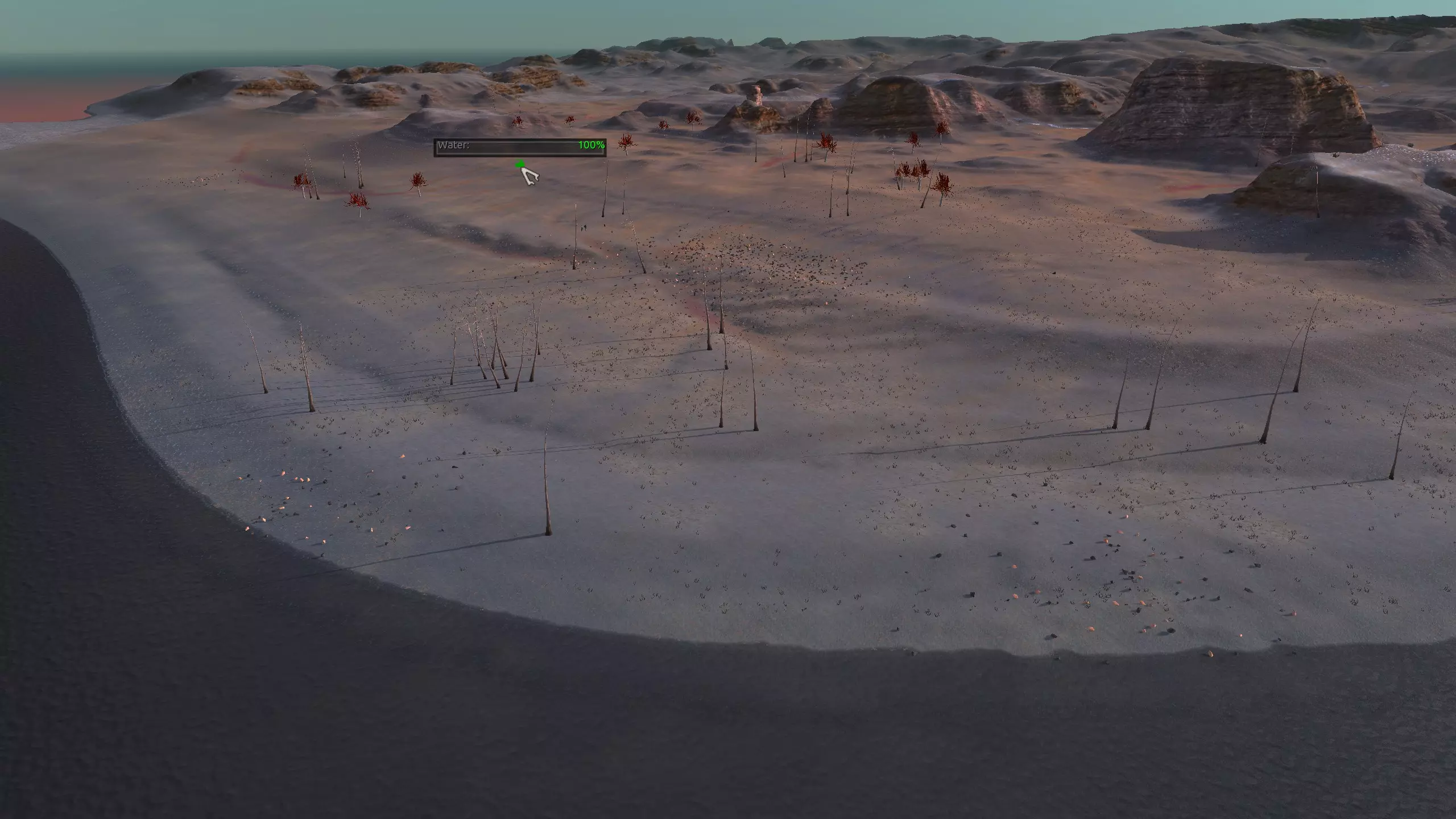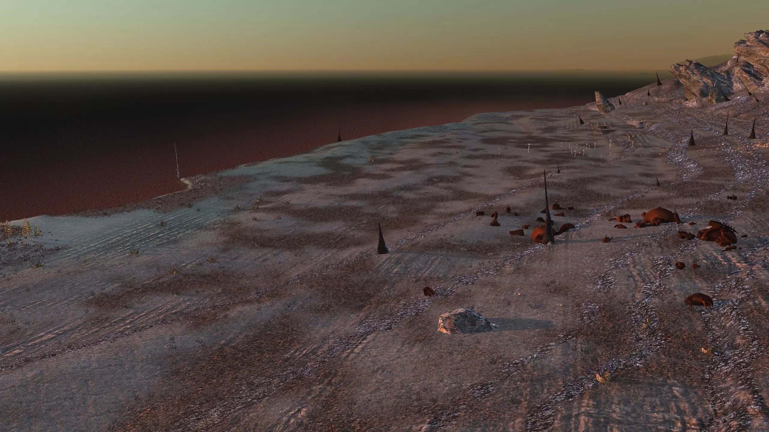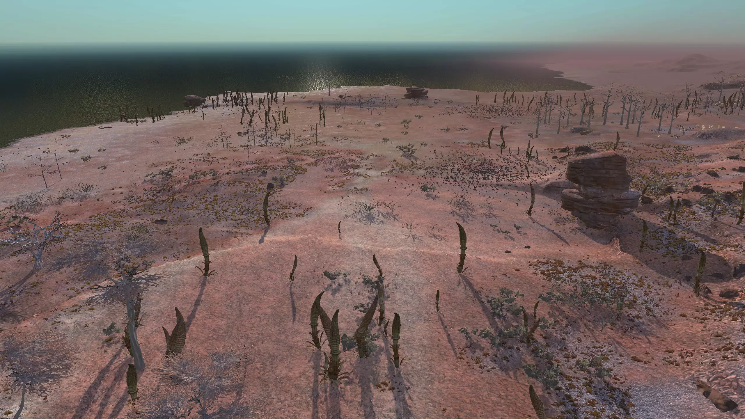 注意!这里是一个完全【什么都没有】的地点。它显示为“NONE”,但别管那个,我觉得这是个疏忽,这个地方真的应该命名为【暗指】。总之,这里什么都没有,带上你的模组,确保你有【深层钻探采矿】之类的功能,否则这个地方对你来说几乎没什么用。 我指出这个地方是因为,我就是喜欢这里宜人的海滨小镇氛围。漂亮的小海滩区域,有着温暖的沙滩、红色的棕榈树,还有一些雅致的平顶山状岩石。而且你有【超大空间】。 另外,在稍微偏北的地方有100%的水源和100%的肥沃度,或许可以把所有的食物生产设施放在那里,这样你就不用担心水培种植的问题了。资源:0% 铁,0% 铜,0% 石头,0%-100% 水,0-100% 肥力 危险:食人族!骨犬?说实话相当安全。 死亡之地 1)