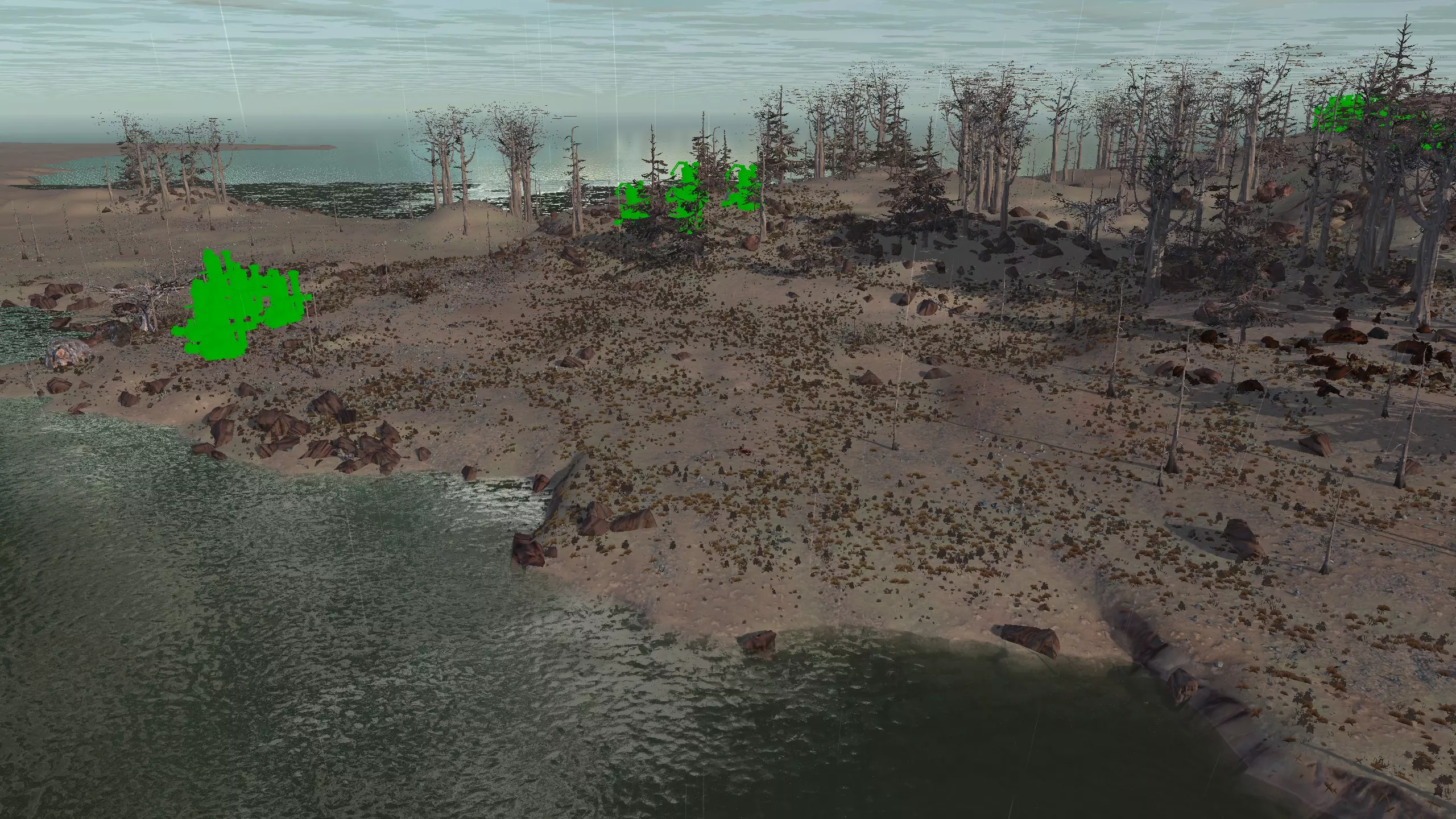 描述:你所有的资源都可以整齐地存放在这个小小的迷你山谷中。然而,你很快就会发现,敌人和任何想进入山谷的人都可以轻易地翻过周围的山丘进入。这些山丘都可以轻松翻越。因此,上面截图中的墙壁代表了我建议的【实际城镇】应处的位置,你可以将资源存放在城墙外部。或者干脆建在其他地方。 资源:100%铁、50%铜、100%石头、80%水源、100%绿地、50%干旱地 危险:食人族袭击、喙嘴兽、如果你惹恼利维坦的话它们也会出现。紧邻食人族平原边界,但可能距离食人族小队有点远,不一定能看到。 特别说明:“资源山谷”后面的山没什么用。别费心了。 2-N) 无海岸,北海岸 无海岸 1)