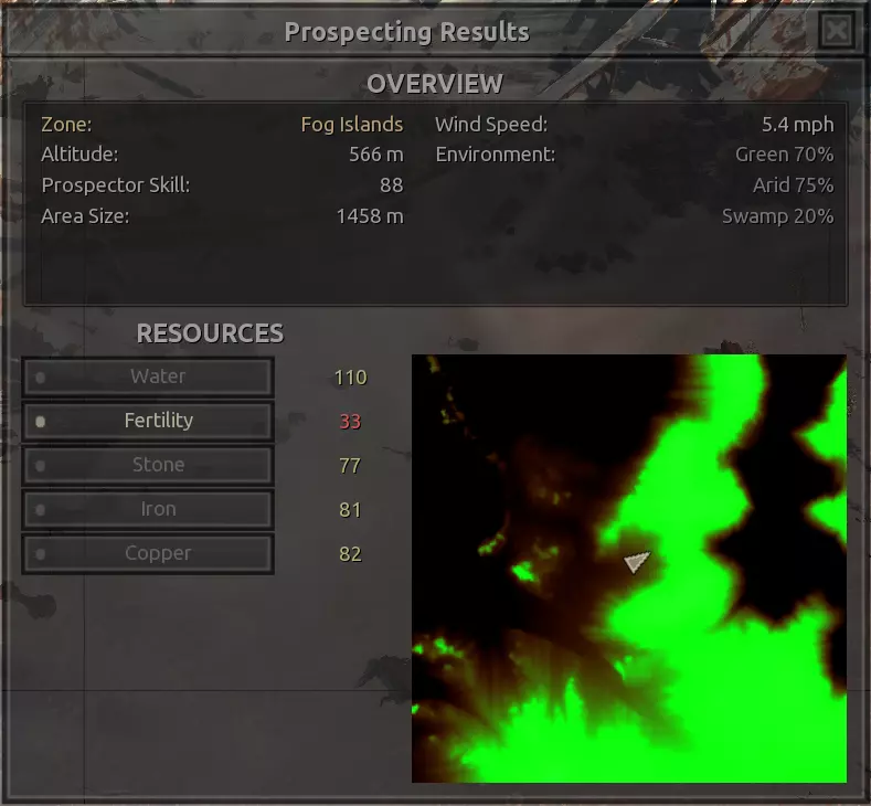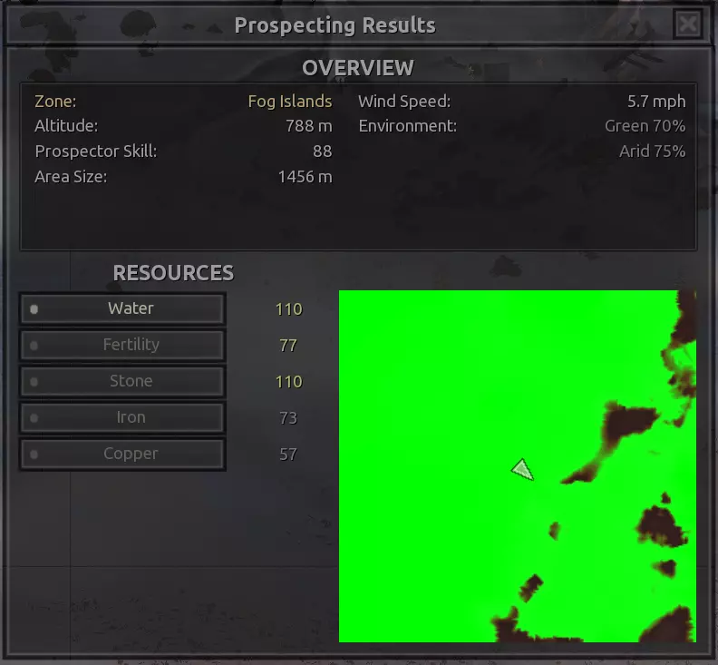 我也把这个区域推荐给《洪泛之地》玩家,因为你的大部分资源都会集中在洪泛之地一侧——不过,这里大约50%的区域同时也是隐藏森林。奇怪的是,几乎整个区域都非常肥沃,除了仙人掌和稻草外,其他所有作物都能以100%的肥力和100%的产量种植。这里有足够的空间来灵活调整矿石钻头的位置,但铜矿石只有一个节点。 需要注意的是,这里的石头有点难找,山上有80%的石头资源,但我找不到放置矿场的方法。山下可能有60%的石头资源。 这里不是建造大型全功能基地的最佳区域,因为有很多水域和斜坡,但如果你不介意建造倾斜的建筑,这里还是可以满足需求的!或许适合作为《漂泊者》的休息站之类的地方。 资源:100%铁,100%铜,40-80%石头 危险:铁蜘蛛、食人族,可能还有尘埃强盗或祈祷日?骨犬??? 雾岛 注意:雾岛的各种资源异常丰富。如果你真的想在这个区域内几乎任何地方建立基地,那么我只指出最值得注意的地点。 1)