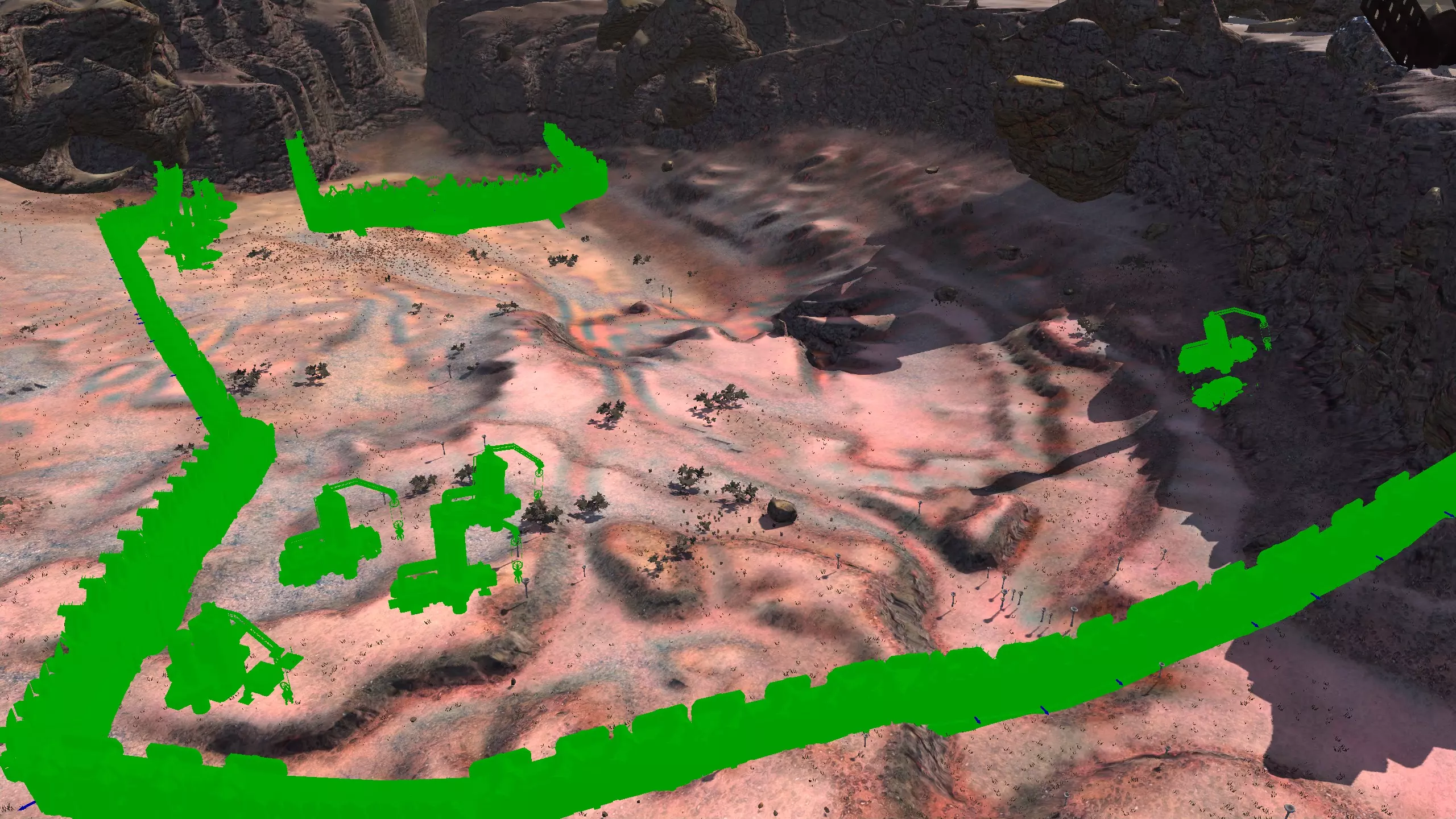 描述:一个整洁但狭窄的小峡谷。这是我发现的少数几个真正被妥善封锁的地点之一,除了入口外没有其他通路。无需担心敌人从你身后的悬崖上下来!那里没有任何可通行的路径。这也意味着,在紧急情况下,当神圣国度猛攻你的大门时,你别无选择,只能坚守阵地,努力活下去。 唯一的问题是,这里的建造空间非常小。在上面的截图中,你可以看到我在最里面放置了四个铁矿钻机、两个铜矿钻机,在靠近入口的地方还有一个 stone drill(石材钻机),所有这些都需要非常精确的摆放。我还放置了一些建筑作为比例参考,让你大致了解需要如何摆放建筑才能容纳所有设施。你可能需要【无斜坡】模组来帮助你在崎岖不平的地形上建造。 资源:90-100%铁,约50%铜,70%石头,60%水,100%肥力 危险:沙尘土匪、饥饿土匪、祈祷日、食人族袭击,还有可能遇到沙克族税收巡逻队。