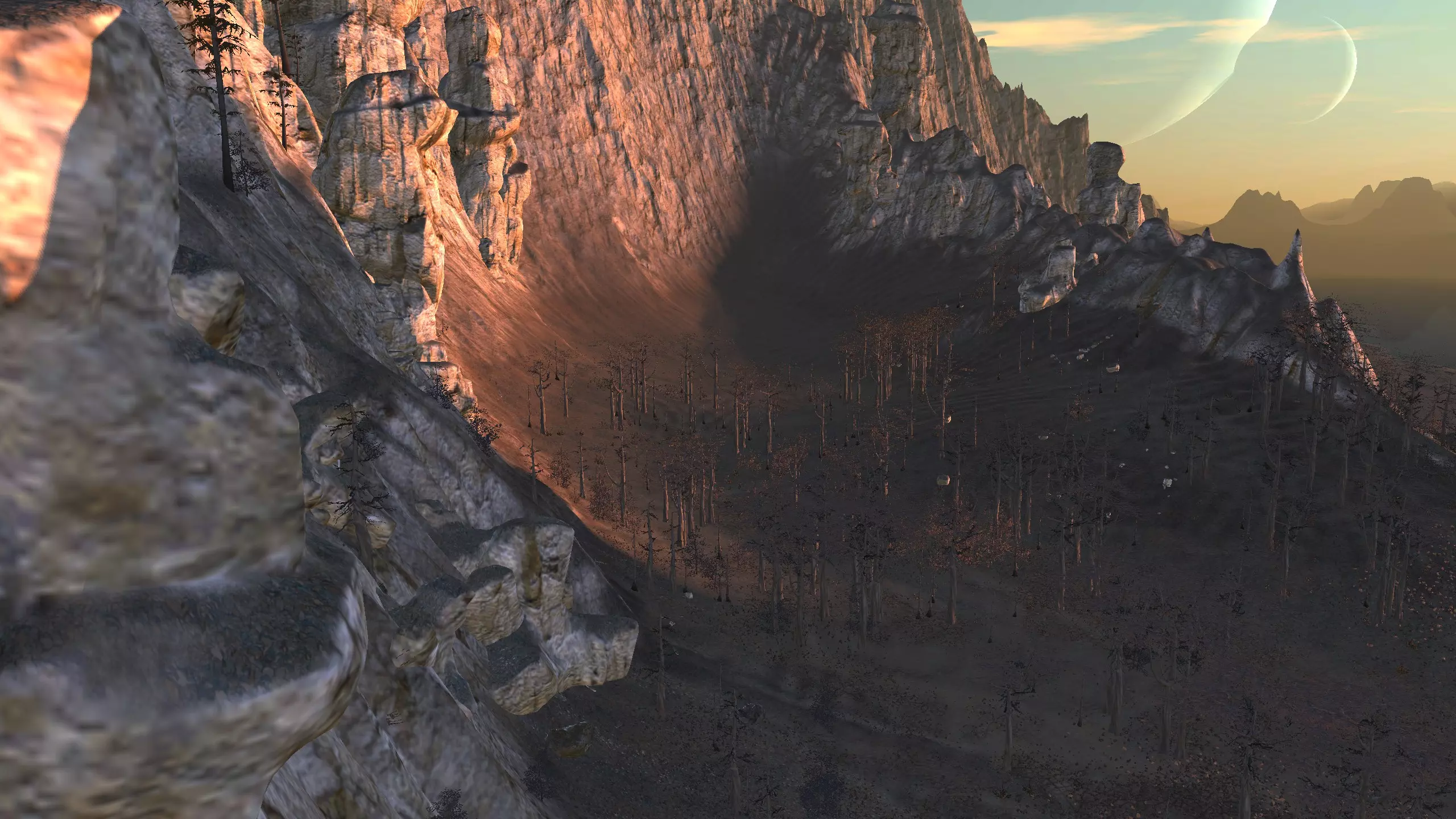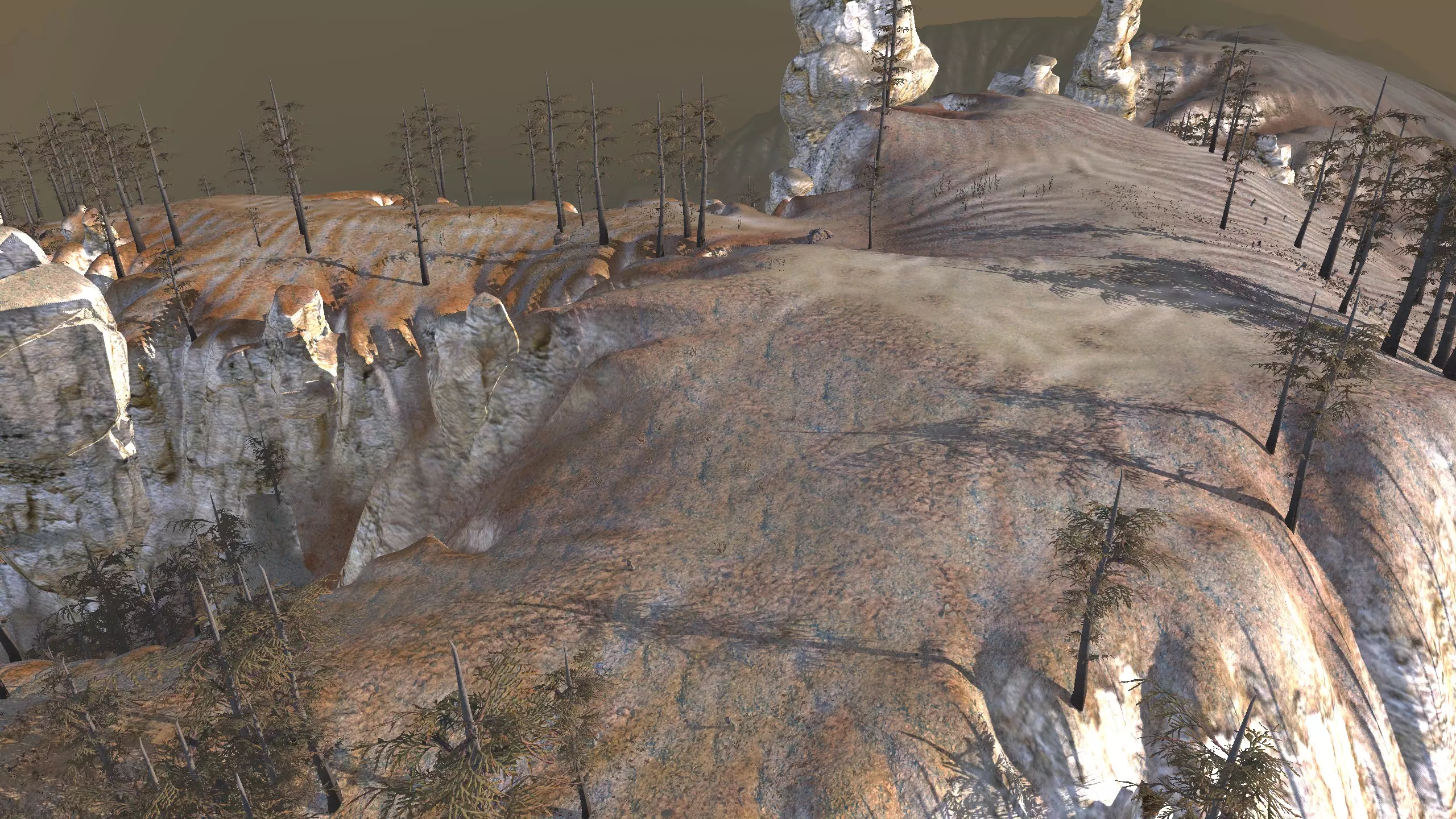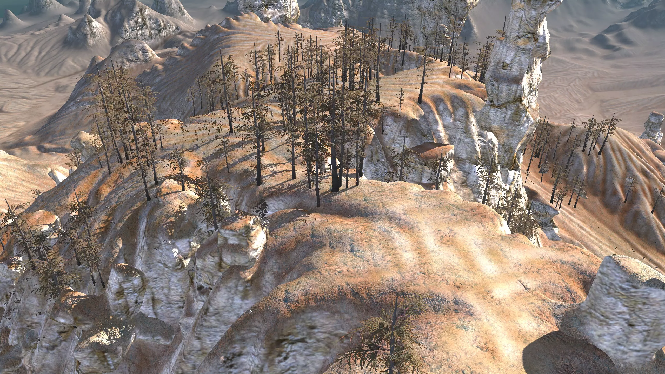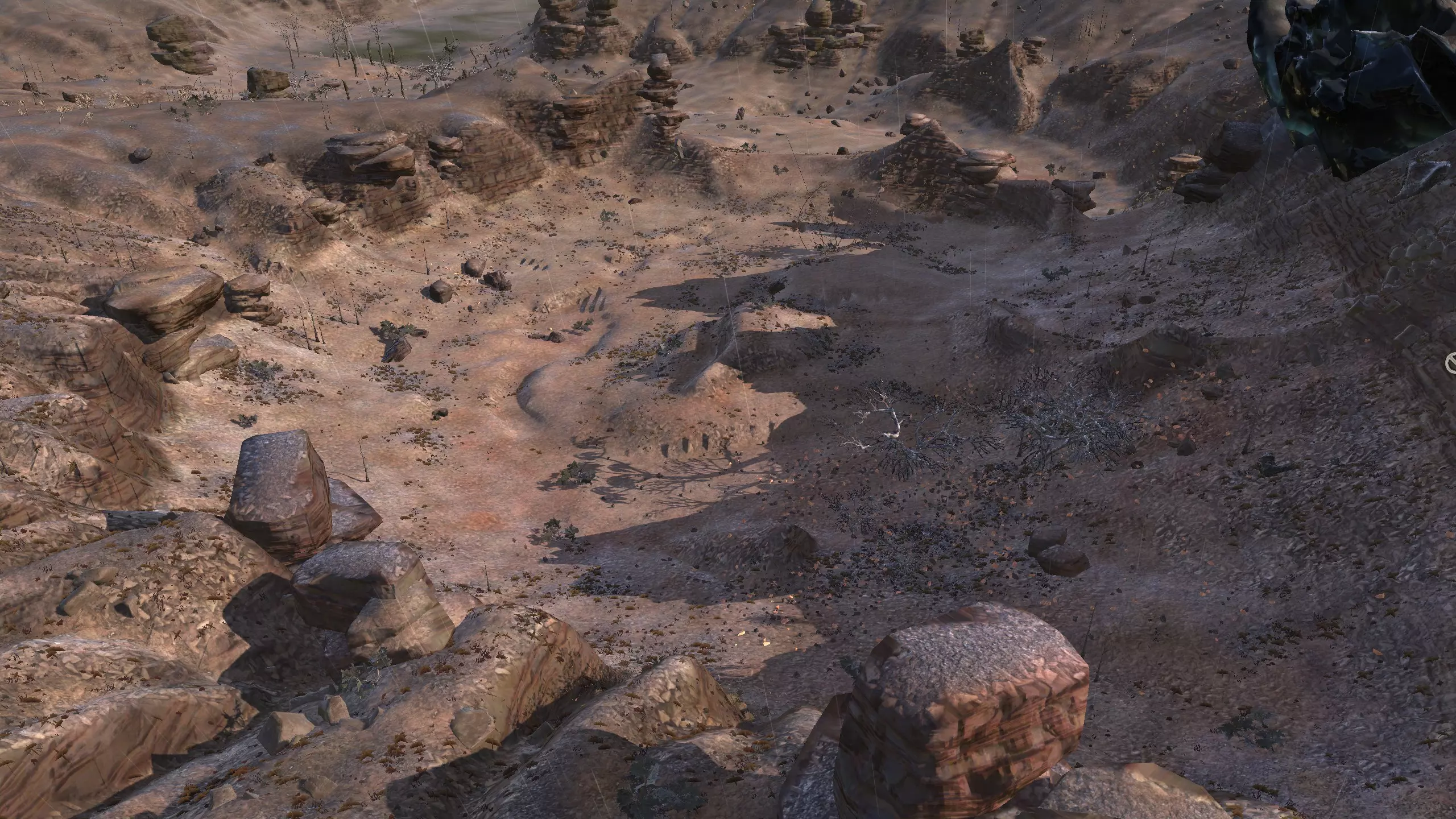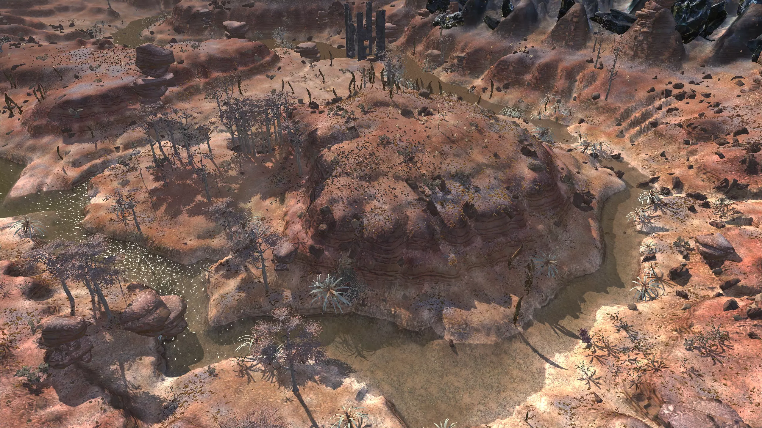 严格来说,这里算不上一个真正的希姆基地位置,但它属于希姆地区,而且严格意义上不在复仇谷。它就在边境线上,你在这里的头几天可能会感到不安,但只要你不往山下走,【应该是安全的】。 不管怎样,这个地方值得一提,因为它看起来有点奇特。你不仅有【大量空间】,还有一条清晰可见的道路,你可以围绕这条路建造基地,而且如果你愿意,这里的高原很容易完全用墙围起来。我不知道你会在这里看到多少旅行者,但我确实看到一些双剑骑手在这条路上活动。 这里的水源条件很差,你可能需要【高级 moisture farming】来解决用水问题,而且为了种植作物,还需要水培技术,所以要注意这一点!资源:60-70%铁,60-70%铜,90-100%石头,10%水,0%肥力 危险:喙嘴兽!骸骨军团,沙尘土匪袭击,饥饿土匪,血蜘蛛。