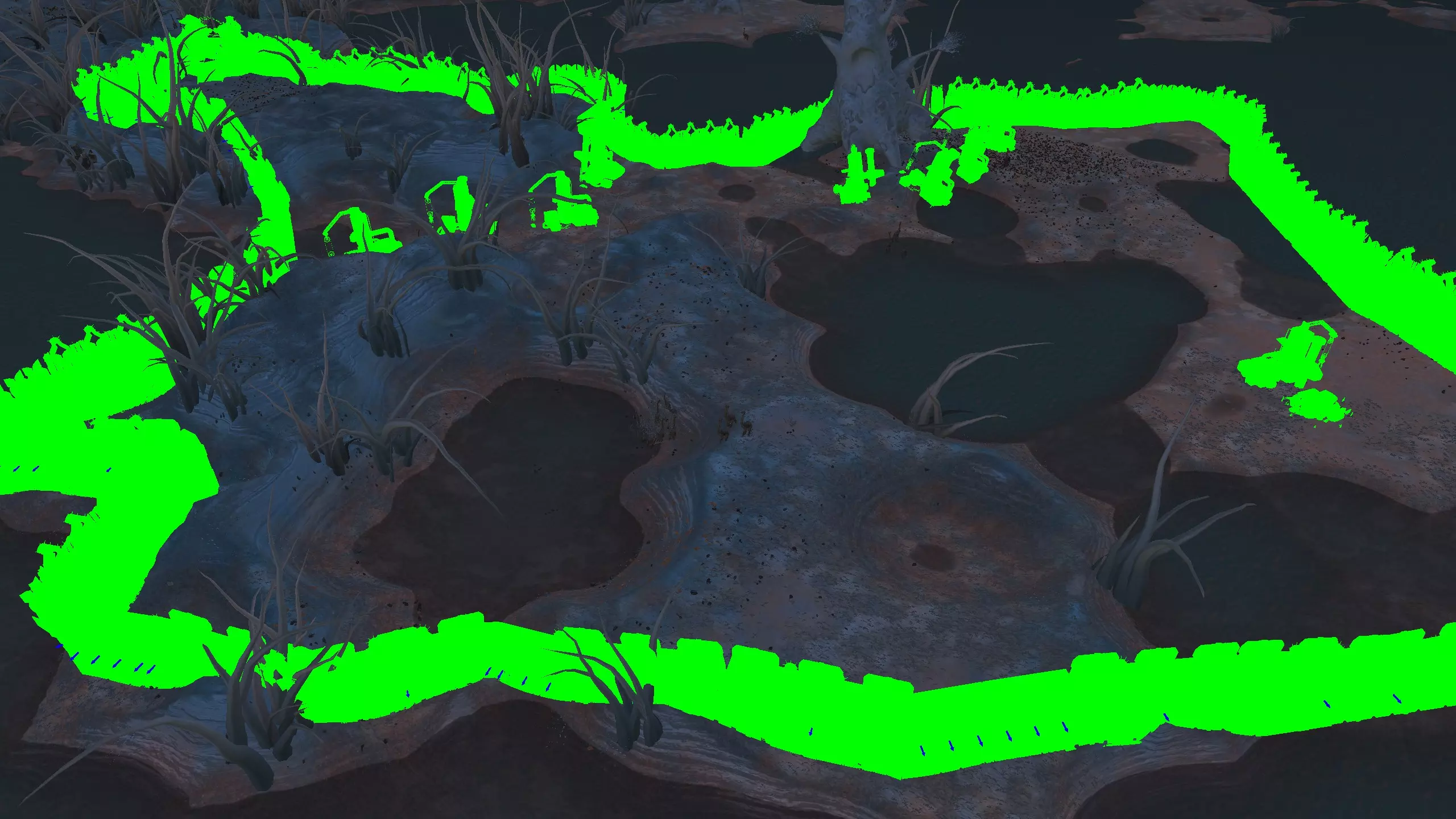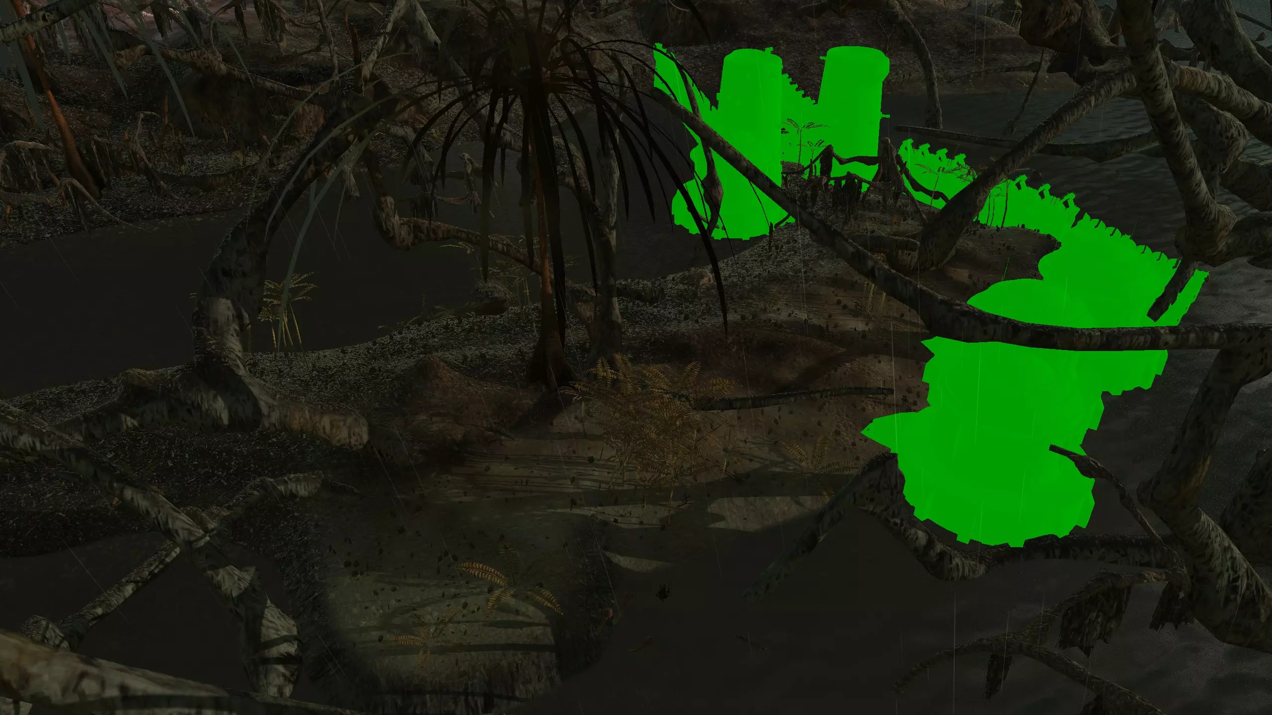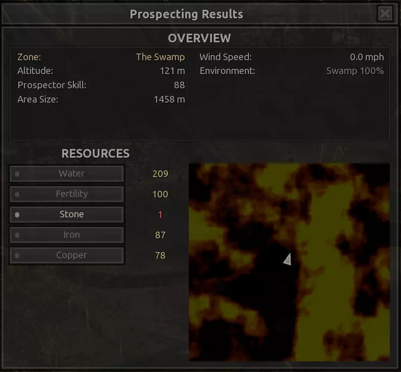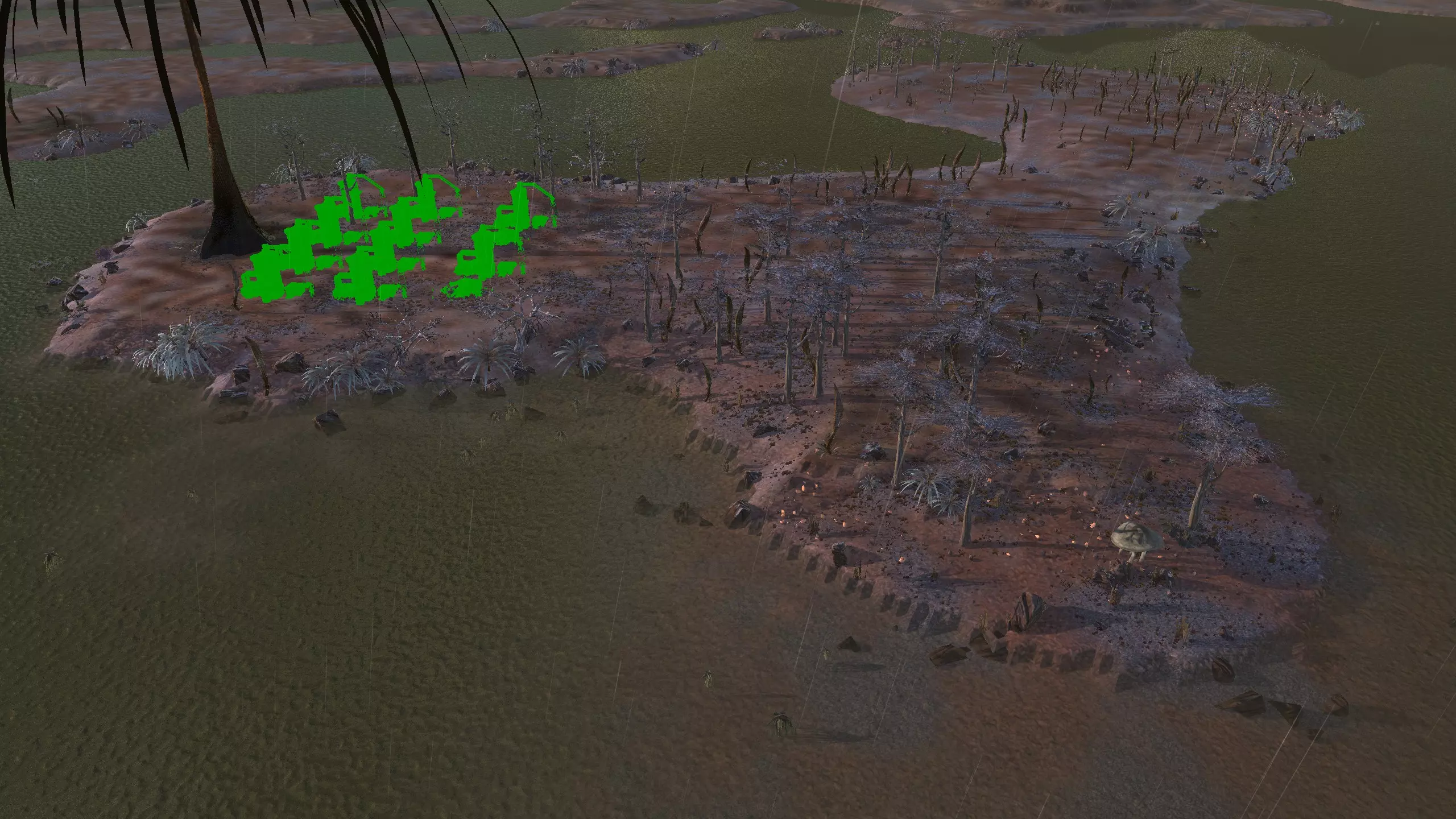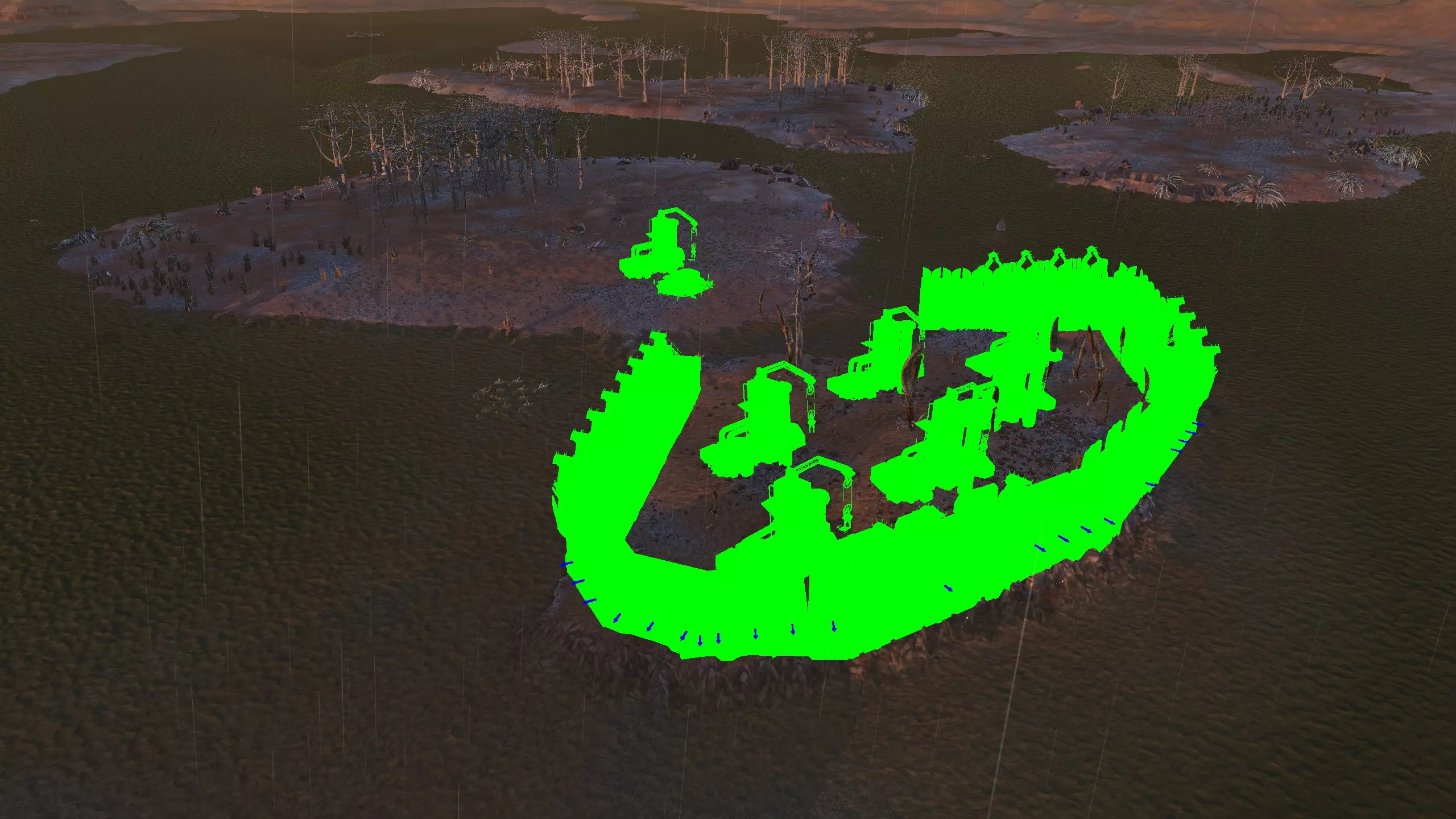 这里堪称整个游戏中最不适合建造基地的地点,但这里的资源确实非常丰富……除了肥力。因此,你需要水培设施才能在这里建造基地,但值得一提的是,这里仍有100%的水资源。在右侧的小山谷中,每个钻井可获得约80%的铜矿,但如果没有钻井,你甚至无法开采矿石节点,所以对于没有模组的玩家来说,完全不必考虑这个地点。 高效,但丑陋。 资源:100%铁矿,80%铜矿,100%石料,100%水资源,无肥力 危险:尖叫土匪?食人族?可能还有来自顺从之地/洪泛地的铁蜘蛛……?以及因为选择在这里定居而自我厌恶?特别说明:我绝不会在这里建立基地,但你至少可以在截图中看到的“铜谷”以及尖叫森林的入口处设置一些不错的 choke point(卡点)。 2-S) 沼泽 沼泽 注意:沼泽区域存在严重的帧率问题,可能比《剑士》中的任何其他区域都要严重,经常会出现加载暂停,而且大量的植被对建造来说极其麻烦。因此,我强烈建议不要在这里定居。可以考虑本指南中列出的南湿地地点。 以下是一些沼泽区域的地点。 1)