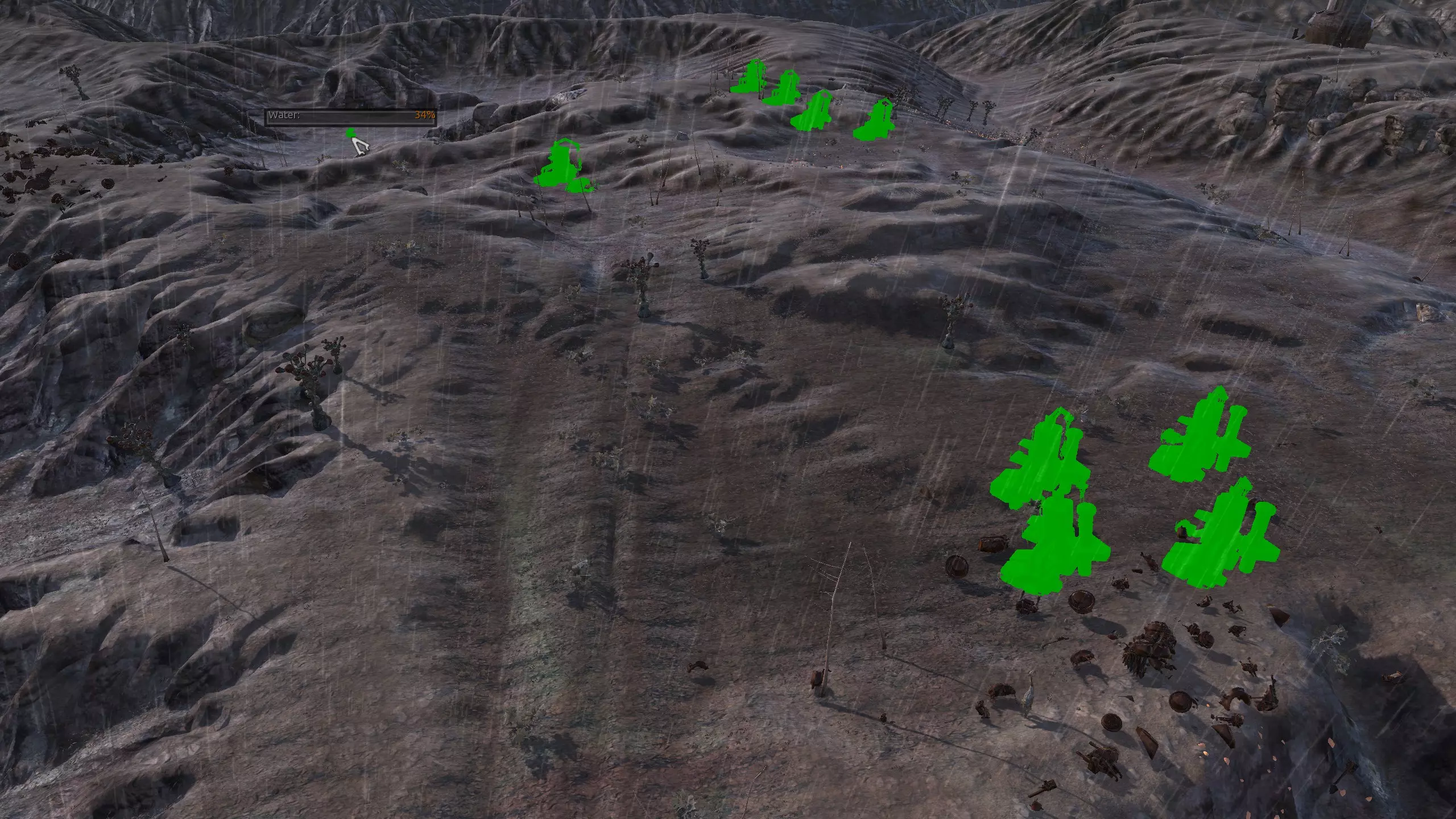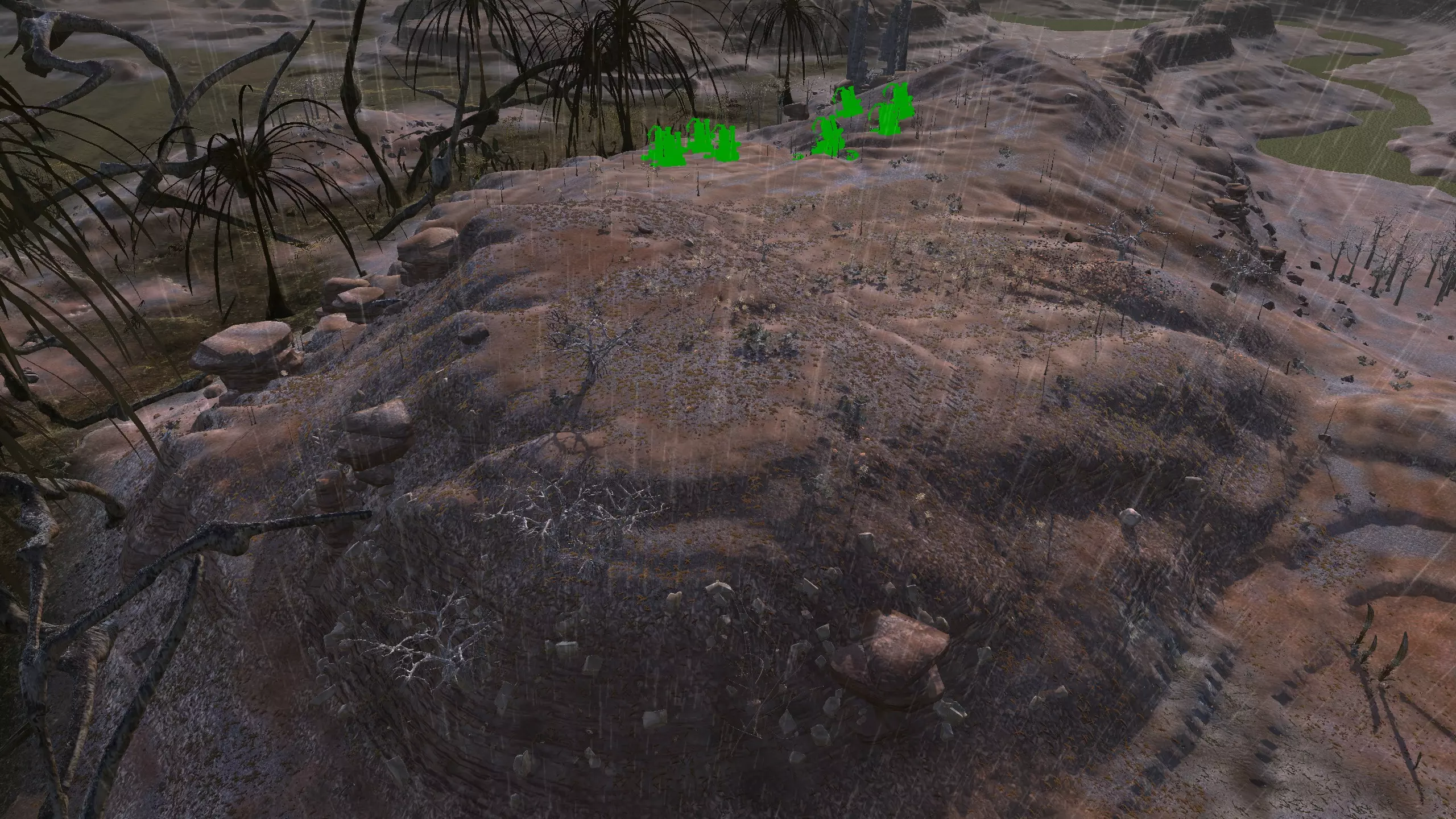 如果你对这份清单上的某个地点有印象,那很可能就是这里。这个地点相当有名,因为当你在网络上搜索“剑士基地位置”时,它是人们谈论最多的地点之一。这是有充分理由的:这里资源齐全,地处一处不错的高地,易于防御;周围全是雾人,所以如果食人族来袭,你会很安全,而且其他派系也基本不会来打扰你。 不过,这也可能是把双刃剑,因为有时候我真的会因为几乎不用担心敌人袭击而感到无聊。雾人甚至不会组织起来攻击你。另外,这里的水质很差,但如果把水井建在中间,能获得30%的水量,这还不算太糟。资源:90-100%铁,90%铜,100%石头,10-30%水,100%肥力 危险:雾人!食人族袭击。
