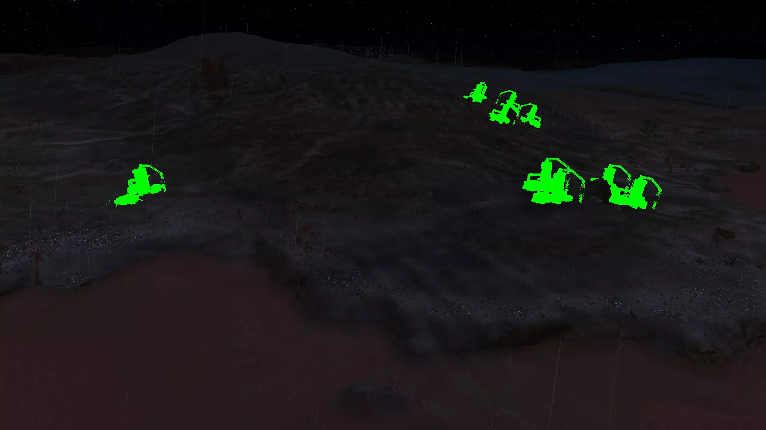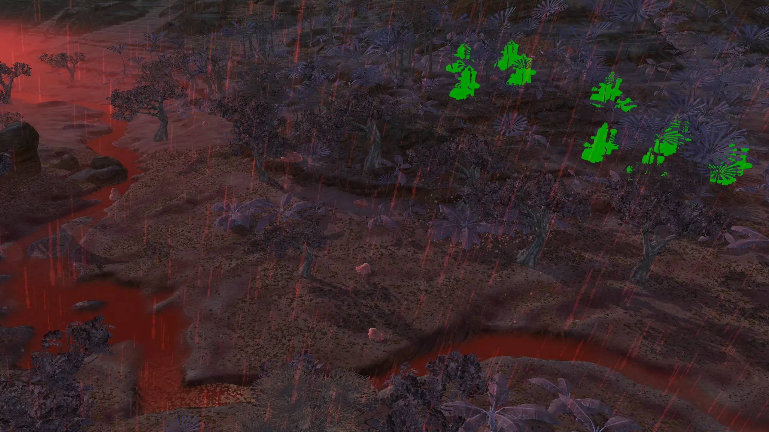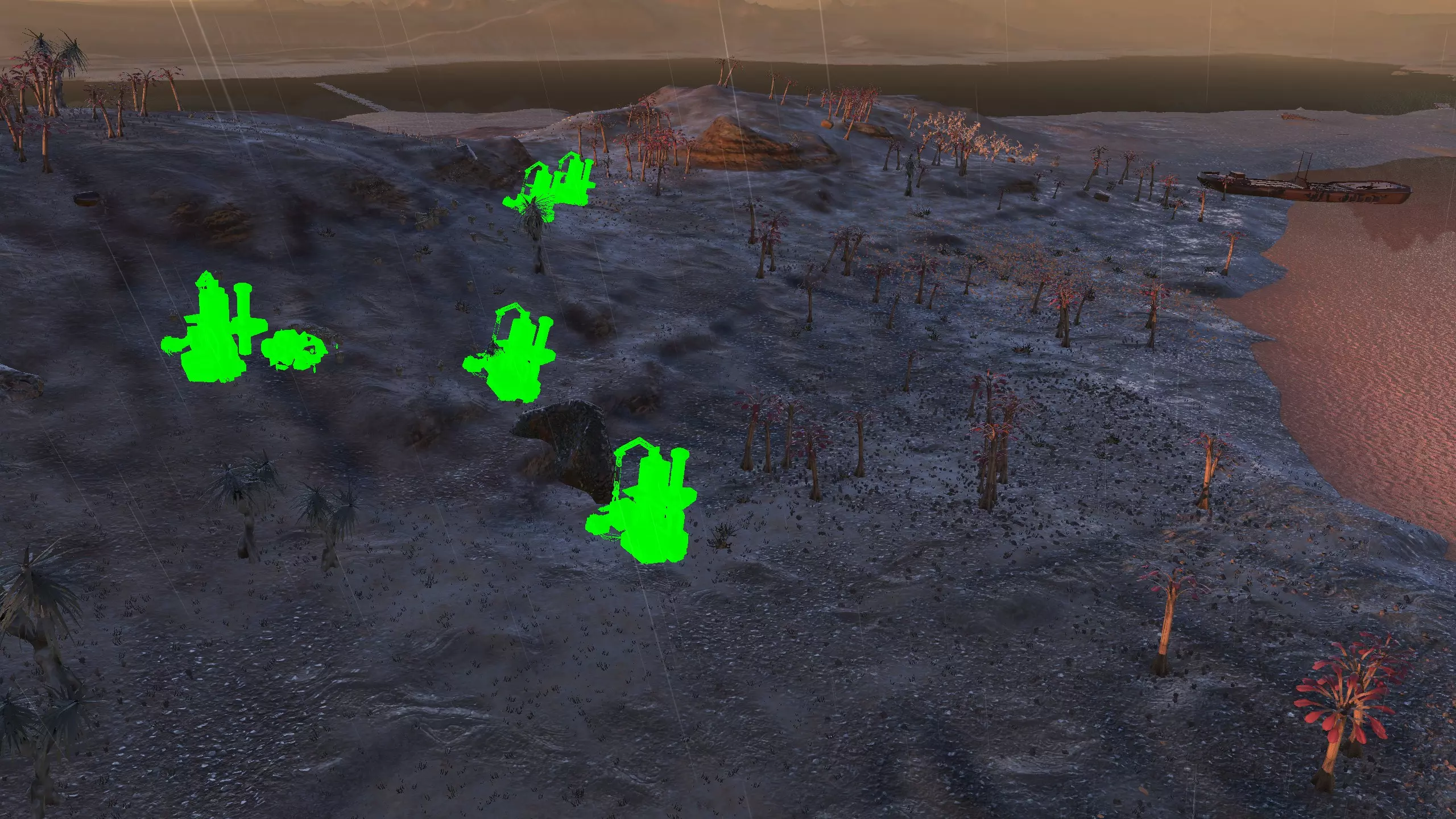 这破岛不怎么样,但嘿,如果你有【无坡】能力,或许可以把建筑建在水上,让门口通向陆地,这样就能多出不少空间。我甚至觉得没必要建墙,只需要一些炮塔就行,而且在周边小岛上建一两个瞭望塔应该是最好的办法。要注意的是,这里所有的水都是酸性的,所以你可能需要在岛屿之间建造桥梁(用墙壁代替),并希望你的角色会走桥,或者……至少尽量避免长时间涉水。 这个岛和其他一些岛屿不同,它有一些资源。但遗憾的是,这里没有铁和铜,所以你需要【深层钻探】模组才能让这个地方真正派上用场。如果能让你稍感安慰的话,至少其他所有东西都能通过正当途径获得,你可以种植食物、获取水源,还能找到优质石材。 资源情况:铁0%,铜0%,石材80%,水源90-100%,土壤肥力93% 危险:酸雨、食人族袭击,我还在这里看到了一些喙嘴兽…… 2-V) 复仇之地 复仇之地 警告:复仇之地对除了骷髅之外的所有种族来说都是极度危险的区域!人类、谢克族和蜂巢族在此地将面临严重危险。如果你只是要穿越这个区域,建议你在夜间尽快通过。 如果你已经探索过复仇之地并知晓了它的秘密,并且非常想在这里定居,我建议你阅读以下剧透: 你可以在复仇之地安全建立基地,但需要放弃两个装备栏位。你的人类、骨人(Shek)和蜂巢族(Hiver)角色每人都需要一件装甲兜帽和一件防尘大衣(总防护值105%)。这通常会将在复仇谷(Venge)建立基地的时间限制在游戏后期,那时你至少有能力按需制作、购买这些装备,或者组建一支完全由机械族(Skeletons)组成的基地小队! 其他可行的装备组合包括蟹型突袭者套装(蟹型装甲+蟹型头盔=110%防护值),或者无袖防尘大衣搭配蟹型头盔(120%防护值),所以你确实有一定的灵活性。但如果你希望能完全自由地穿戴任何装备,或者正尝试为你的派系设定统一制服,那么复仇谷可能不适合你。考虑到以此为基地的“好处”,我个人是愿意接受这种取舍的,毕竟至少防尘外套和装甲兜帽搭配起来本身就挺有吸引力的。