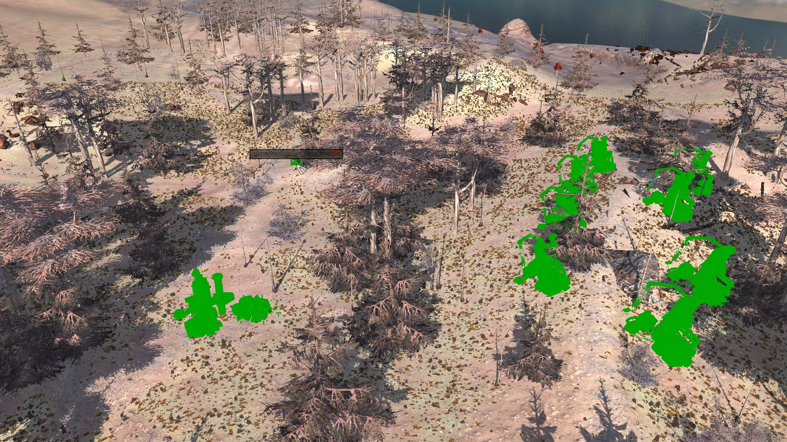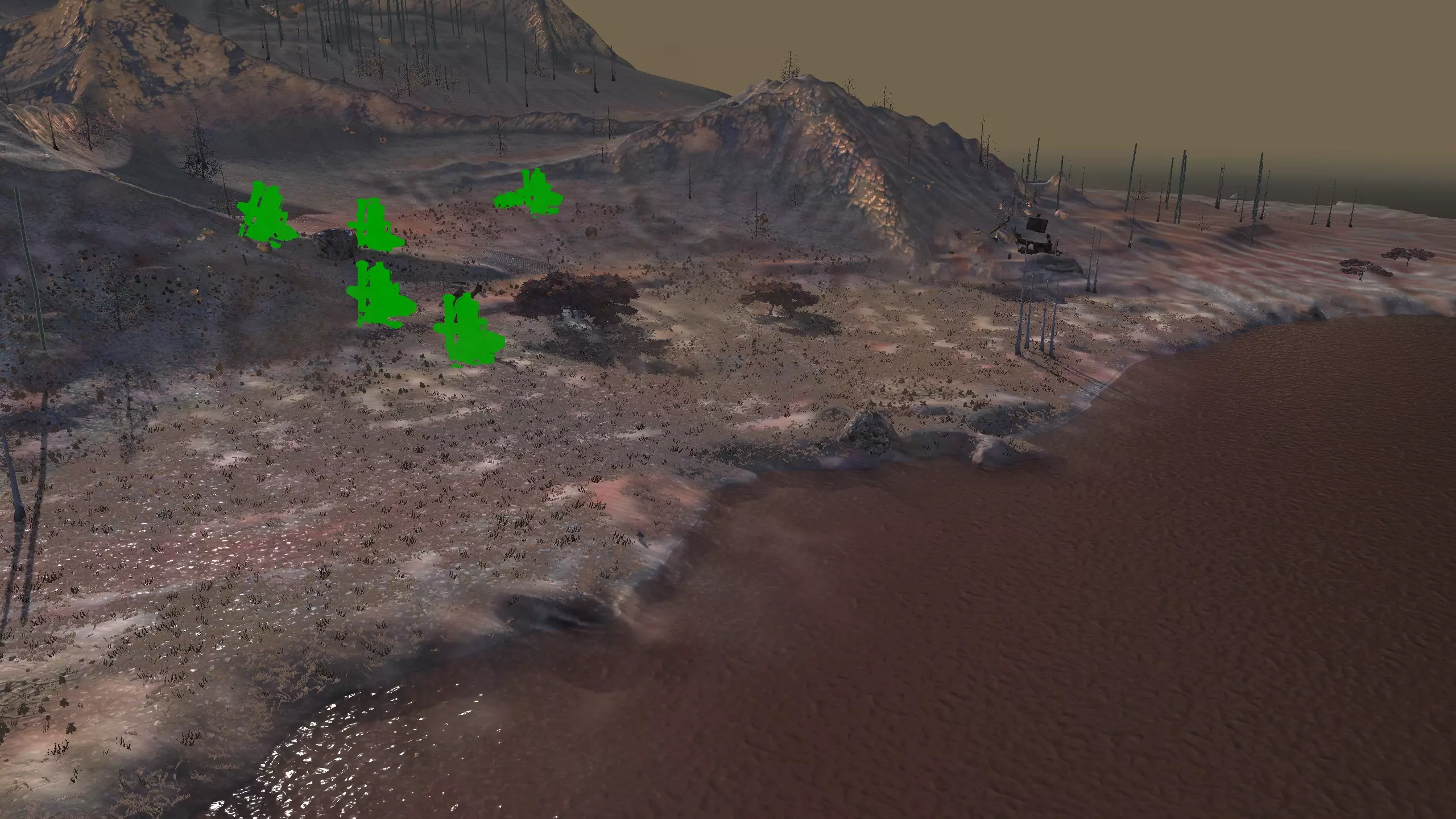 描述:这个地点还不错。没什么特别的。看!这里有污水,有资源,而且你至少可以……把基地的大部分区域用墙围起来。河边的水源是最好的,山上的水源很差。你还能要求什么呢? 资源:90%铁,90%铜,80%石头,80-90%水源,93%肥沃度 危险:喙嘴兽,食人族袭击,大猩猩。