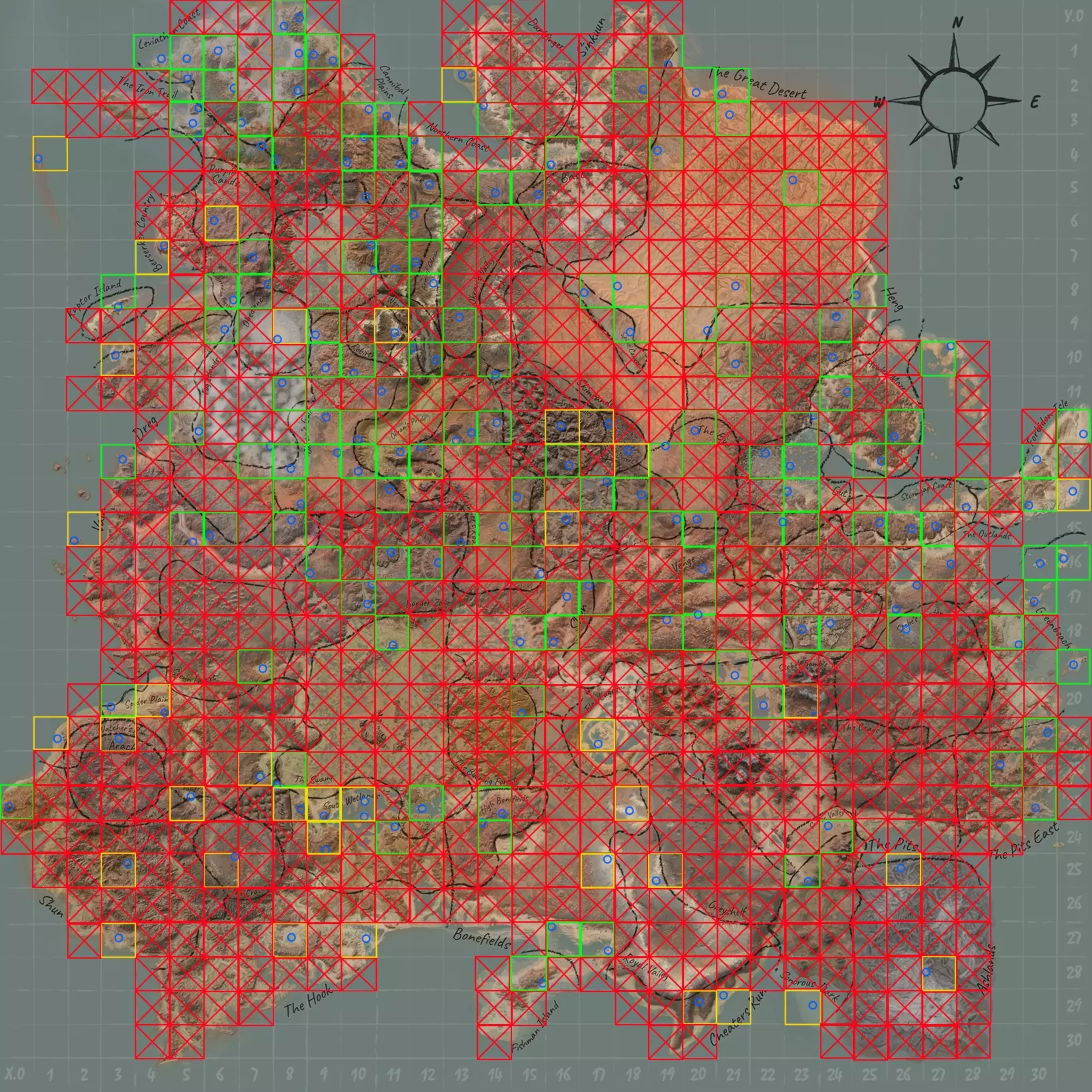 我开始编写本指南是因为我对基地建造地点的晦涩难懂感到沮丧。Steam论坛、Reddit以及其他地方有无数帖子,都在问“我该在哪里建造”以及其他类似的问题。为了社区,我决定整理这份指南。 有必要以某种方式对区域进行分组,因为区域实在太多,我不想让侧边栏变得更长。因此,我最终决定按字母顺序进行分类(与Valve在Steam库中对游戏进行字母排序的方法类似,“the”不被计算在内)。例如,你可以在C类下找到The Crags,在S类下找到The Swamp。出于必要,部分内容已被拆分成多个部分,因为我不断遇到字符限制。 为简洁起见,本指南不会列出游戏中所有可放置建筑的平坦区域,因此我制定了以下入选条件: 1. 该区域必须能获取水、石头、铁和铜资源。 2. 肥力为可选条件,但无肥力的地点将标记为仅适合骷髅/水培种植。 3. 即使资源匮乏,具有战略或美学意义的区域也可能被纳入。 4. 该区域不能给电脑带来过大负担,或在开始建造前仅移动镜头或角色时就需要过长的加载时间。这些规则中的大部分可能看起来都很明显,但说到第四条,我制定这条规则的原因是,如果你曾经亲自建造过一个非常大的基地,里面有很多角色、很多建筑以及其他各种东西,你可能已经知道,一个足够大的基地本身就会降低你的帧率,而且你建造的东西越多,加载所需的时间就会越来越长。 我自己的电脑配置相当不错,但即使在低画质设置下,并且使用了压缩纹理项目模组,我仍然需要花费大约20-30秒等待游戏加载,然后走5秒钟,之后在穿越沼泽时又要再次加载。因此,像【沼泽】和【燃烧森林】这类区域在本指南中几乎不予考虑,不过我还是对它们进行了考察。 简而言之,如果一个地方无法建立自给自足的长期基地,那它至少必须是一个防御性极强的地点,或者仅仅是足够有趣。 我会尽力为每个地点包含三张不同的图片:一张用于在地图上标注位置,一张展示【勘探】读数,还有一张是该地点的截图,其中包括矿场的位置,因为矿场通常是任何建造中最固定的部分。1-1) 内容贡献 此外,如果你有任何基地位置的建议,欢迎在评论区或其他方式告诉我。你可以使用类似Nice Map的网格坐标来提供准确信息。该工具无需下载,通过预览截图即可查看,其中X代表行,Y代表列。例如,X17 Y21大致是 flats lagoon的位置。如果建议符合本指南的收录条件,我会欣然添加并注明发现者。 1-2) 关于模组 本指南仅适用于《剑士》原版游戏。如果你使用了修改世界中资源分布的模组,那么实际结果显然会与本文所述内容大相径庭——不过,或许你仍然能从这些地点本身找到价值。 为了完全公开信息,我自己确实使用了几个模组,但其中只有两个会以任何方式改变世界中的资源: 【模组1】和【模组2】,它们的影响程度相当轻微。我还使用了【模组3】。实际上,一旦解锁某个功能,资源的可获取性就会发生些许变化。因为单个铜矿节点可能就完全够用了,不像原版游戏那样需要手动开采,还可能无法满足需求。 本指南末尾会简要添加一个可选的模组推荐部分,帮助你开放一些较为荒凉的区域,以便使用。 1-3) 所有地点的地图概览 在这里你可以看到本指南目前包含的所有地点的概览。 在整理本指南时,我需要某种方式记录所有已检查过的不同地点等信息,这促使我创建了……这个“庞然大物”。它不是特别美观或完美,但确实起到了作用。你可能不需要它来寻找各个地点,但它或许能帮你精确定位。 显然,这些地点都没有编号,而且我也不会给它们编号。我不仅不会这么做,如果你真的感到困惑,通过排除法也应该能弄清楚哪个是哪个。 总之,希望这张地图……有趣、有用,或者两者兼具。另外,再次感谢Djeeska制作了“Nice Map”。 地图图例: 蓝色圆圈 - 基地位置(具体细节如下) 红色叉号 - 无值得建造基地的位置 黄色方块 - 仅在模组帮助下才能实现自给自足 绿色方块 - 网格参考区域内至少包含一个值得注意的基地位置