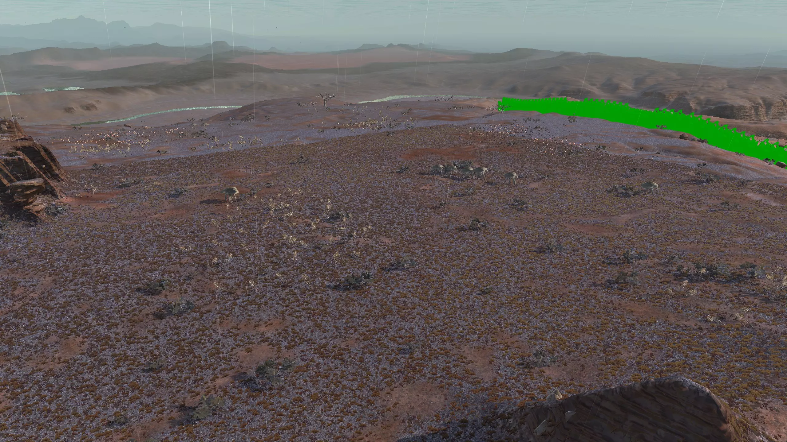 六连击!这里的资源再次糟糕透顶,这次连水都不行,因为海拔太高了。不过,我必须提一下这个壮观的地点。它看起来非常奇特和独特,感觉像是某种bug,整个高原完全平坦,俯瞰着附近蜿蜒的河流,而且位置足够高,你可以看到雾气等在附近的地貌上方盘旋。 你需要【深层钻探采矿】和【强化湿度 farming】才能获得所需的所有矿物,也才能真正获得水源。你也可以在东边的山下建造,但考虑到如果你选择在这里建造,基地将会非常大,你可能不会想这么做。城墙外的水井或许不会造成严重问题,这由你决定。你拥有大量空间,所以或许可以建造大约40口水井。只要对你有用就行! 如果你需要空间来建造一座宏伟且布局整齐的巨型城市,那就动手吧。 另外请注意,附近的城墙是【Clownsteady】禁建区的标志。它正好位于高原边缘,所以不必过于担心!它不会带来麻烦。 资源:0% 铁,0% 铜,50% 石头,10% 水,77-100% 肥力 危险:沼泽忍者、红色军刀、血蜘蛛、UC事件、河流迅猛龙,可能还有喙嘴兽?2-S) 蜘蛛平原 蜘蛛平原 注:在勘察蜘蛛平原后,我意识到该区域的绝大部分是极为平坦的高原,确实是“平原”,非常适合建造。然而,资源往往不足以使其上榜。下面我仅记录了发现的最有趣的地点。 如果你是模组用户(主要是深层钻探采矿模组),并且想要一个漂亮、平坦、极为开阔的空间来建造巨型城市,你应该亲自在这个区域四处看看! 1)