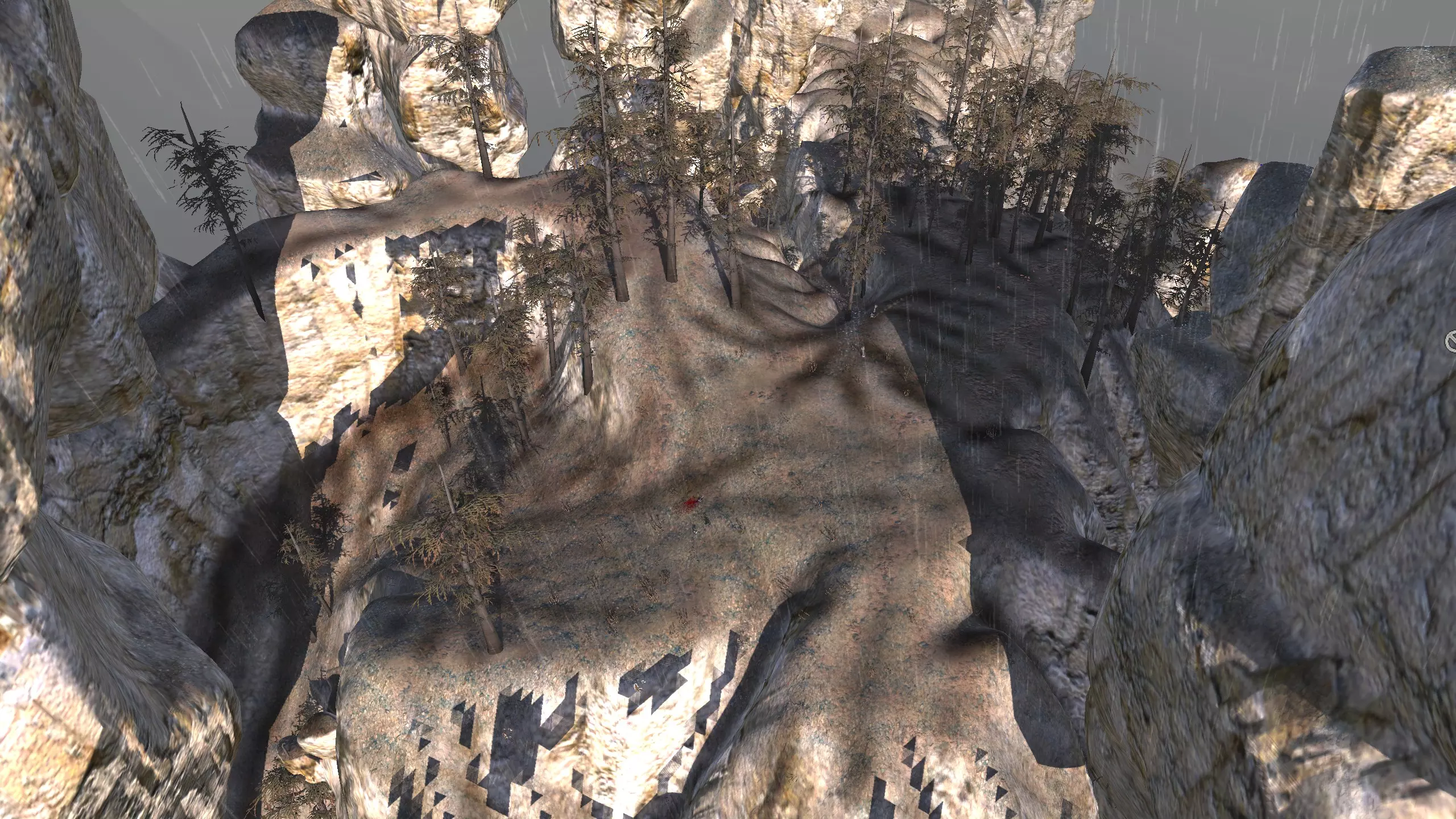 这个地点之所以很棒,有很多原因:这里有大量的铁矿和铜矿,除了稻麦草外几乎可以种植任何作物,但我怀疑这里的持续降雨只是视觉效果,并不会真正浇灌你的庄稼。不过这里的水资源有80%,所以问题不大。你甚至还有一些平坦的地形。这里距离世界尽头、浮木镇和装甲之王都很近,有一条路可以直接通往 Wend 的入口。还有一处坚固的悬崖,你可以把墙壁连接到上面。唯一的麻烦是这里的石头含量有50-60%,不是最理想的。 食人族应该是这里唯一会袭击你的敌人,他们很可能会从北方过来,而你在北方有足够的空间建造防御工事。 我越看这个地点,就越喜欢它。它看起来不是很惊艳,但满足了很多要求。 资源:100%铁,50%铜,50-60%石头,80%水,100%绿地,50%干旱地 危险:食人族……?可能有洪泛区蜘蛛或骷髅? 2-C) 作弊者小径、峭壁、火山口 作弊者小径 1)