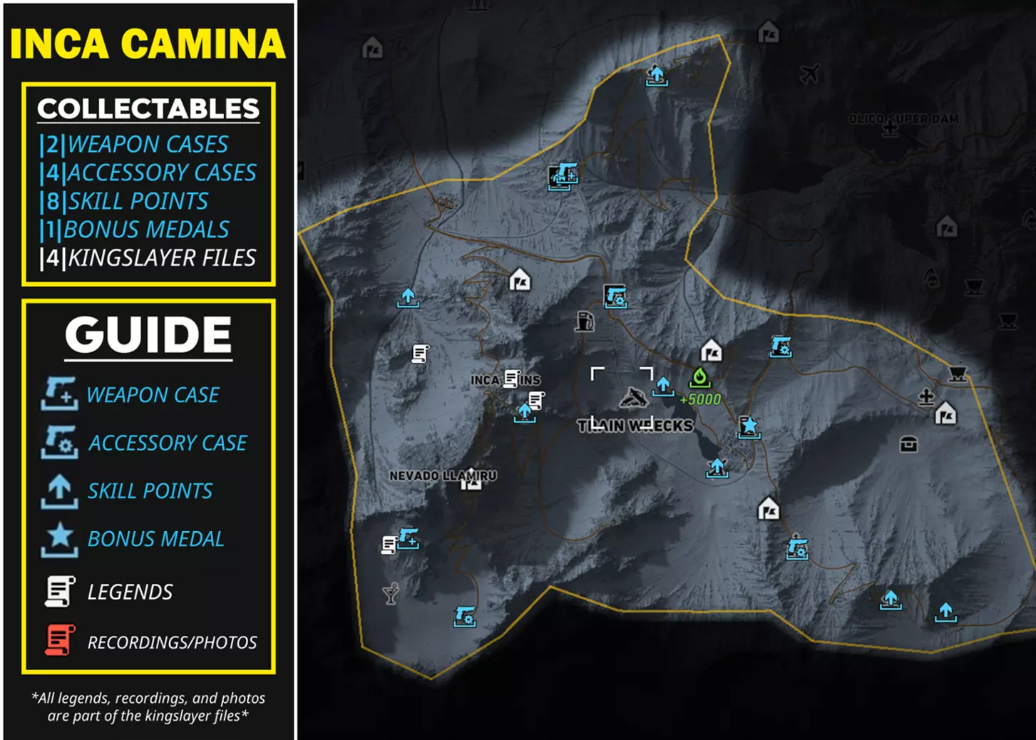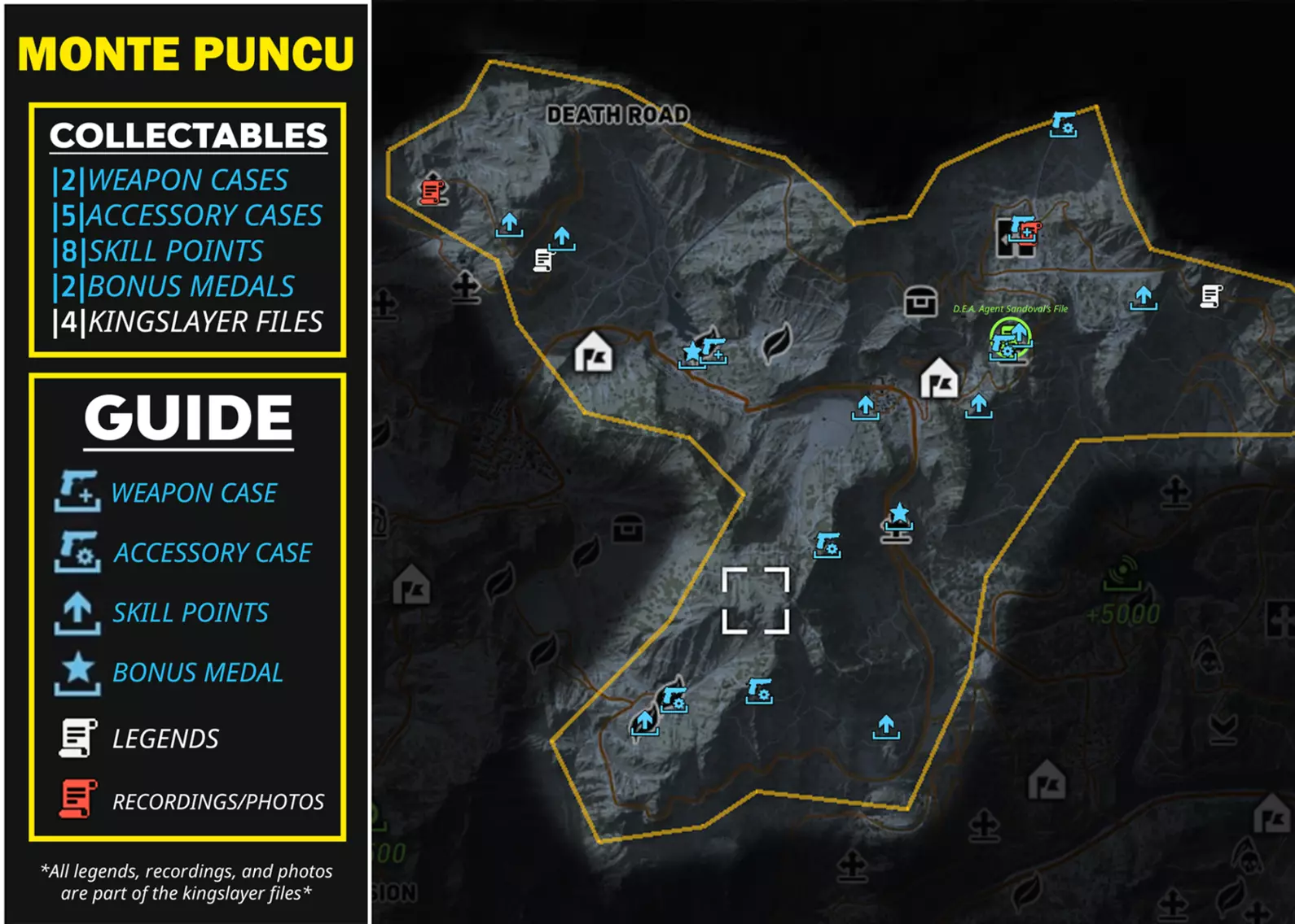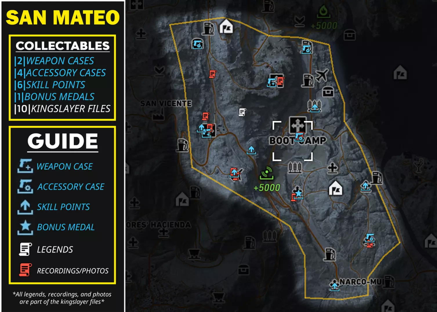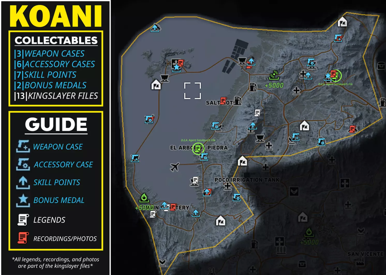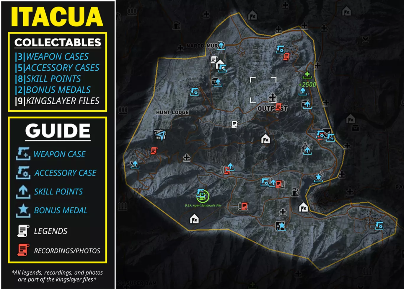 武器 805 Bren A2(突击步枪) 德拉贡诺夫(SVD)(狙击步枪) M9(手枪) El Cuentista(霰弹枪)【仅在击败El Wey后获得】 配件 短款枪托(突击步枪枪托) 6x35弹匣|30发|(冲锋枪弹匣) 9x19弹匣|25发|(手枪弹匣) 俄罗斯红点(瞄准镜) 技能点 +1技能点(共5个) +3技能点(共2个) +5技能点(共1个) +5技能点【仅在击败El Wey后获得】 奖励勋章 冷却时间(减少8秒冷却时间) 载具破坏(对载具伤害提升20%) Kingslayer档案 传说(共3个) 录音/照片(共7个) 非区域收集品 不在区域内,只能通过游玩剧情获得的收集品 武器:Silencio!(霰弹枪)【击败埃尔·苏埃尼奥】 技能点+7 技能点【击败拉·普拉加】 +7 技能点【击败拉蒙·费利斯】 +7 技能点【击败拉·格林加】 +7 技能点【击败埃尔·博基塔】 +10 技能点【击败埃尔·穆罗】 +10 技能点【击败埃尔·卡德纳尔】 +10 技能点【击败埃尔·亚约】 +10 技能点【击败妮迪亚·弗洛雷斯/选美皇后】 +10 技能点【击败埃尔·苏埃尼奥】 猎杀国王文件 12份猎杀国王文件(完成行动后获得1份)【完成“神谕行动”】 7份猎杀国王文件(自动获得1份)【完成“无声黑桃行动”】 桑多瓦尔探员文件录音(标题:桑多瓦尔的自白)【击败所有4名主要贩毒集团头目并完成瑞奇·桑多瓦尔的第2个任务】 杂项物品 随着剧情推进获得的物品这些不是收集品。外观 艾尔·普尔波的帽子(帽子)【击败艾尔·普尔波】 拉·普拉加的帽子(帽子)【击败拉·普拉加】 赎罪(纹身)【击败艾尔·塞雷布洛】 DJ佩里科(纹身)【击败DJ佩里科】 军刀疤痕(面部细节)【击败艾尔·加托】 深切割(面部细节)【击败艾尔·韦伊】 金色太阳镜(眼镜)【击败卡齐塔】 飞行员太阳镜(眼镜)【击败波士顿·里德】 骷髅头巾(面具)【击败拉·桑泰拉】 卡维拉的手套(手套)【完成“大天使”行动】 沃克的手镯(手套)【完成“神谕”行动】 沃克的纹身(手套)【完成“神谕”行动】 孤狼(服装)【完成“神谕”行动】 其他 未来战士(降落伞)【完成“寂静黑桃”行动第1个任务】 光学迷彩(背包)【完成“寂静黑桃”行动】 总结 希望本指南对您有所帮助正在使用!