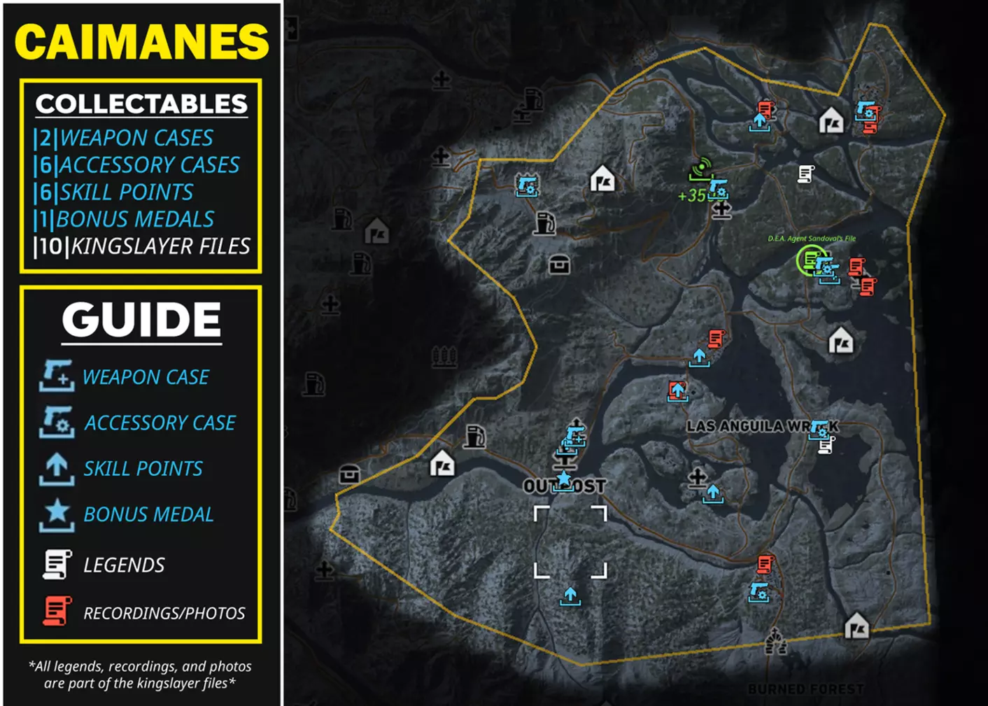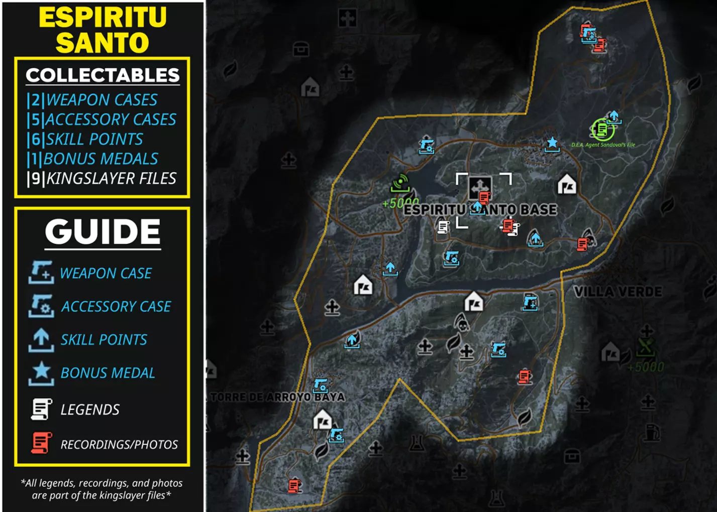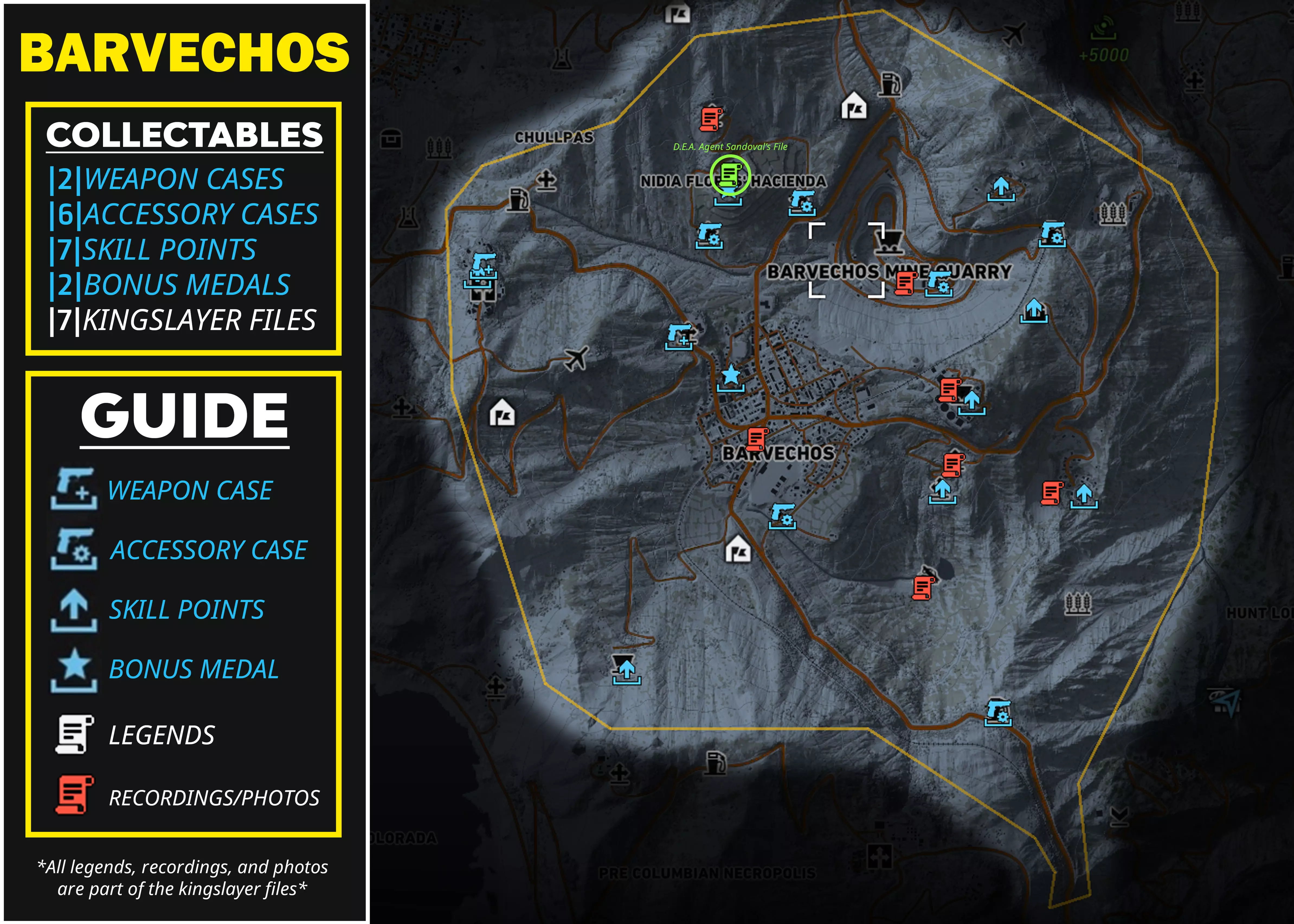 本指南提供了游戏内所有区域中每种可收集物品的信息和详情,供你收集。其中将列出所有武器、武器配件、技能点、勋章、弑君者文件,甚至里基·桑多瓦尔文件,并标明它们的位置和类型。希望本指南对你有所帮助! AGUA VERDE