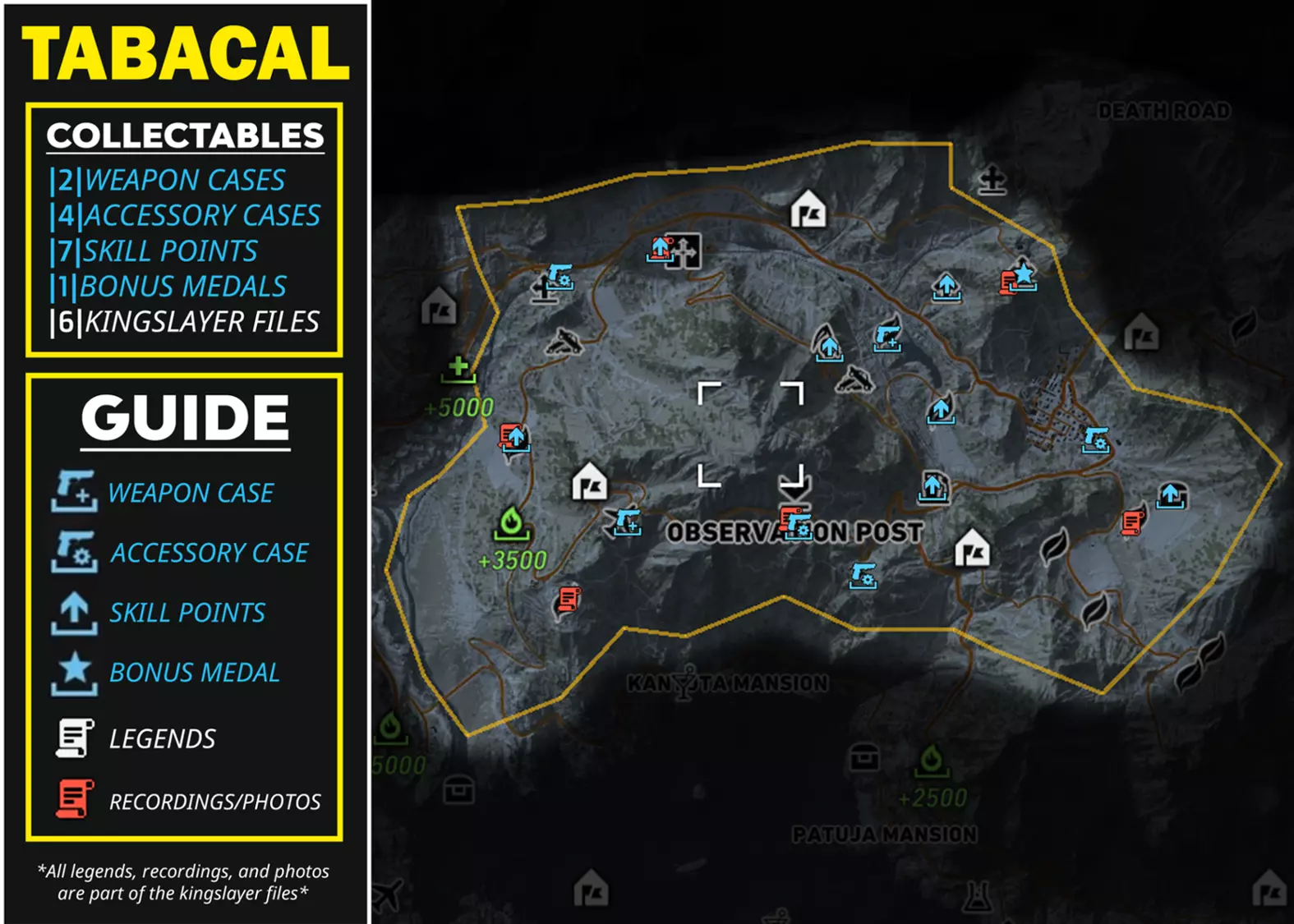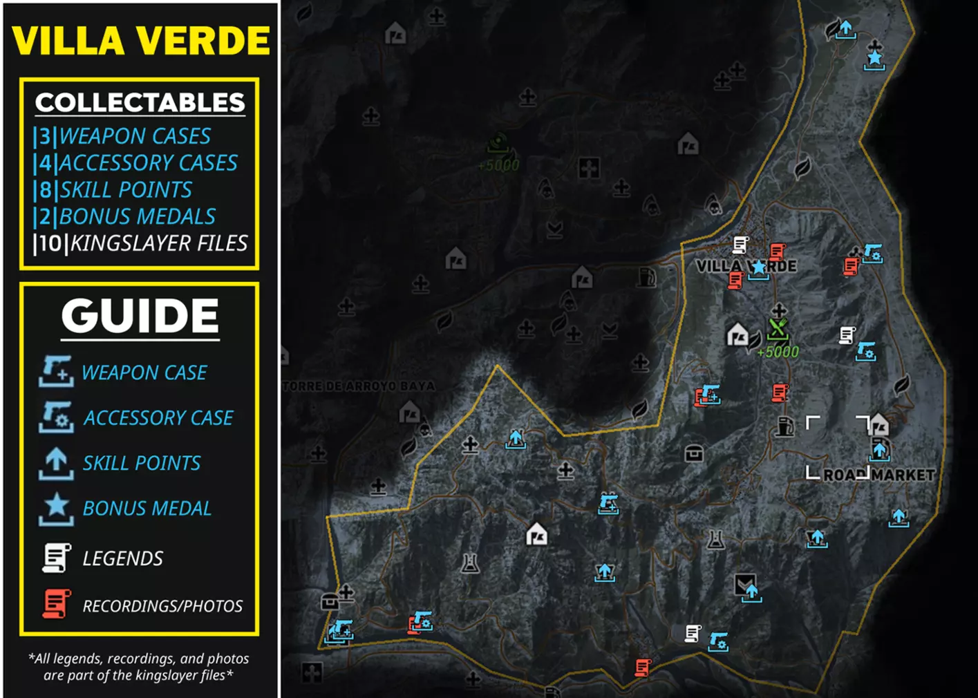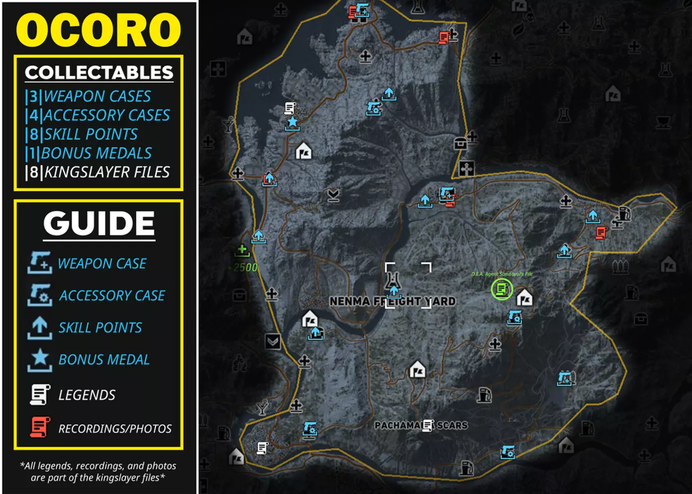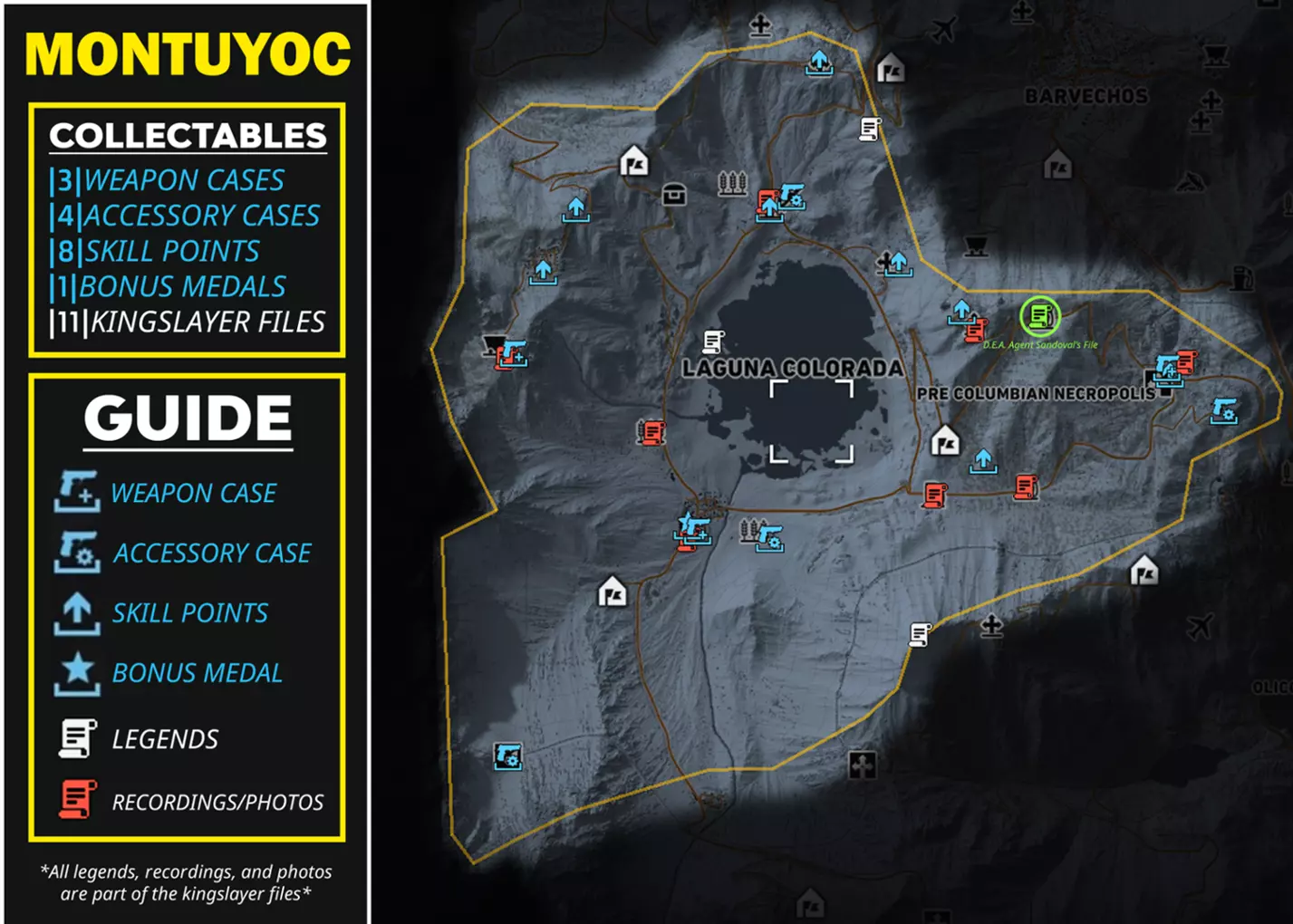 本指南提供了游戏内所有区域中每种可收集物品的信息和详情,供你收集。其中将列出所有武器、武器配件、技能点、勋章、弑君者文件,甚至里基·桑多瓦尔文件,并标明它们的位置和类型。希望本指南对你有所帮助! AGUA VERDE