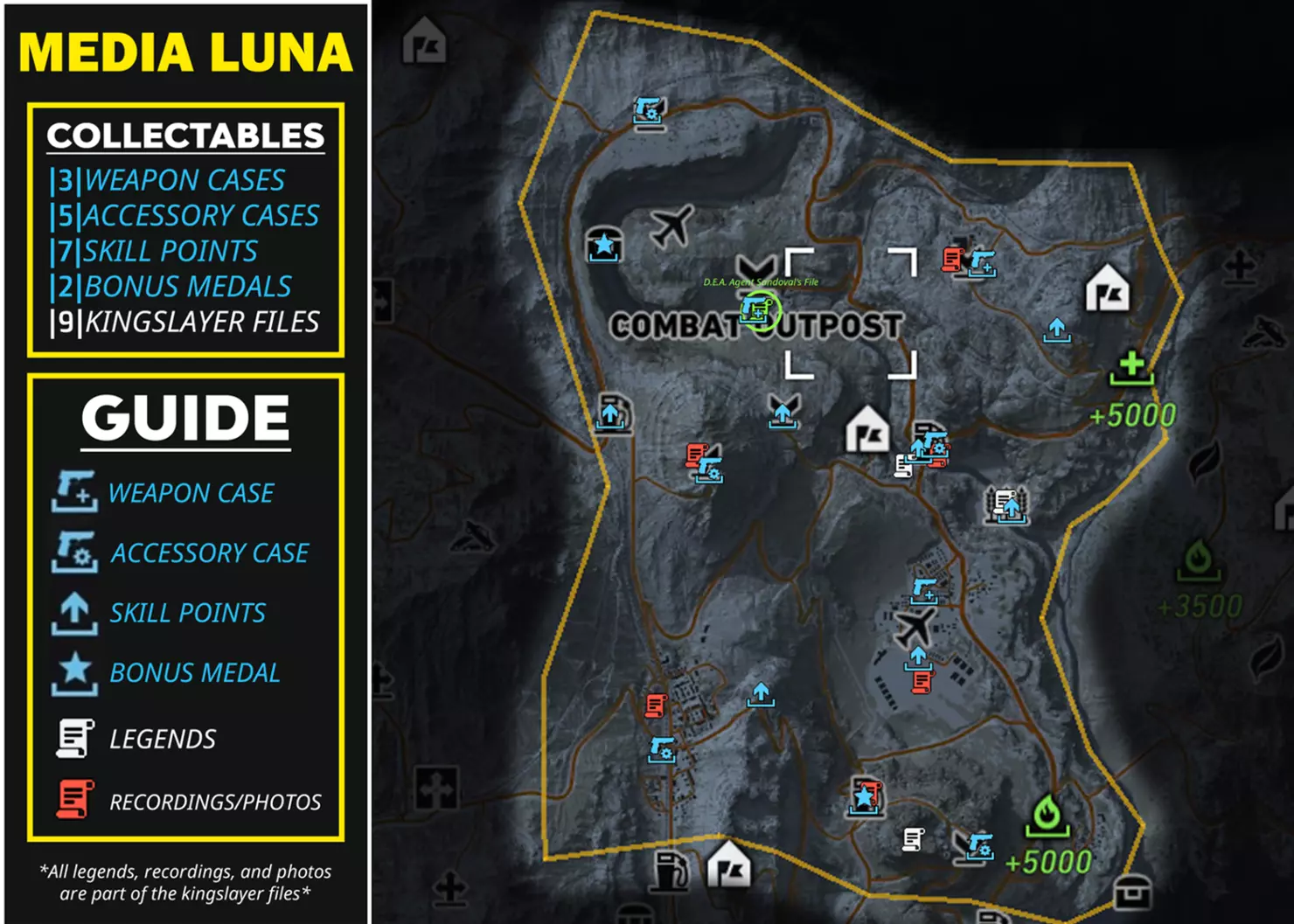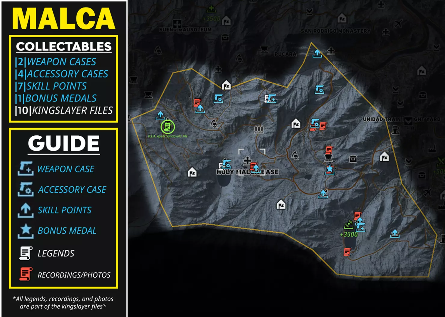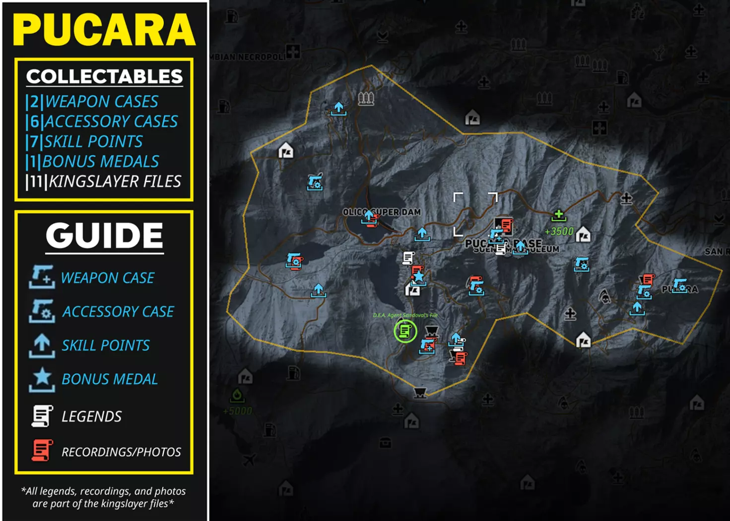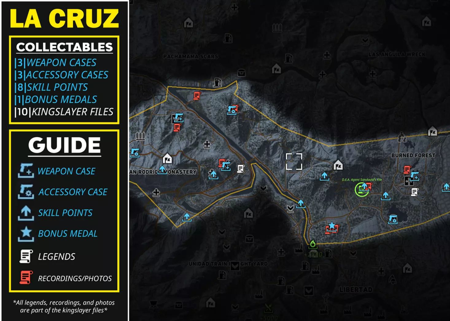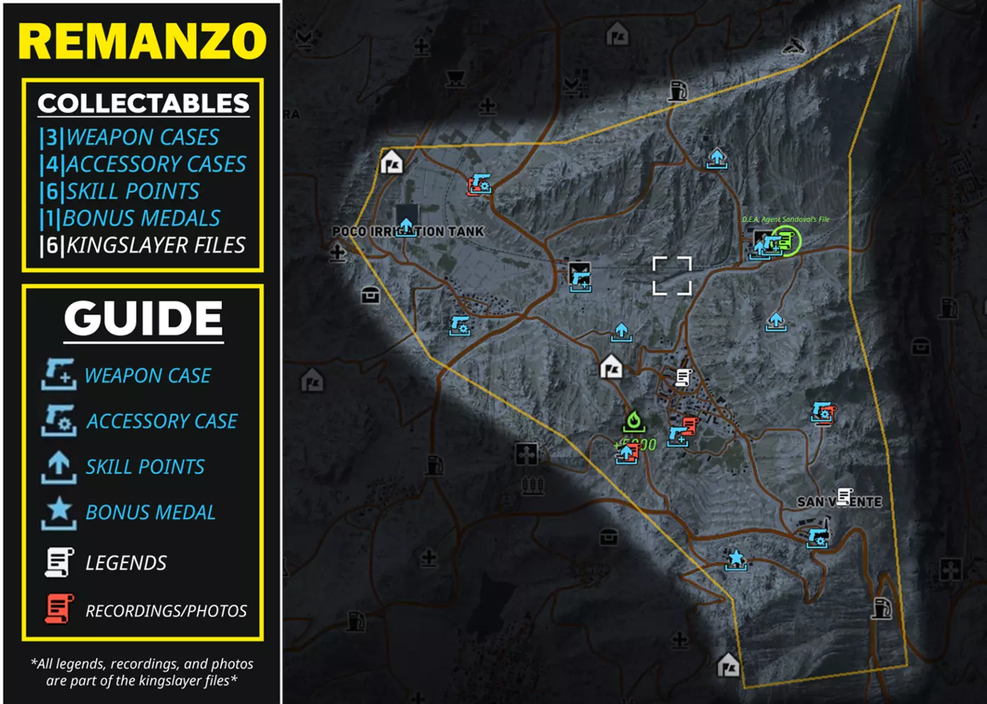 武器 5.7 USG(手枪) M1911(手枪) SR-635(冲锋枪) The BFF(手枪)【仅在击败El Emisario后获得】 配件 补偿枪托(狙击步枪枪托) CompM4(瞄准镜) ATPIAL激光瞄准器(冲锋枪导轨) 5.7弹匣|30|(手枪弹匣) 技能点 +1技能点(共5点) +3技能点(共2点) +5技能点(共1点) +3技能点【仅在击败El Emisario后获得】 奖励勋章 地雷(额外增加1个地雷) 帝王杀手文件 传说(共3个) 录音/照片(共5个) 桑多瓦尔探员文件录音(标题:El Sueno的谈判) PUCARA