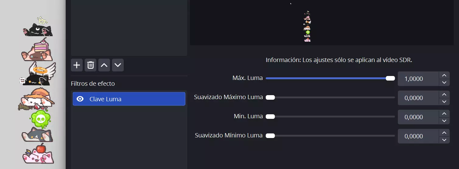 替代方法2 - Luma键(仅在其他方法失败时使用) 备用选项 这是一种替代方法,其中游戏捕获或窗口捕获可能会生效(或其中一个生效),同时在Bongo Cat的设置中保持透明度校正为关闭状态。此方法不推荐使用,但如果简易配置或其他替代方法不起作用,它可能会奏效。 请注意,与简易配置和另一种替代方法相比,此方法可能会导致Bongo Cat的某些对象或皮肤出现奇怪的边缘。 在OBS中,依次点击来源→添加→窗口捕获或游戏捕获。 添加后,右键点击来源→滤镜。此时,你应该会看到前面提到的黑色背景。在效果滤镜中,添加一个亮度键(颜色滤镜也可以使用)。无需额外调整。