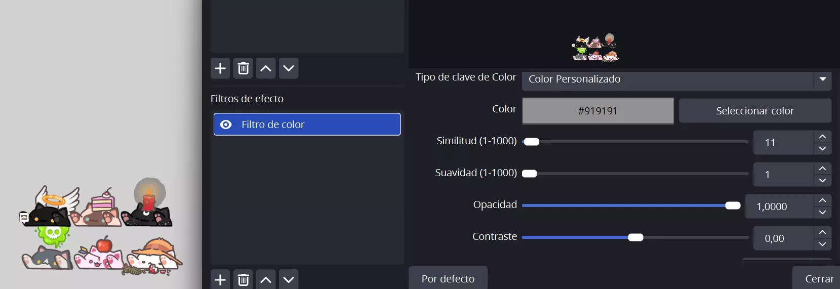 然后,将光标移至Bongo Cat源上,右键点击→滤镜→添加颜色滤镜。将颜色滤镜类型更改为自定义颜色,并使用以下颜色代码:919191。之后,只需调整以下两个选项:相似度:10–15之间;平滑度:1。