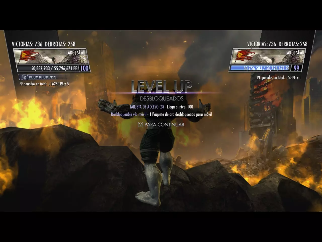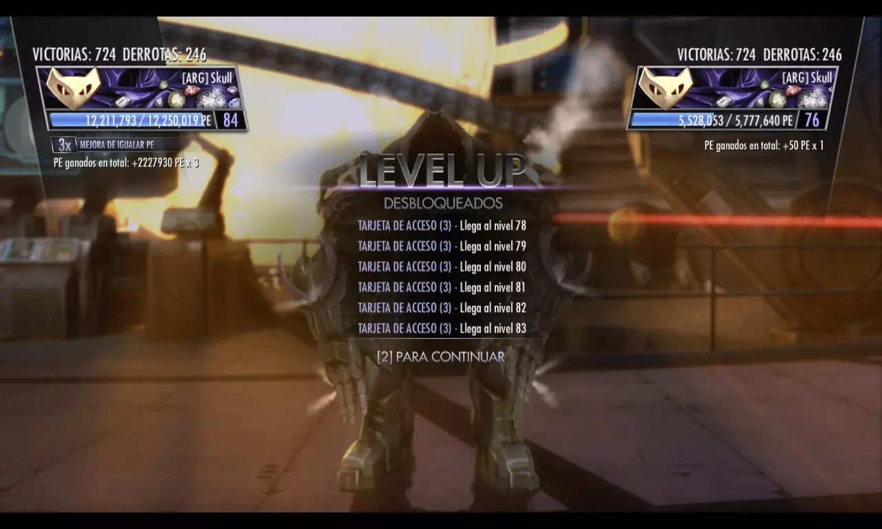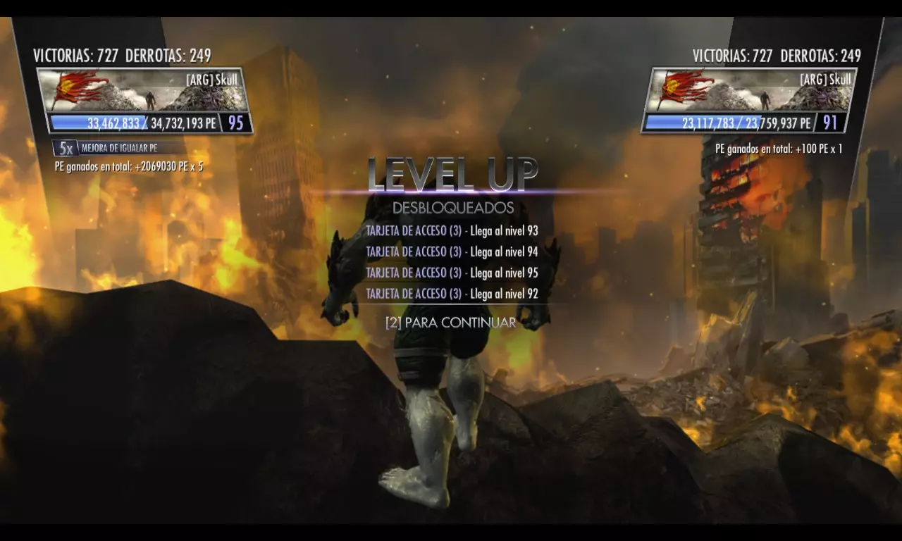 重要提示:请分步骤进行操作,以免遇到停电导致白忙一场,损失你的访问卡投入。至少在阿根廷,这种情况在盛夏和隆冬时节很常见。我之前就说过,但值得再重复一遍,建议大家使用带有TURBO(连发)功能的手柄或摇杆(现在大多数摇杆都包含这个功能,大家可以看看自己的摇杆是否有带闪电标志或“TURBO”字样的按钮)。要设置这个功能,需要按下TURBO键+场景互动按钮(如果用Xbox手柄就是RB键,PlayStation手柄则是R1键,不过大家当然也可以在游戏中更改按键设置,选择一个自己觉得更简单或舒适的按键)。激活后,大家会发现只要按住RB/R1键,就会自动与场景进行互动,这样一来就不用一直用手指按着按键了,只需用一根橡皮筋缠住按键即可。按下按钮或按住某个键来触发按钮功能。使用Turbo模式在50小时内达到100级是更好的方法,否则手动升级会非常累。我有经验,以前用老方法分段升级花了一个多星期。如果你的控制器没有这个选项,可以参考以下建议: 你可以随时进行这项操作,但建议持续6小时,有耐心的话可以12小时,如果你能坚持24小时也行,之后击败玩家2来保存进度。如果想获得额外经验值,可以将对手从一个场景击飞至另一个场景,场景转换时经验值会乘以200。这样你就能明显看到获得的经验值数量了。保存进度后,不要关闭游戏!充分利用5倍战斗强化PE的所有使用次数。如果你想知道还剩多少次使用机会,返回主菜单->额外内容->查看个人资料,在右下角会显示你还剩多少次带有倍率的游戏次数。但返回主菜单会算作一次游戏失败,因为你相当于退出了游戏(会损失1次使用机会),所以最好选择【复仇】,并且每次操作时都记录一下,以便知道还剩多少次。 你要离开、电脑过热或者想睡觉?只需暂停游戏,最小化窗口,然后让电脑进入“睡眠”状态。为什么呢?设备处于暂停状态时,仍会保持少量能量以维持我们的任务。如果你关闭设备,将无法使用战斗强化,并且不要多次购买这些强化,因为这会消耗大量访问卡,而访问卡是解锁成就Acaparador所必需的。此外,暂停设备似乎可以保存进度,以防第二天醒来遇到停电情况。你可以使用Steam界面(Shift+Tab)来打发时间,我在升级的时候就在做这个指南。当你持续多次按下手柄的互动按钮进行互动时,确保将界面窗口稍微抬高,足以看到角色的脚,这样你就能知道他们是否保持距离,或者你的角色是否还在继续互动;或者用手机让时间过得更快。如果有不理解的地方,可以留言提问。如果需要在线成就的帮助或只是想一起玩,可以联系我。请在评论中说明你们来自哪个国家(请记住,这款游戏有区域锁定,只能与来自相同国家和邻国的玩家一起玩,有时会有例外情况)以及你们需要获取的成就,这样大家可以互相帮助。