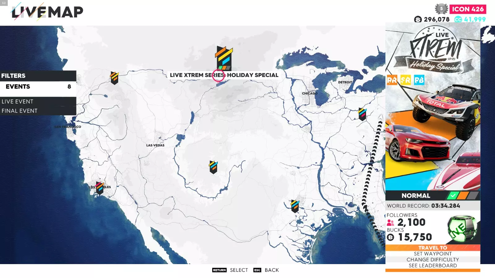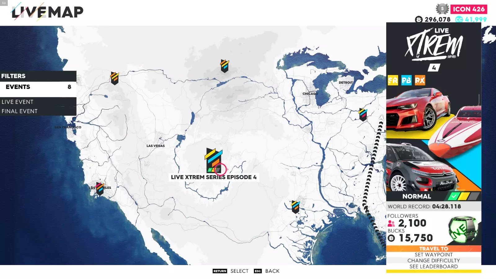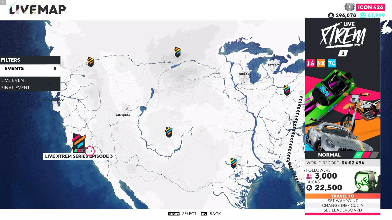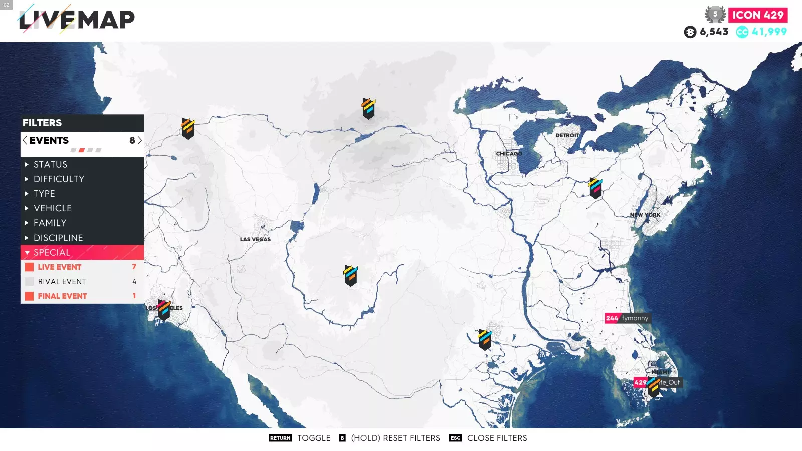 要解锁这些成就,你只需完成极限直播系列赛的所有赛事(1-5以及总决赛——部分玩家无需完成极限特别赛事即可解锁成就)。如果地图上没有显示某个赛事,可能是该赛事仍处于锁定状态,或者你没有所需的载具。在此我会说明如何使用筛选器在地图上找到这些赛事、所需的载具类型以及赛事位置。 如何在地图上轻松找到它们: 打开地图,在底部菜单中你会看到“打开筛选器”按钮。点击该按钮后,会出现一个用于筛选地图上赛事的选项列表。使用导航键选择所需的筛选条件,地图会相应地显示筛选结果。