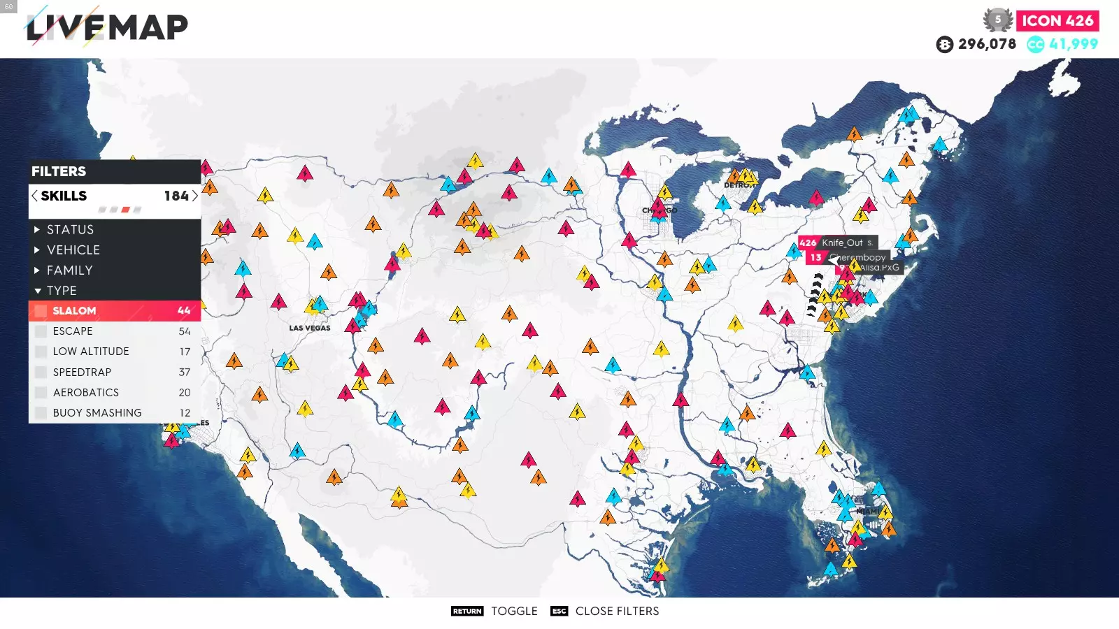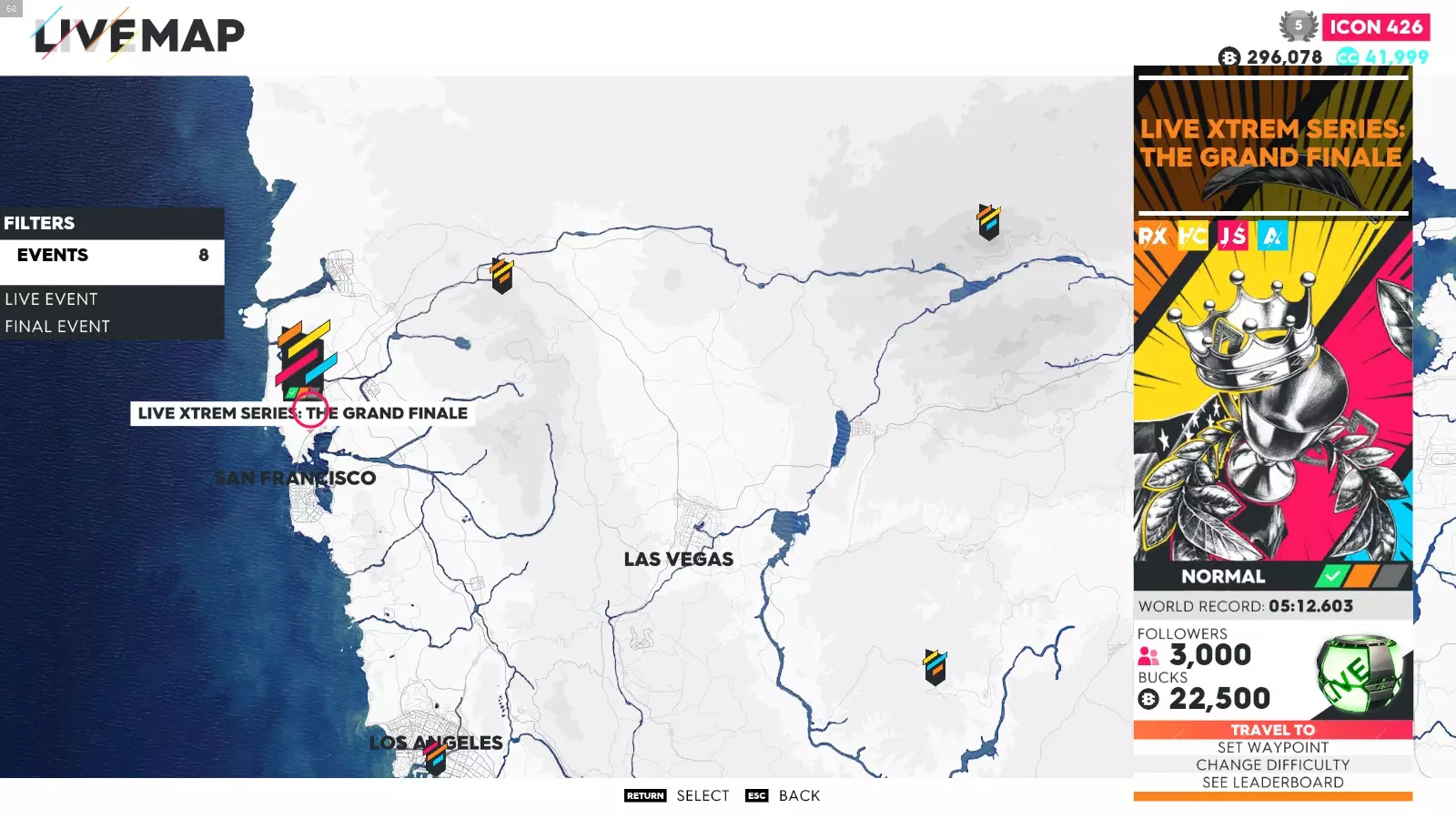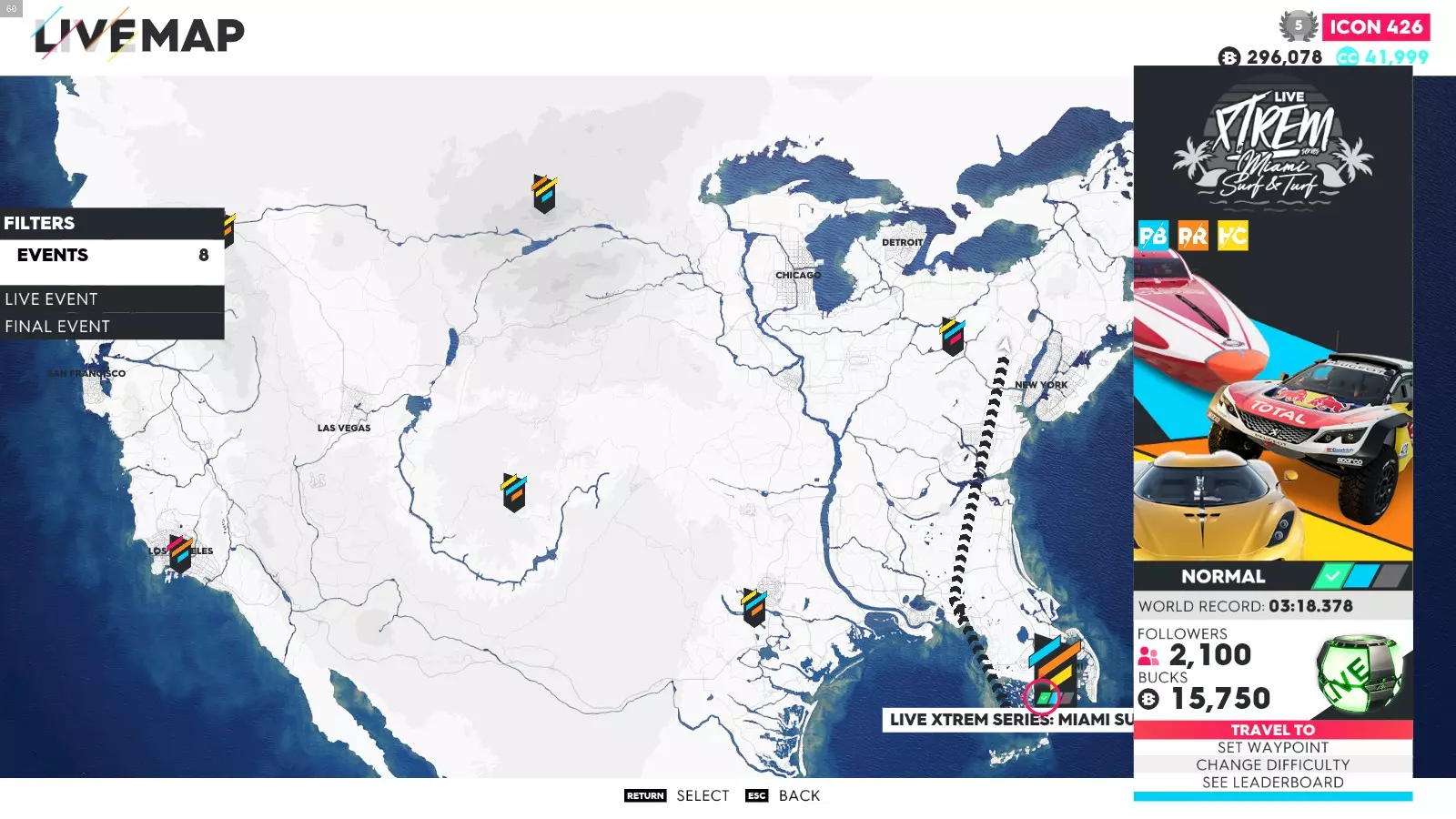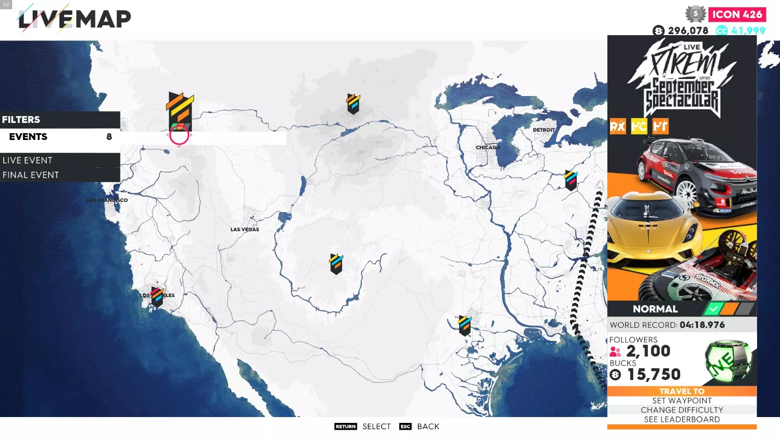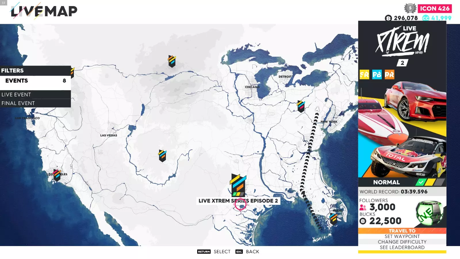要解锁这些成就,你只需完成极限直播系列赛的所有赛事(1-5以及总决赛——部分玩家无需完成极限特别赛事即可解锁成就)。如果地图上没有显示某个赛事,可能是该赛事仍处于锁定状态,或者你没有所需的载具。在此我会说明如何使用筛选器在地图上找到这些赛事、所需的载具类型以及赛事位置。 如何在地图上轻松找到它们: 打开地图,在底部菜单中你会看到“打开筛选器”按钮。点击该按钮后,会出现一个用于筛选地图上赛事的选项列表。使用导航键选择所需的筛选条件,地图会相应地显示筛选结果。