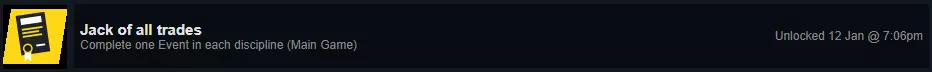 要解锁此成就,你需要完成每个类别的一个赛事。为了方便筛选,建议你过滤地图并在其中查看已完成的赛事。 以下是你需要完成的所有赛事类别: 特技飞行(自由式) 撞车大赛(自由式) 怪物卡车(自由式) 喷射艇(自由式) 街头竞速(街头赛车) 漂移(街头赛车) 直线加速赛(街头赛车) 超级跑车(街头赛车) 动力艇(职业赛车) 房车赛(职业赛车) 空中竞速(职业赛车) 阿尔法大奖赛(职业赛车) 拉力赛(越野) 拉力越野赛(越野) 摩托车越野赛(越野) 气垫船(越野) Virtuoso