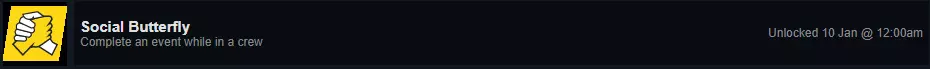 要获得此成就,你需要击败对手(总部的人)或好友的幽灵。要查看他们,你需要在完成任意赛事(或技能)后再次开始该赛事(或技能)。通过技能来完成会更容易,因为所需时间更少。 这两个成就的含义相当明显——在车队中进行相关活动。 Social Butterfly