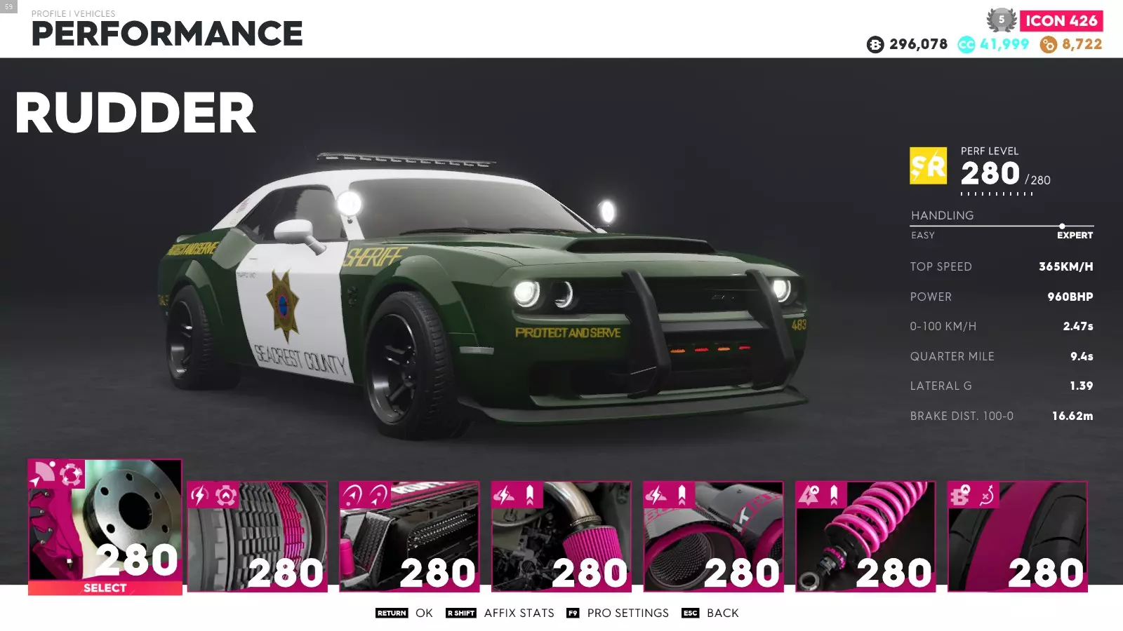 在这张截图中,我的载具性能等级是226,而最高等级是280。要获得【Epic Win】成就,你需要将你的赛车(如果是街头赛车的话)性能等级提升到280。