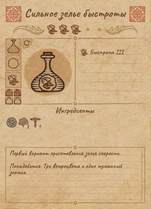 材料: 基础:水 风之花(x4) 刺根(x2) 魔法浆果(x1) 血蛭(x1)