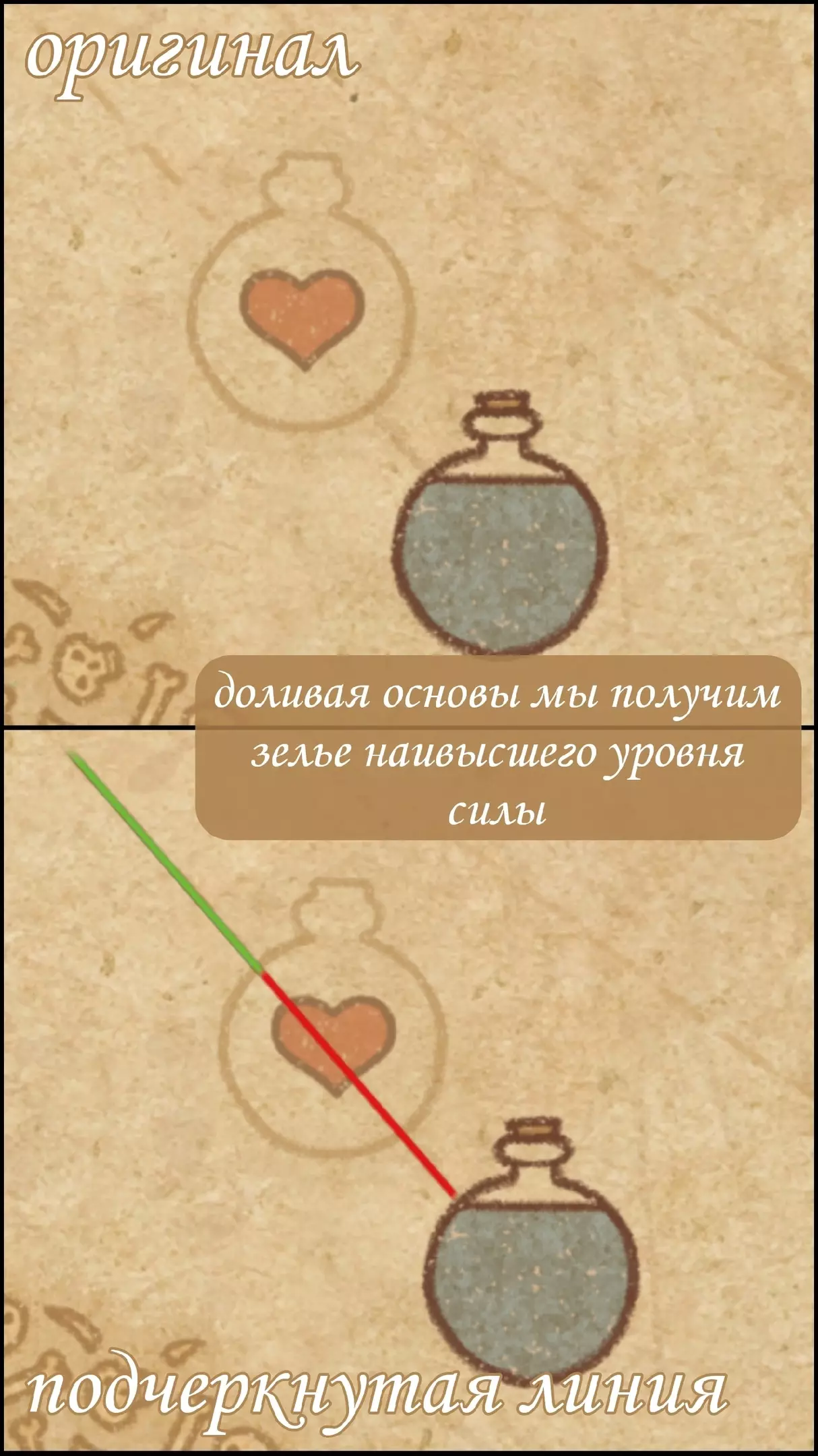 配方: 将治愈石楠100%研磨 研磨毒蝇伞,直至十字标记与药水齐平(参见截图1) 放入一个未研磨的水之花 将第二个水之花研磨一半并搅拌(参见截图2) 添加水 截图1:
