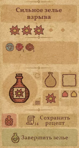 配方: 将两颗爆炸花和一颗血红宝石彻底研磨 往锅里放入两颗未锤击的血爪 将一颗血爪轻微研磨(见图1) 另一颗血爪按图2所示研磨 最后一颗血爪按图3所示研磨 加入彻底研磨好的血红宝石 再往锅里加入未锤击的爆炸花 搅拌(见图4)使用毛皮加热角落,以便通过漏斗移动(见图5) 通过漏斗移动后,我们到达指定位置(见图6) 混合药水(见图7) 添加水基(见图8) 小心添加月盐,直到达到所需的药水等级(3级需要约417单位盐) 图1: