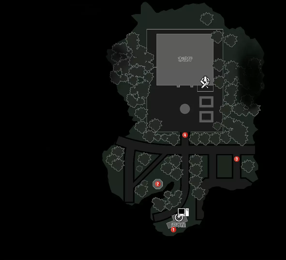 红色标识:1(钥匙10)、2(记忆09)、3(医疗包01)、4(档案17) 钥匙10位置:在避难屋外能看到一个女神像,打碎得到钥匙09