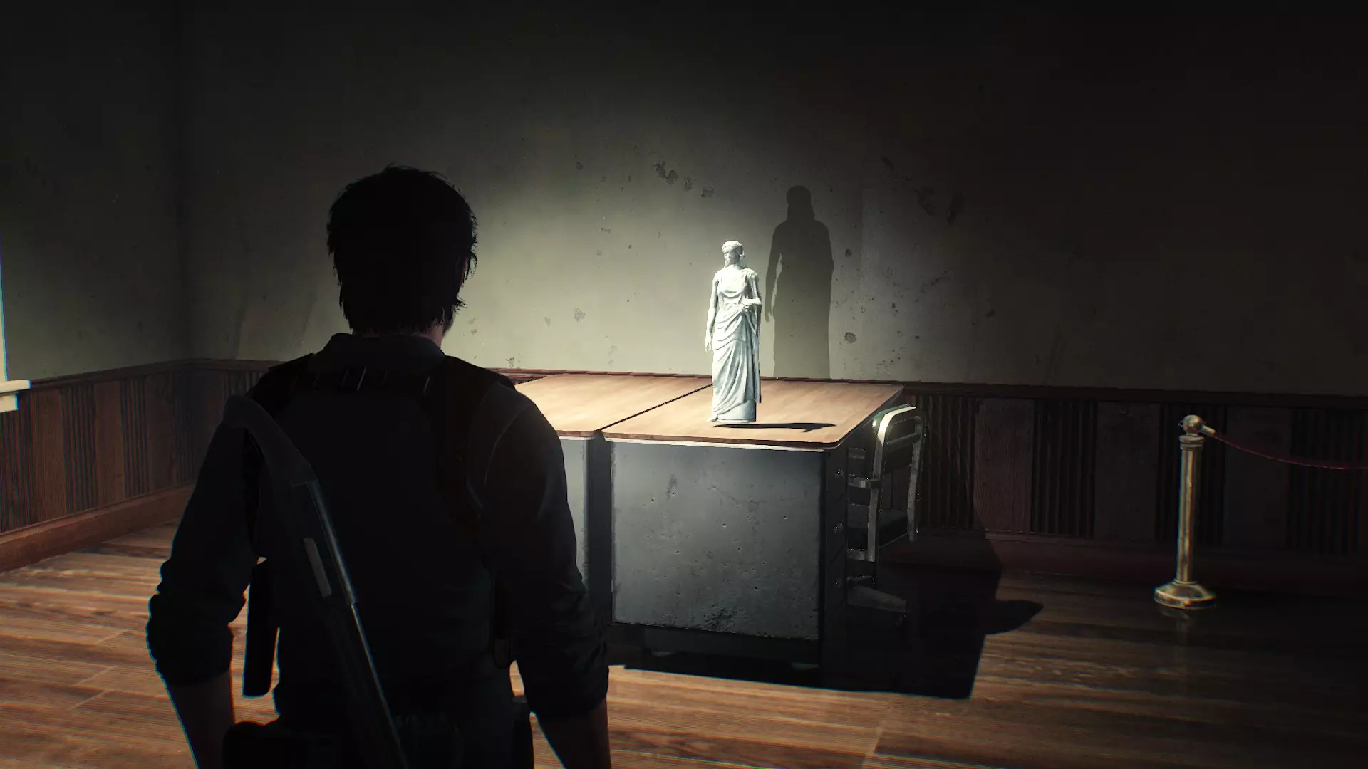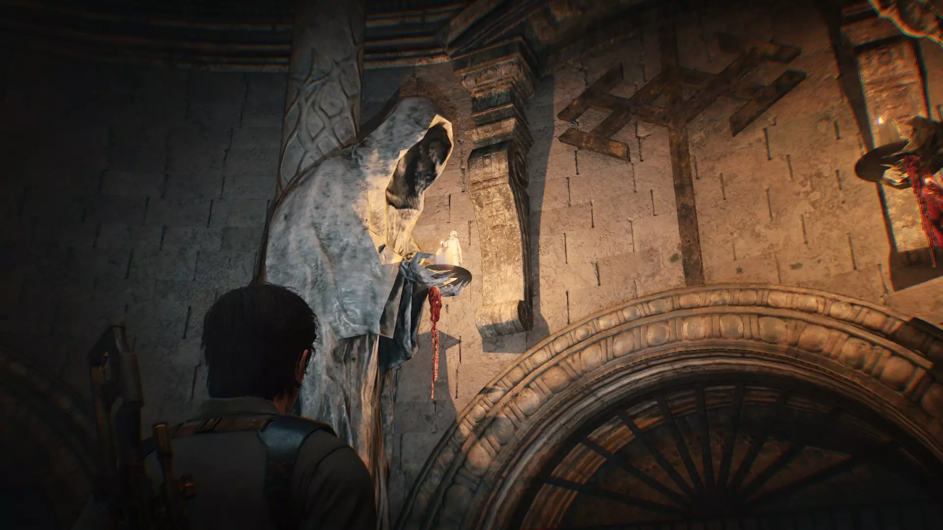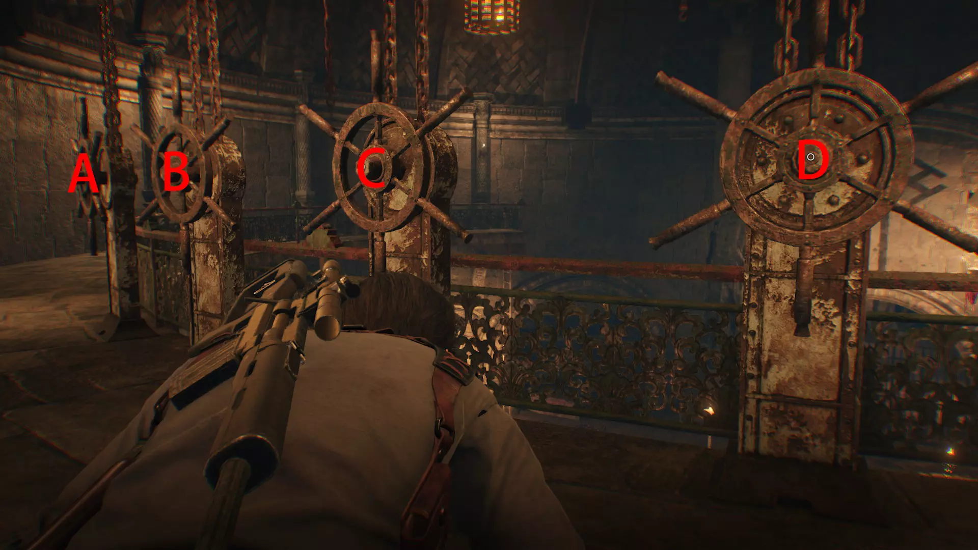钥匙20位置:来到一处空旷的解谜场景,左侧雕像手上的烛台有个女神像,用枪打碎即可获得钥匙20。