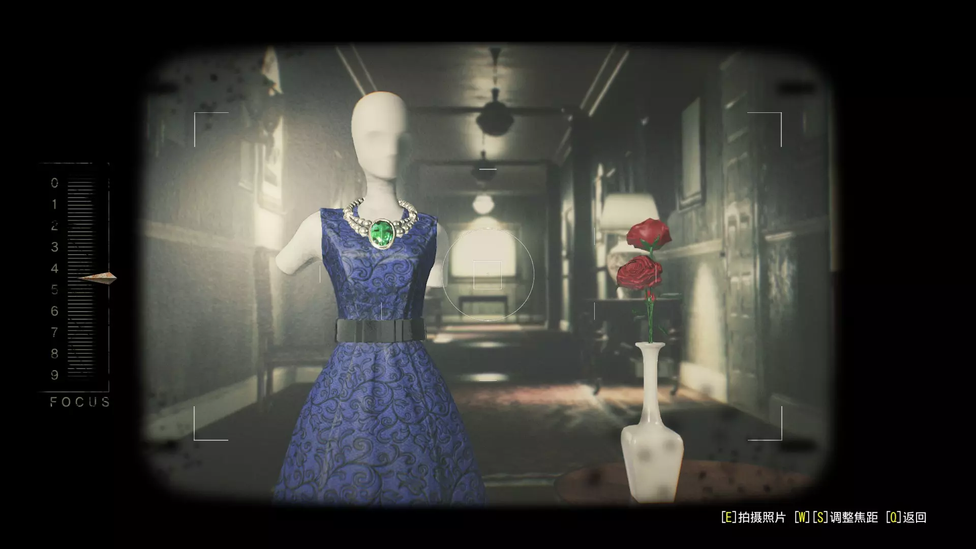 第5章谜题解法:先拿下花瓶里的【玫瑰】和桌上的【翡翠项链】,分别放在照相机正面的花瓶和模特身上,再旋转模特让它正面对着镜头(与墙上的画一致),调查相机,将焦距调整到中间后拍摄即可。