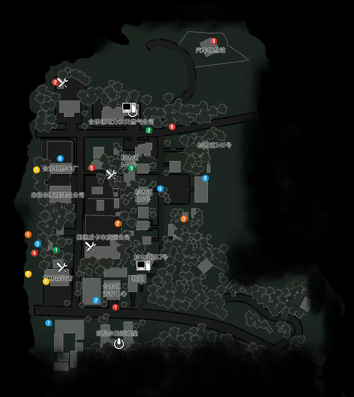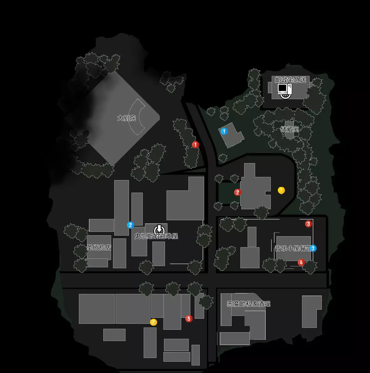红色标识:1(钥匙13)、2(钥匙14)、3(钥匙15)、4(钥匙16)、5(钥匙17) 蓝色标识:1(上锁补给箱)、2(散弹枪弹药包02)、3(狙击步枪弹药包01) 黄色标识:1(记忆11)、2(记忆12) 上锁补给箱:总共有三个,分别位于地图上的蓝色标识1、储藏室、史凯斯的避难屋 事件:怪物制造记忆11「肢离破碎」位置:来到巴士停车场的尸体堆前,拿到记忆11,原本在远处街上巡逻的圆锯姐就会从天而降(可以先杀死远处的圆锯姐再回来拿记忆)