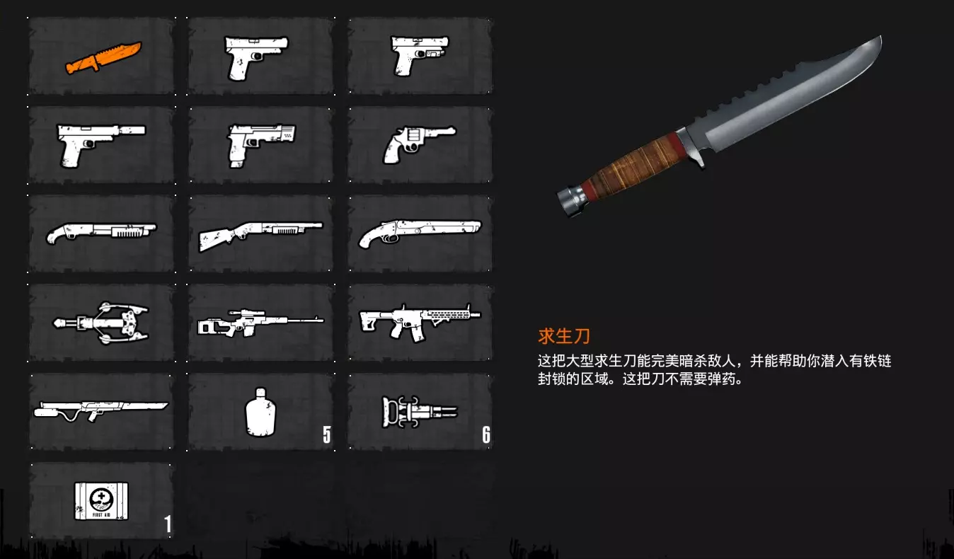 - 连发手枪 - 50份火药 - 100个武器零件 - 1个高阶武器零件 - 1个医疗包 - 5个药草 跟前作一样,《恶灵附身2》的预购特典DLC【最后机会包】也是没有单独发售过的,目前可以在一些零售网站购买,价格大概五块左右,不过相比前作,这次的预购奖励相当鸡肋,连发手枪并不好用,最有价值的反而是高阶武器零件 武器大全 求生刀获得方式:第2章剧情获得