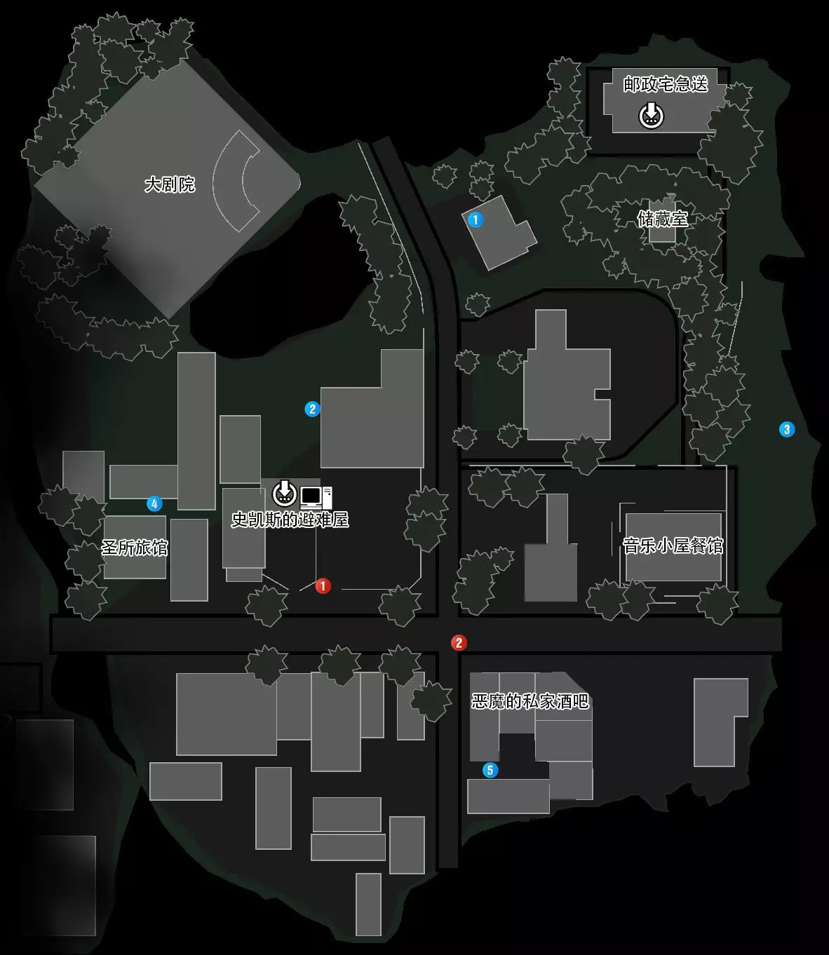 红色标识:1(钥匙27)、2(钥匙28)、3(钥匙15) 蓝色标识:1(上锁补给箱)、2(狙击步枪弹药包03)、3(散弹枪弹药包04)、4(突击步枪弹药包01)、5(突击步枪弹药包02) 上锁补给箱:位置与第7章相同,本章可再次开启,分别位于地图蓝色标识1处、储藏室、史凯斯的避难屋 寻找武器:突击步枪位置:开场时从沙发旁获取