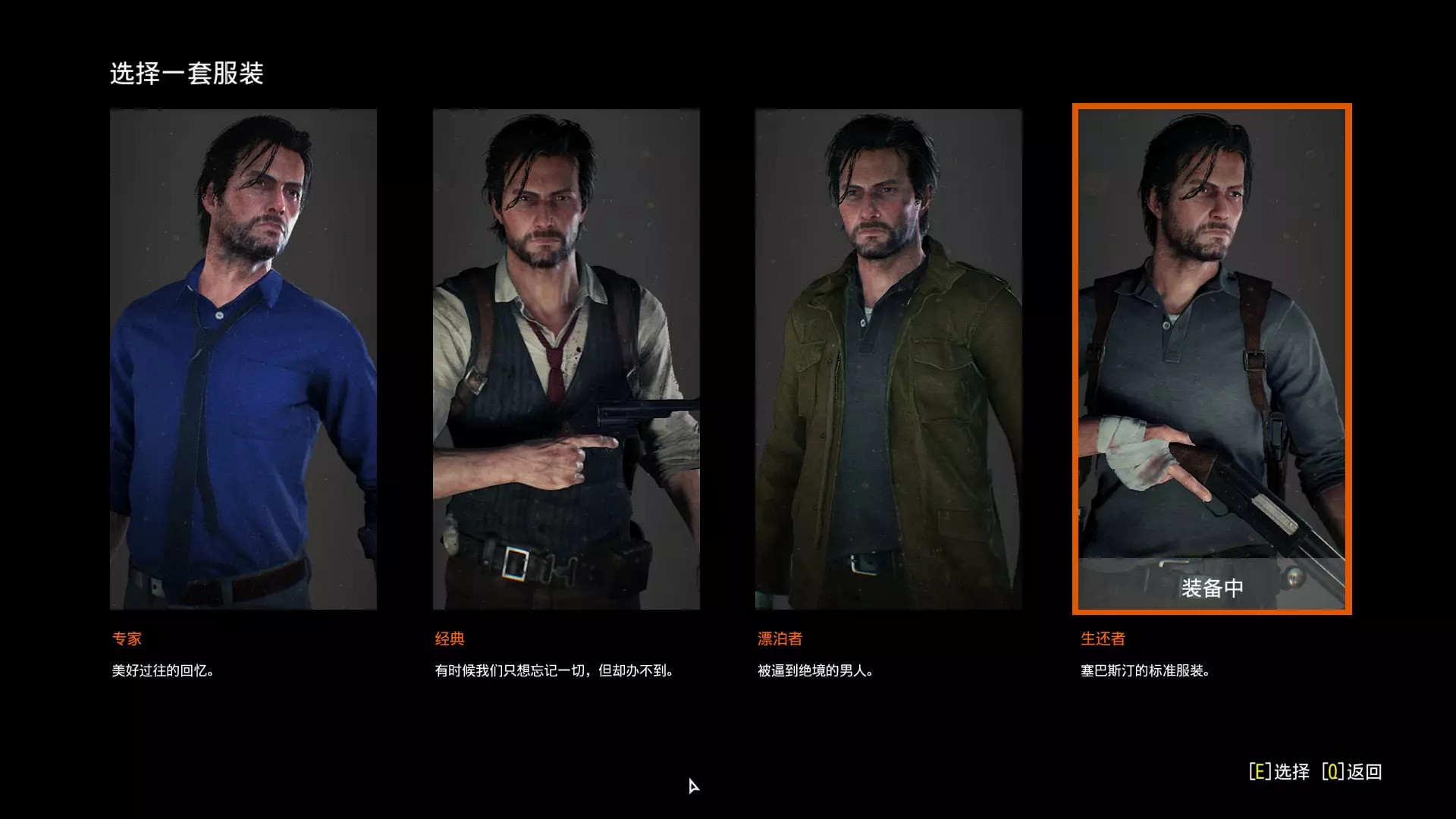 服装在通关一次后解锁,之后无论是二周目还是重新开档都能进行换装(经典模式除外)。点击个人室里的挂衣架即可更换服装,初代的【经典】服装需要玩家拿到左轮手枪并通关后才会解锁。
