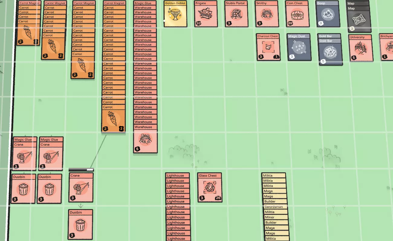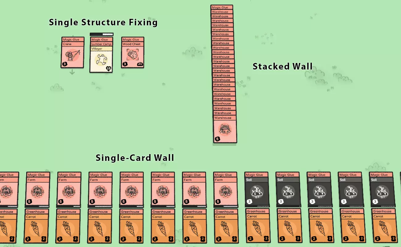 魔法胶水与墙体加固 魔法胶水能通过三种关键方式提升网格建造模式下建筑的稳定性。其主要作用是减少混乱及其扩散范围,并缩短将建筑恢复至功能正常、布局有序状态所需的时间。恢复过程应简单到只需按下【E】键或进行少量操作。你不会希望起重机或垃圾桶破坏整个建造面板,影响多个建筑结构并删除贵重物品。 - 单个建筑修复 修复单个建筑(如伐木场或箱子)效果显著。在大多数情况下,只需移除冲突物体(例如传送门)并将建筑卡片重新对齐网格,即可确保建筑稳定性,无需进行其他操作。- 堆叠墙 堆叠墙由多张卡片堆叠在单个魔法胶上组成,非常适合建造垂直墙壁。但它们无法用于保护水平结构。 - 单卡墙 单卡墙使用多个魔法胶卡片,每个魔法胶仅固定一张卡片。这类墙壁可从垂直和水平方向完全包围结构,提供更强的保护。 通过结合不同的网格建造技术,如单独固定、堆叠墙和单卡墙,你可以提高建筑的稳定性,同时节省资源并创建灵活的生产链。这些技巧可以帮助你应对传送门以及其他潜在混乱源带来的挑战,确保你的结构保持功能正常且井然有序。