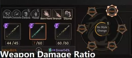 你可以通过上方显示的滑块在战斗中调整武器的伤害比例,可调整的幅度取决于武器类型和你的智力比例加成属性。某些武器类型用途广泛,允许你根据敌人进行调整,调整比例也会影响每次攻击所应用的智力/外部攻击数值。 因此,如果你难以穿透敌人的外部和智力防御,将伤害比例调整为50/50只会让情况更糟。 另一方面,如果对手的防御属性较弱,50/50的比例可以让你在命中时同时造成智力和外部伤害,这可能会迅速给敌人叠加大量伤害。 注意,攻击技能的伤害比例需在武学面板中单独为该技能进行调整。胜利战斗与战败标记 胜利战斗 战斗的目的是对敌人造成足够的战败标记以获得胜利。击败对手所需的战败标记数量完全取决于战斗的性质,一场练习赛可能只需10个战败标记就能决出胜负,而一场生死之战则需要30个战败标记。