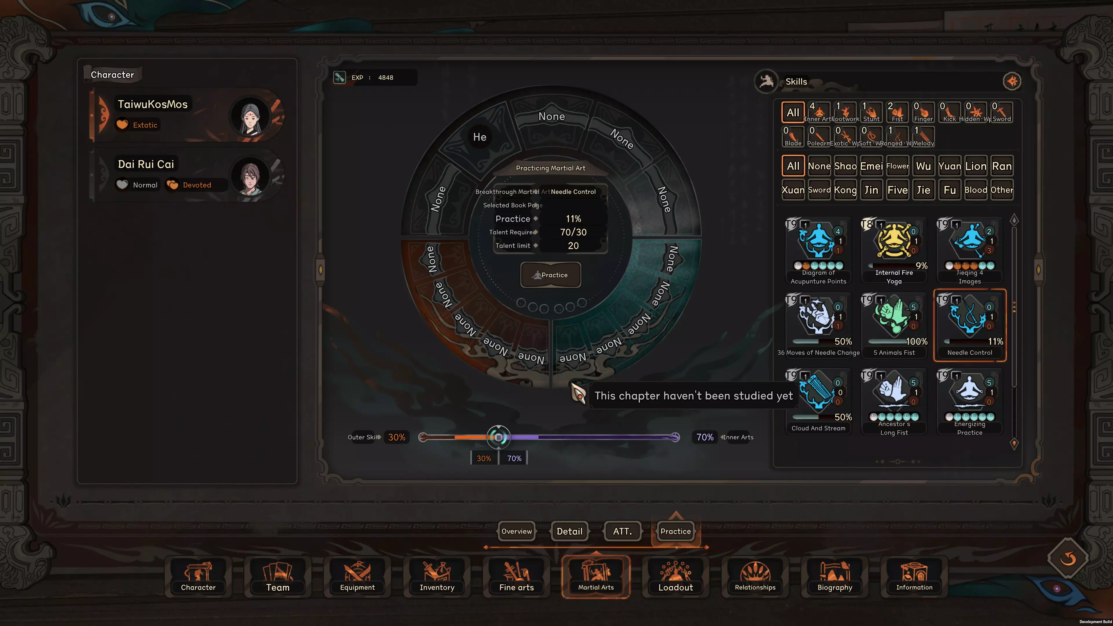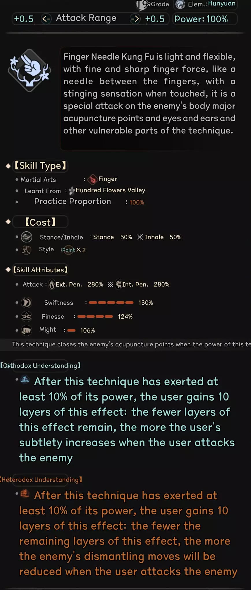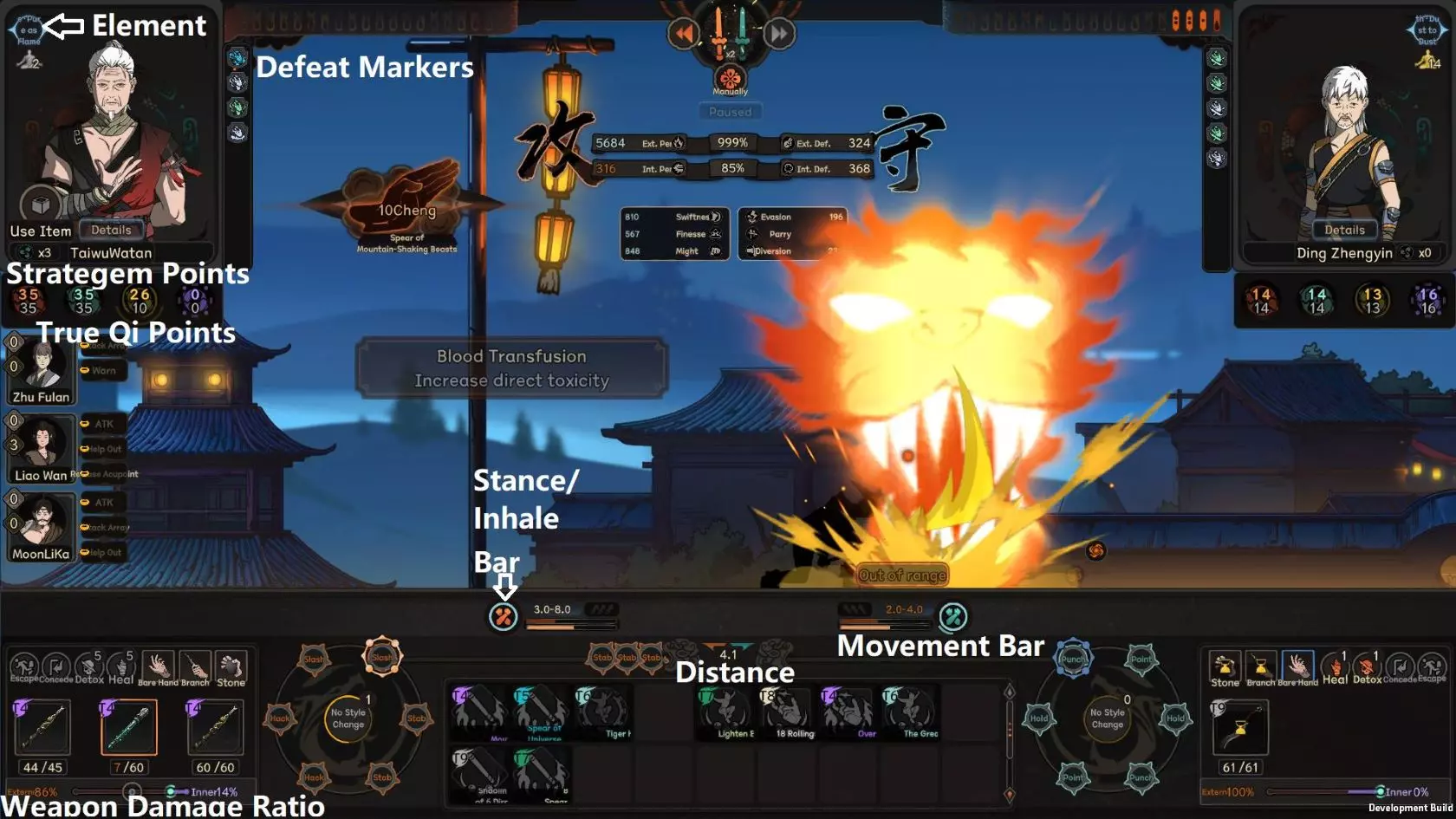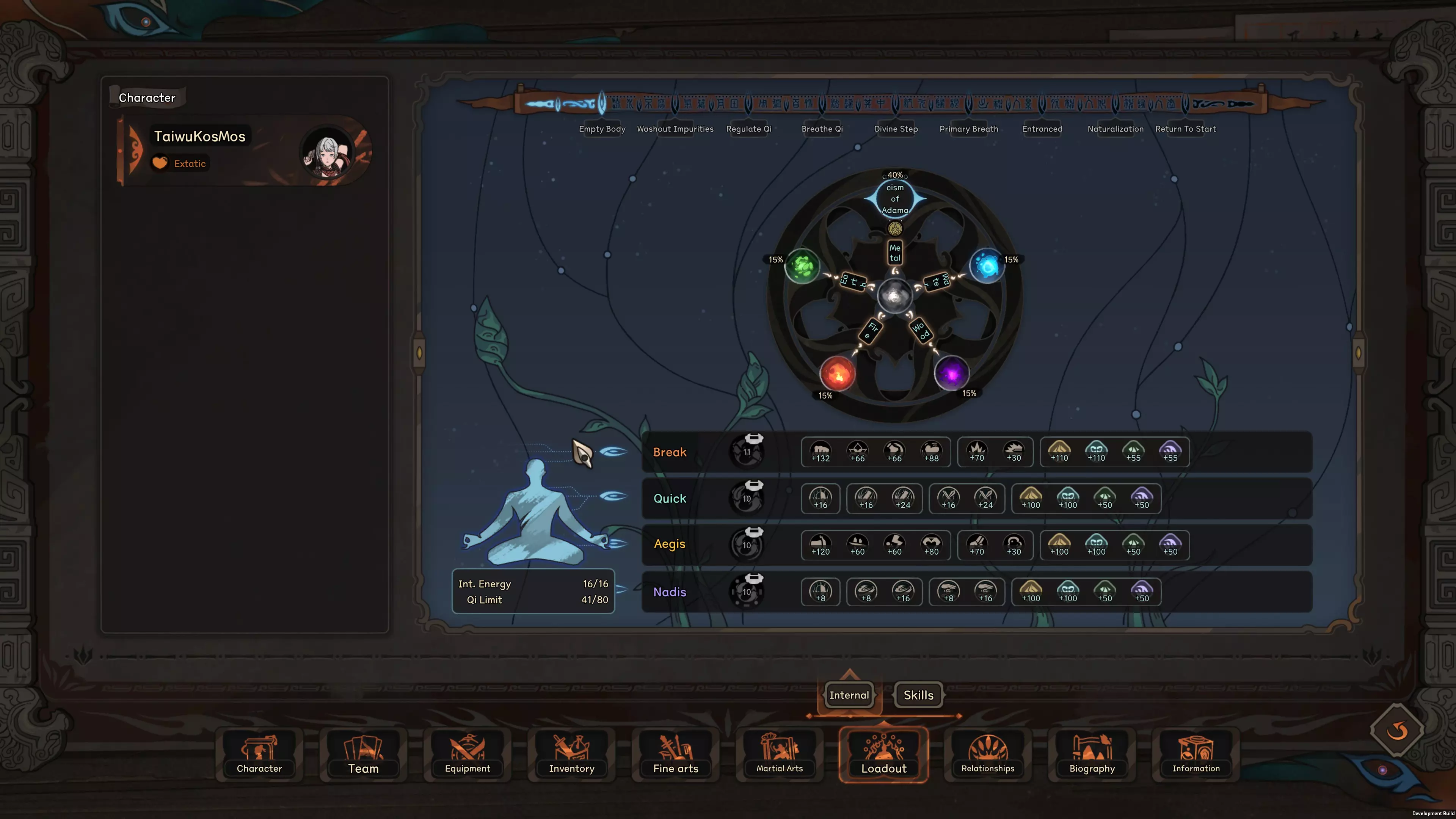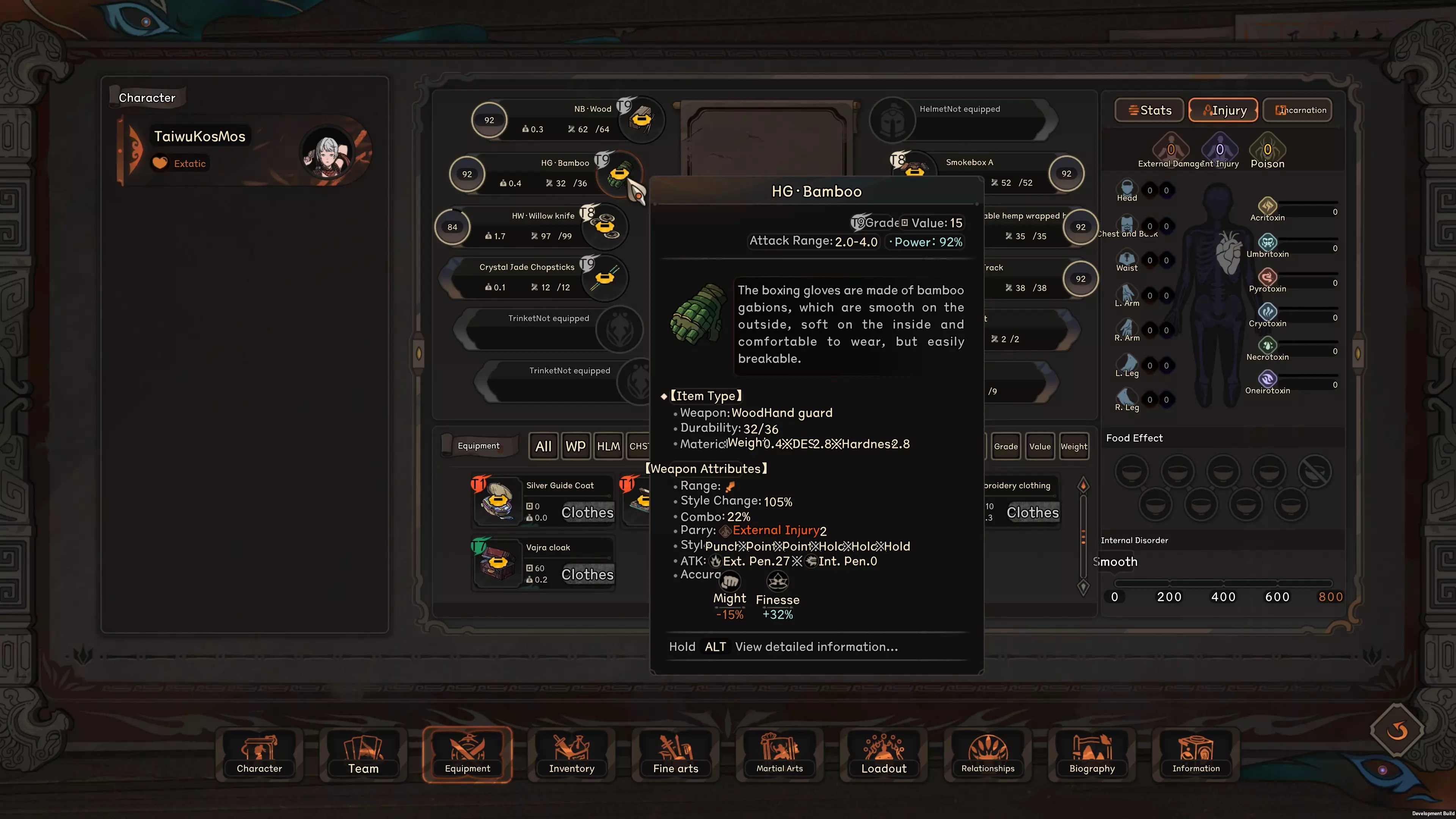 The main way a character gains strength in Taiwu is allocating int energy gained from running inner skill to various True Qi, which increase various basic and secondary stats described in the beginning of this article. Elemental Effect on True Qi The effect of these True Qi points are rather self explanatory, so you can look at them yourself, but what isn't obvious is that your element also affect the effect of each true Qi Point. It is obvious that break Qi points give offensive stats, but as you can see from the screen shot above, this character is gaining more Force than Finess, more ext atk than int atk. This is because the character's element is Metal, which cause each true Qi point invested to give more stats related to phyiscal damage and force, less for internal attacks. The general focus of each element is as follows: Metal : Best Force, ext attack and Stance Recovery, decent attack speed as well. Very bad int attack, finesse and quickness. Wood: Best Quickness and int ratio bonus, making them flexible, but overall stat leans twoard int attack. Water: Best breath, move speed, and leans heavily into internal attack/def with very bad physical attack/def stats. Fire: Balanced Stat across the board. Earth: Best Finesse and Equipment efficency, leans towards ext attack but otherwise pretty balanced. Mix of element will result in a mix of these stats. For example, mixing Metal and Earth results in the highest ext attack but also the worst int attack, mixing metal and water instead results in slightly more balanced stat between ext and int attack compared to pure metal or pure water( but still leaning towards the more dominant element of the two) Gaining and Losing Qi in Combat There are a lot of skill that cause player or enemy to gain/lose/siphon True Qi in combat, if True Qi changes from their basement for any reason, they will fairly rapidly return to their base level, the speed this happens depend on the character's internal breath stats. High int breath slows down the speed in which you lose bonus True Qi, and increase the speed you recover any lost Qi. As is, I think the system can use some further balance, most small amount of Qi gain from skills will quickly return to normal and is thus almost useless, only skills that continous gain/destroy true Qi or skills that gives a massive amount at once sees a significant impact in game right now. More Advanced Stuff So up to this point this guide has been explaining the how the mechanics function, here I will also give some more in depth detail that I felt might be a bit too detailed for a basic guide and tips to help those who want to min-max a bit more. How Much Accuracy do I need? Currently, if your Accuracy stat is greater than the Corresponding Resolve stat of the opponent (note the base stat in character window does not account for modifiers such as weapon, armor or debuff from weakpoint on target body part, etc...), the attack will hit. Otherwise there is a progressively greater chance to miss. As a result, you should aim to have your raw accuracy stat to be at least around the same level as your enemy, considering various buff from armors and abilities, having your base accuracy at around 70-80% of the enemies will cause to begin struggling with landing hits. More importantly, sub-par accuracy also severely limits the damage any attack you do land. If your accuracy in one area is far outclassed by your opponent's corresponding resolve stat, consider avoiding attacks based on that accuracy stat all together by using style change or weapon that focus on the accuracy stat that gives you the biggest advantage against your current opponent. How to get damaging attacks? To expand a bit on the damage system in taiwu, each hit in taiwu has a hit strength score determined by a variety of factors, if the strength is high enough to meet the threshold required by a type of defeat marker, that defeat marker will be inflicted. For example the threshold to inflict a weak point marker is very very low, which is why you will find it possible to land plenty of weak point marker on a enemy but never getting an injury. Accuracy in taiwu has the additional effect of determining the hit strength of the attack as well, think of this as a more skilled attacker is not only able to land blows, but more precise and thus damaging blows as well. But the other half of the equation is that attack need to have enough power behind it to pierce whatever qi/armor defense of the defender, which is where the ext/int atk/def stat comes in. Hit strength is determined by both accuracy stat and atk/def stats, currently calculated multiplicatively, so to have effective attacks, you need to have a balance of accuracy and atk stats to cause lasting damage. If you have massive accuracy advantage over the enemy, but poor penetration, it is likely that your hit will still struggle to leave a mark. Thus while you want both more accuracy than the enemy's resolve and more atk than the enemy's defence, increasing the area where you are lagging behind, whether it be through skills, equipment, or food/potions will give you more return in damage effectiveness. Lastly, many armor and some skills reduce the damage of taken by a certain level. This means that if the enemy wears a armor that has -2 ext injury, if your attack would've caused 2 level of ext injury but hit the armor, it simply causes weak points. This is a common reason why in evenly matched fights basic attack ends up taking no damage. Therefore it is very important to consider ways to work around these damage reduction, a good choice is using, or at least carrying a weapon with high DES stats, since that can negate damage reduction provided by armor, which is one of the most common source of damage reduction. Advantage and Disadvantage of Break Skills vs Basic Attack Attacking with skills works very similar to base attacks, they just give the attack a further boost to both accuracy and attack stats, each attack skill 