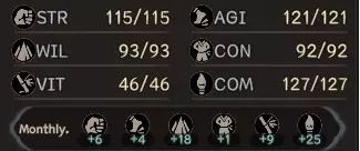 基础属性是角色的基本属性,通常难以更改。大多数情况下,它们不会直接影响战斗,但大多数装备/技能在计算其效果时需要一项或多项基础属性。如果缺少所需属性,你可能无法充分发挥装备/技能的全部效果。不过,各项属性也会影响多种战斗属性,具体如下: 力量(STR) 提升威力/分散值 增加角色的装备重量上限(从而减少因穿戴重型装备而受到的速度惩罚) 敏捷(AGI) 提升迅捷值/闪避值 意志(WIL) 提升气息值和专注值 体质(CON) 提升额外攻击/额外防御 每10点体质可使每月使用的消耗品数量增加1个VIT 提升智力攻击/防御 COM 提升阅读速度 提升灵巧/格挡 各项基础属性若因任何原因降低,每月都会恢复。部分属性在角色年轻时恢复更快,例如STR,其他属性则在角色年长时恢复更快,例如WIL。