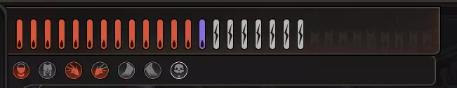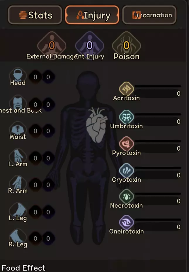 以上是已受到一定伤害的敌人的击破计量条示例。敌人身上可能会被施加多种击破标记,无论施加多少种,只要击破计量条被填满,敌人就会被击破。下面我将依次进行说明。 击破计量条下方是显示各部位伤害的计量条。当某个身体部位受到伤害时,该部位的图标会逐渐填充,填满后将生成一个受伤标记。这与之前非全即无的受伤机制不同。现在,即使攻击未能造成决定性效果,至少也会造成一定伤害,这些伤害最终会累积成一个受伤标记。身体部位生命值可通过学习武术提升,通常是学习依赖该身体部位的技能,例如提升腿部生命值的踢技。请注意,这些效果不会叠加,仅最高等级的效果生效。 通常,每个击破标记会根据造成该标记的攻击所命中的敌人身体部位进行归属,你可以通过悬停在该标记上来查看。这一点很重要,因为有些技能会专门针对特定的身体部位。 弱点 - 橙色 - 最容易施加的击破标记,任何成功命中的攻击都可能对敌人施加弱点(除非敌人的外部/内部防御力极高,或者你的攻击完全未命中),这些弱点会随时间迅速消失。敌人身上相应部位也会显示为发光点。标记上的点数表示其弱点的严重程度,使用高精度攻击或造成伤害可能会产生更严重的标记,这些标记需要更长时间才会消失。 当弱点击破标记存在时,后续攻击同一身体部位将更容易造成伤害。因此,本质上如果敌人的防御值很高,但你的准确度足以至少造成一些弱点标记,那么积攒攻击然后连续快速攻击可能是个好主意,有了许多弱点标记后,你的攻击更有可能最终对敌人造成伤害。 穴位-深蓝-与弱点类似,但通常只能由技能触发,虽然它也会自行消失,但持续时间往往比弱点长得多。穴位不会像弱点那样使敌人变得更脆弱,而是根据其位置施加减益效果。例如,腿部的穴位会降低移动速度,胸部的穴位会减少吸气。 外伤-红色-由突破目标外部防御/护甲的外部伤害攻击造成。与弱点不同,外伤不会随时间消失,但在特定情况下有不少技能可以治疗外伤。 任何身体部位最多可出现6处外伤。同一部位有5处外伤时,受伤角色会受到减益效果;有6处外伤时,还会阻止其施放恢复该身体部位的技能。身体部位受到的超出6点的伤害将转化为重伤标记,重伤标记并非局限于单个身体部位,但相比普通伤害标记更难造成,因此通常攻击多个身体部位效率更高。 内伤 - 浅蓝色 - 与外伤机制相同,区别在于内伤通过内部伤害造成。内伤标记与外伤标记的其他规则一致,但每个身体部位可同时存在6个内伤标记和6个外伤标记。因此,若能确保攻击足以穿透对手相应防御,使用同时造成内伤和外伤的攻击通常更为有效。 daze/breath injury - 灰色带心形符号 - 目前对此的翻译尚不明确。这基本上是由声音攻击通常造成的精神损伤,但也可能由一些特殊技能导致。这种损伤会持续很长时间,并且会对敌人的专注力施加减益效果,本质上使他们更容易受到后续声音攻击的影响。 旧伤——这是外部/内部损伤的特殊版本,颜色更深。这些是你进入战斗时已存在的任何损伤,也可能由某些技能造成。在战斗中,它们比普通版本的损伤更难治愈,但其他方面则完全相同。 中毒——这部分内容值得单独说明,因此我可能会在之后再详细介绍。目前只需了解,一种毒素最多可叠加3个自身类型的毒素标记,但它可以通过其他效果促成胜利,例如在特定条件下造成更多的外部/内部伤害。 技能 战斗中有3种主动技能可使用:移动技能、攻击技能和防御技能。我将以这个技能为例讲解攻击技能,它是最复杂的技能类型。