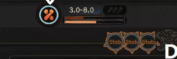 攻击范围 从上往下看,技能会改变武器的攻击范围,通常是增加范围,从而更难躲避,这里是增加最大和最小范围各0.5。 威力 威力百分比显示在当前属性下,该技能的效果如何。如果威力高于或低于100%,技能的大部分属性会相应地增强或减弱(超过100%通常只能通过内功/元素亲和加成实现,但达到150%以上并不难)。 吸气和架势消耗 技能会消耗一定的架势值和吸气值,战斗中在移动条旁边的圆圈中显示,如下所示。