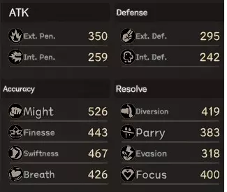 你积累的风格值会显示在移动条下方,请注意你只能持有有限数量的风格值,超出部分将被浪费。 同样值得注意的是,只要武器能够生成相同的风格,它们就可能可以使用相同的技能。例如,一个消耗突刺风格的剑类技能,即使你手持的 saber(军刀)在其风格轮中也有突刺风格,也可以使用该技能。 技能属性 这部分说明了技能攻击对攻击和命中属性的修正量。在这种情况下,你可以看到该攻击将造成你普通外部穿透和内部穿透的280%伤害。 此外,每个命中属性旁边的红色条还显示了根据相对命中值,该技能将造成的伤害比例。本质上,使用技能攻击时,敌人需要对3项命中属性分别进行格挡判定。例如,若敌人的闪避值超过你的敏捷值,你的技能将仅造成50%的威力,因此伤害也会相应降低。 防御技能 此类技能不消耗流派点数,但会消耗固定数量的架势值或吸气值。 防御技能大致分为三类:一是单纯提升防御或决心属性以增强生存能力的技能;二是在敌人特定类型攻击未命中时允许进行反击的技能;三是能够将特定类型伤害反弹给敌人的技能。 所有防御技能都有固定的持续时间,在此期间你可以移动(但不能使用移动技能)、普通攻击和使用物品,但无法使用攻击技能。移动技能 这些技能不消耗流派值,但会消耗固定数量的移动值(某些情况下可能还会消耗流派值或吸气值)。 如移动部分所述,它们的持续时间显示在底部的移动条上,通常分为两类:一类是加快移动速度,另一类是在持续期间为你提供增益效果,同时允许你以正常速度移动。 装备