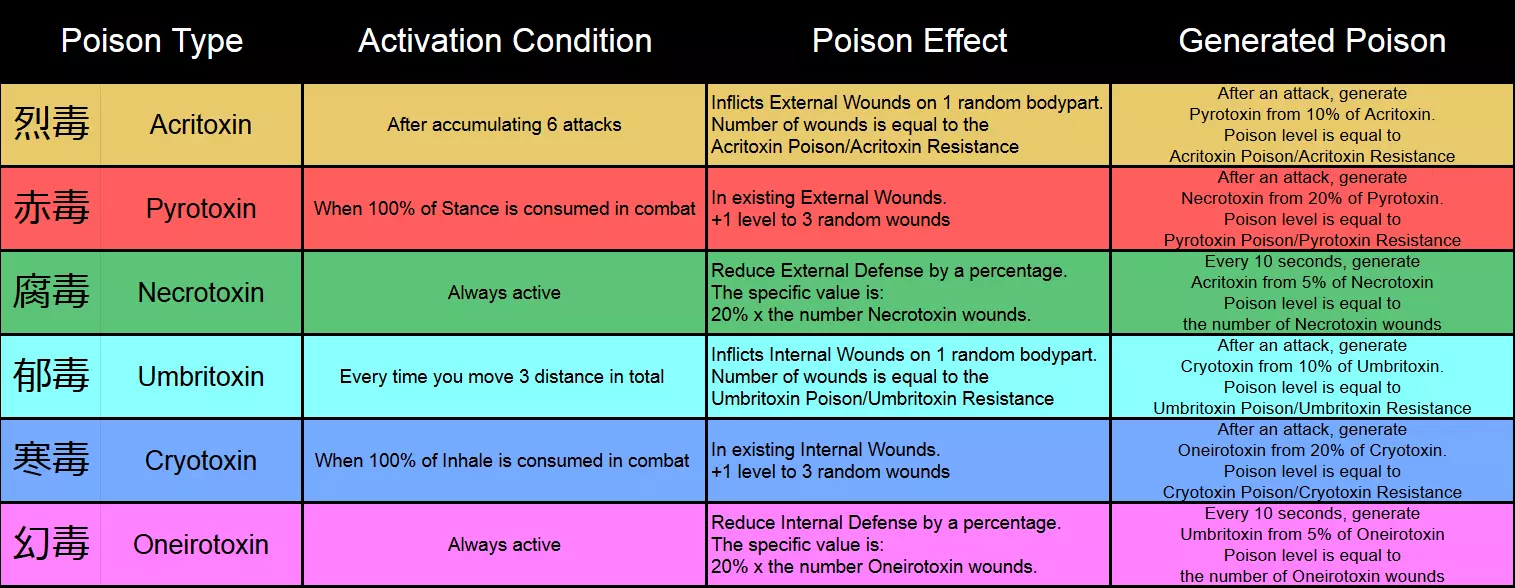 在《太吾绘卷》中,每个角色对状态窗口【伤势】标签下所列的6种毒均拥有抗性。将鼠标悬停在毒的类型上,即可查看该角色对特定类型毒的抗性。 毒抗性受多种因素影响,包括装备、技能以及内力分配。通常,毒抗性的主要来源是内力分配,每点内力能提供多少抗性取决于角色的属性。一般而言,如果不依靠装备和技能来弥补,角色至少会对一两种毒存在弱点(也有少数角色和 Boss 可能对某些甚至所有毒免疫)。当角色体内的毒素超过其对应类型的毒素抗性时,该角色开始受到中毒效果影响。此时,若角色处于战斗状态,还会获得一个对应类型的中毒标记。当毒素达到毒素抗性的200%时,效果会更加严重,同时生成第二个标记。当毒素超过角色毒素抗性的300%时,生成第三个标记,且毒素继续增加将不再使效果恶化。 施加毒素 毒素通常通过两种方式施加。一些攻击性技能,尤其是来自五仙教、百花谷等门派的技能,会对目标施加一定量的毒素。若以超过100%的威力释放技能,会施加更多毒素,反之则施加较少。或者,你可以选择一种毒药,然后使用毒药工坊建筑将所选毒药涂抹到武器或防具上。之后,每当武器命中敌人,或敌人攻击涂抹了毒药的防具部位时,武器或防具上的毒药剂量就会生效。这些毒药不会耗尽,你可以在攻击时不断叠加。 部分武器天生带有毒性,其中最典型的是毒粉武器。 需要注意的重要一点是,除了会施加固定剂量的毒药外,毒药还分为三个等级。(目前似乎尚未确定官方中文译名,因此这里将从弱到强的三个等级暂称为原始、强效和异域。)原始毒素无论如何都无法使毒素效果超过毒素抗性的199%。因此,如果敌人拥有100点冰毒素抗性,使用涂有40点原始冰毒素的武器攻击他们3次会使他们中毒并施加一个击败标记,但总共攻击5次只会使敌人身上的毒素上限达到199。所以,如果你想将毒素效果提升到下一级或更高,除非你此时使用能造成至少1点【强效】或【异域】冰毒素的武器/技能攻击他们。 强效毒素同样有上限,为毒素抗性的299%,而异域毒素的上限为32000,这个数值通常足以对任何你遇到的目标施加所有3个毒素标记。 毒素效果