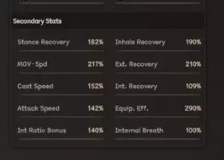 游戏中还有一系列次要属性会进一步影响战斗中的各种行动,我会在此简要介绍,并在讲解战斗机制时再做详细说明。 姿态恢复:角色每次命中或受到攻击时恢复姿态的速率。 吸气恢复:角色在战斗中随时间恢复吸气的速率。 移动速度:顾名思义,此属性越高,角色消耗相同移动量时移动的速度越快、距离越远。 异常恢复:角色从对手攻击造成的弱点状态中恢复的速度。 施法速度:角色在战斗中完成技能引导的速度。内力恢复 - 角色从穴位受击状态恢复的速度。 攻击速度 - 角色在战斗中获得攻击行动的速度。 装备效率 - 影响武器/装备可达到的最大效能(若此属性较高,且武器所需属性足够高,可使武器效能超过100%)。同时减少切换武器的冷却时间。 内力比例加成 - 让你能更自由地调整武器和技能的内外伤比例,后续将详细说明。 内力调息 - 加快失去的真气恢复速度,延长额外获得真气的持续时间。同时加快混乱内息的恢复速度,并减少受到的混乱内息。 基础移动与攻击