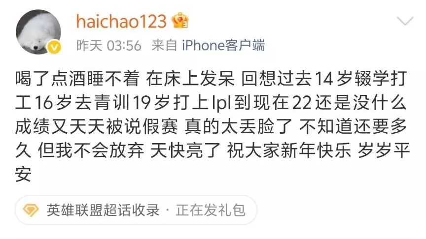 海超深夜发文吐槽 OMG现役中单海超,在年初一凌晨4点的时候发文:14岁辍学打工,16岁去青训,19岁打上LPL,现在22岁还是没成绩,天天被说假赛,真的太丢脸了,从LGD到LNG,再到OMG,海超3年职业生涯,唯一的巅峰就是虐过一次左手,但除此之外,剩下的比赛,他的表现是真的很拉胯。