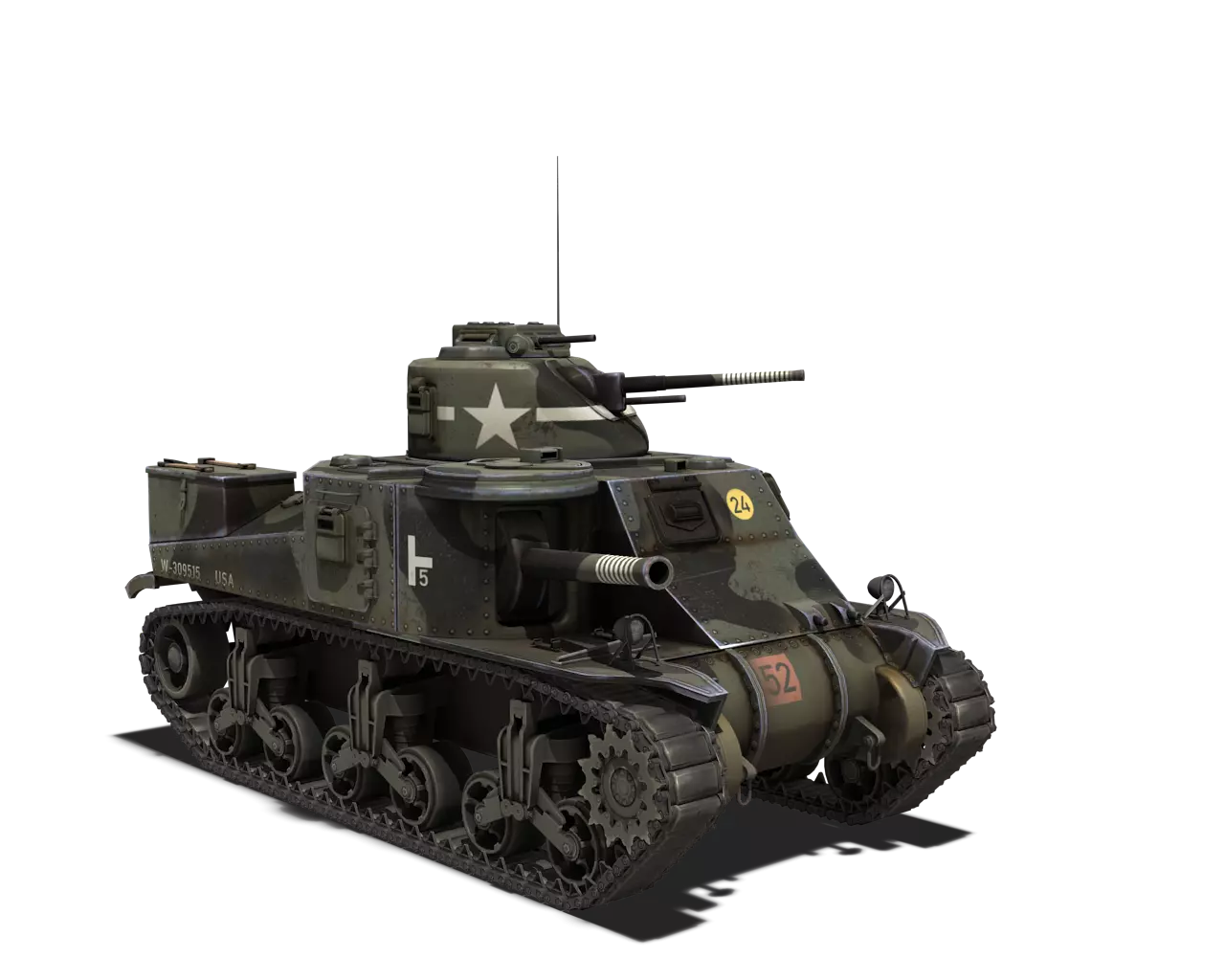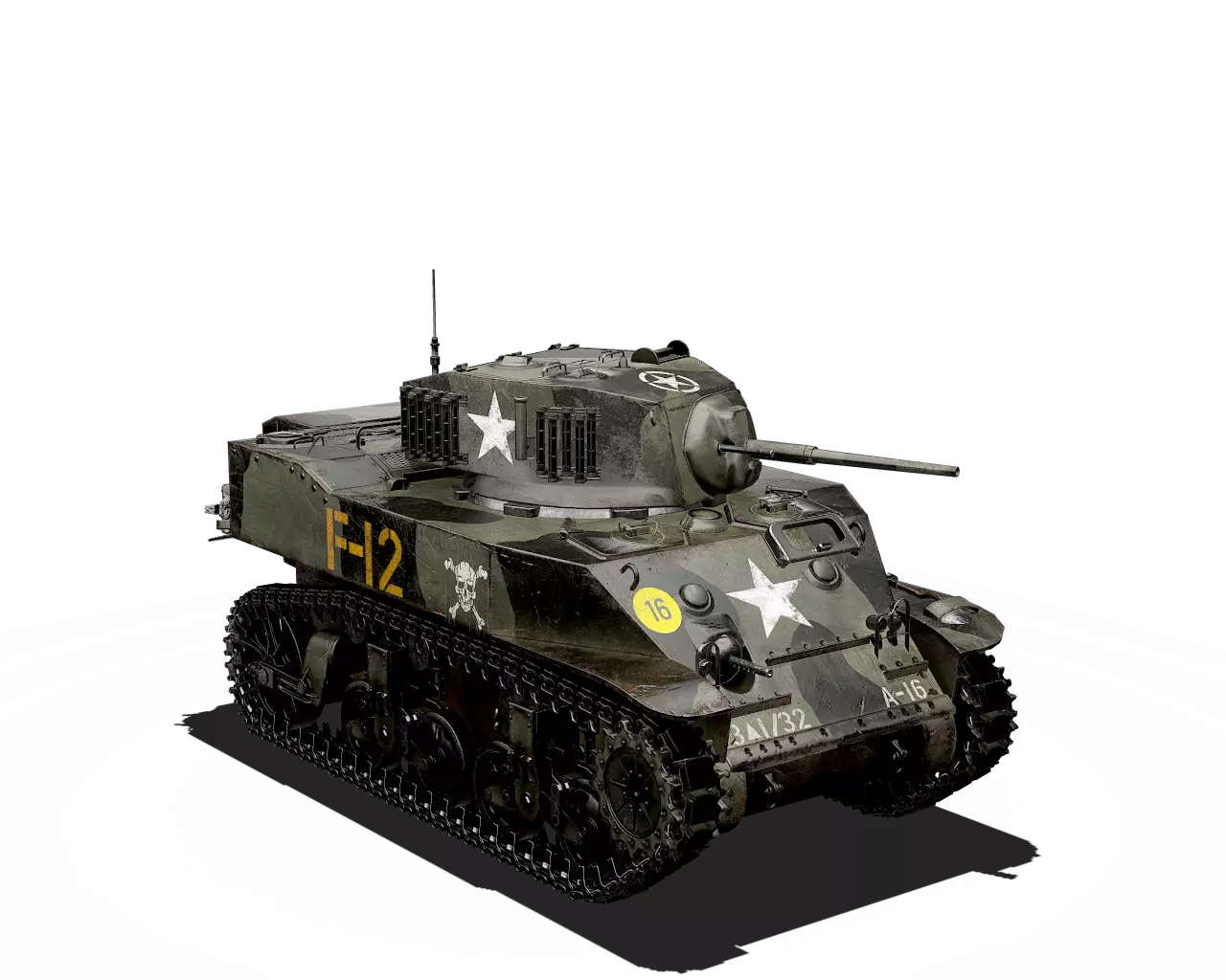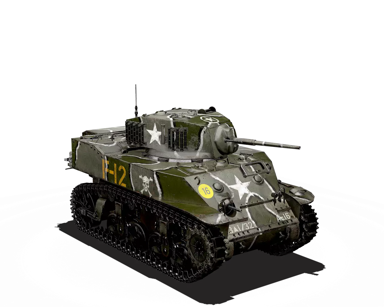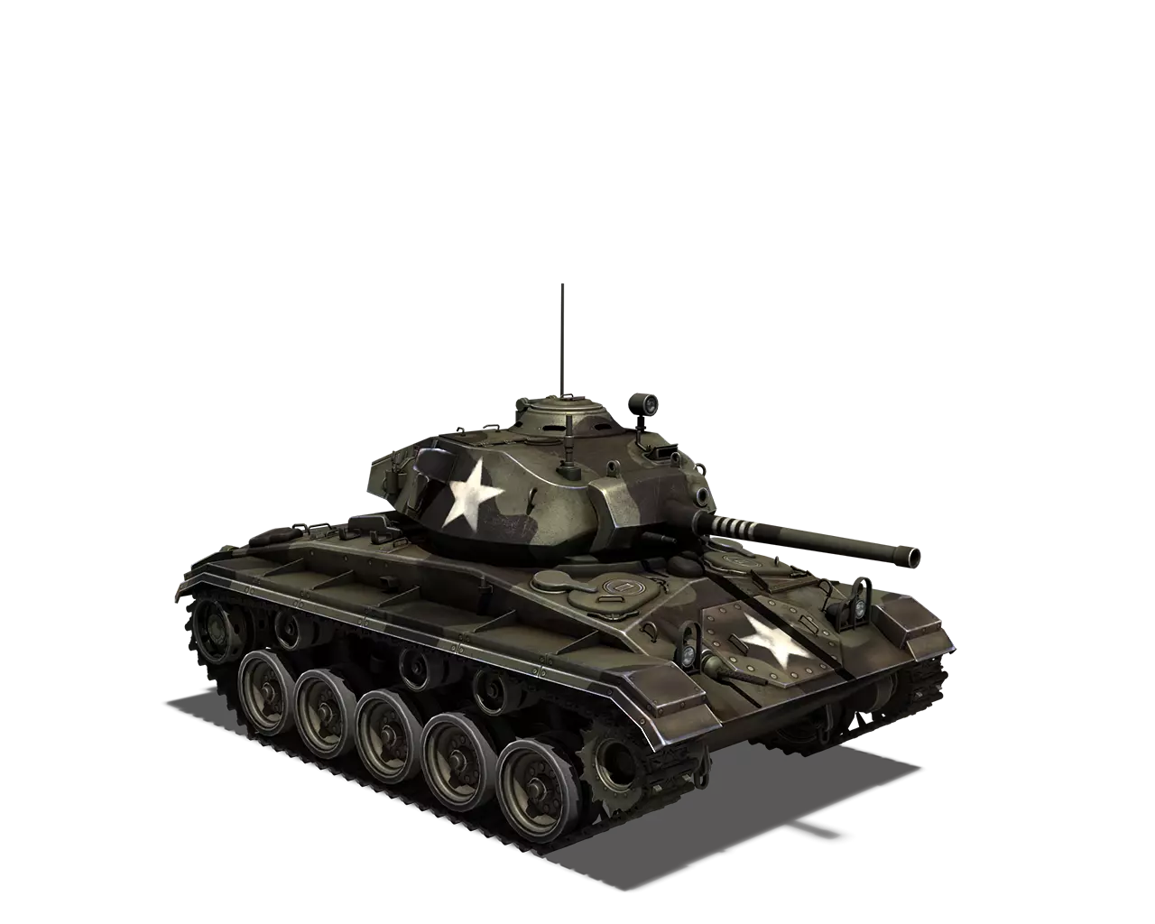 简短描述: 这是一款相当普通的涂装,再次缺少其他自然色彩。不过,它通常是大多数美国载具可用的最佳涂装。 最佳使用地点:山地、城市 适用地点:夏季森林 不适用地点:秋季森林、开阔田野 个人战斗评分(1-5):3 价格:100,000 银币或 400 金币 M5A1 斯图亚特 原厂