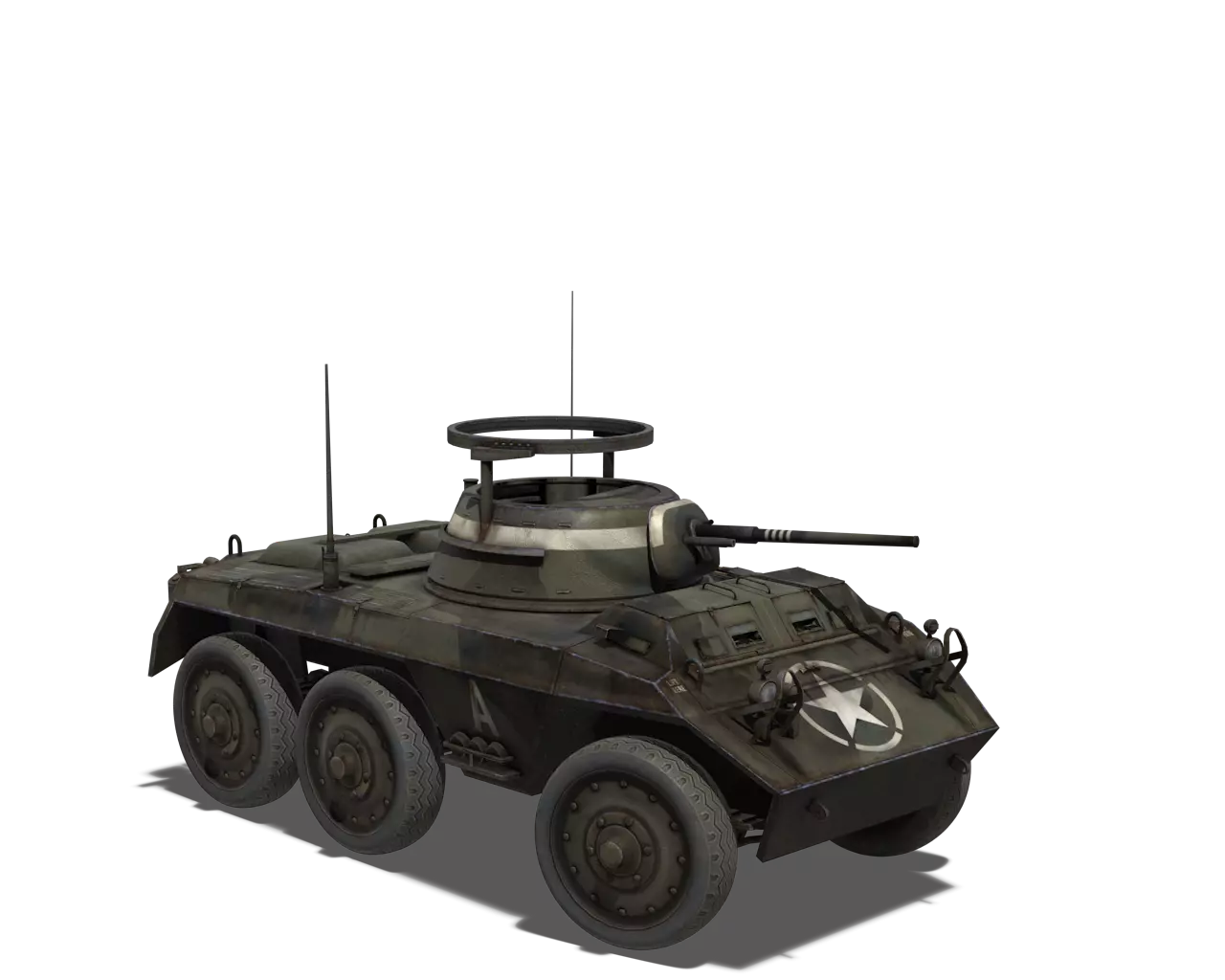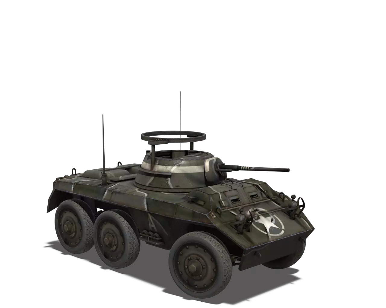 简短描述:相当普通的涂装,再次缺少其他自然色彩。不过,它通常是大多数美国载具可用的最佳涂装。 最佳使用地点:山地、城市 适用地点:夏季森林 不适用地点:秋季森林、开阔田野 个人战斗评分(1-5):3 价格:100,000 银币或 400 金币 M8 灰狗 原厂