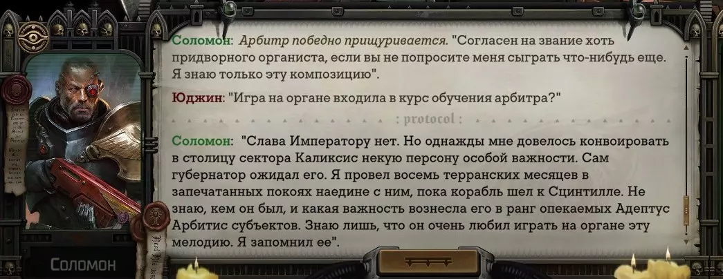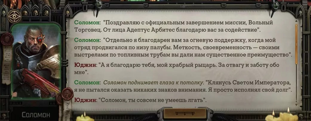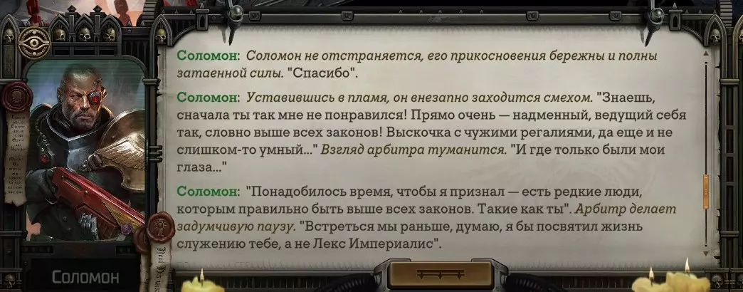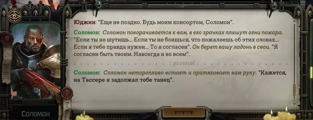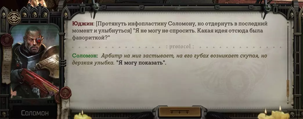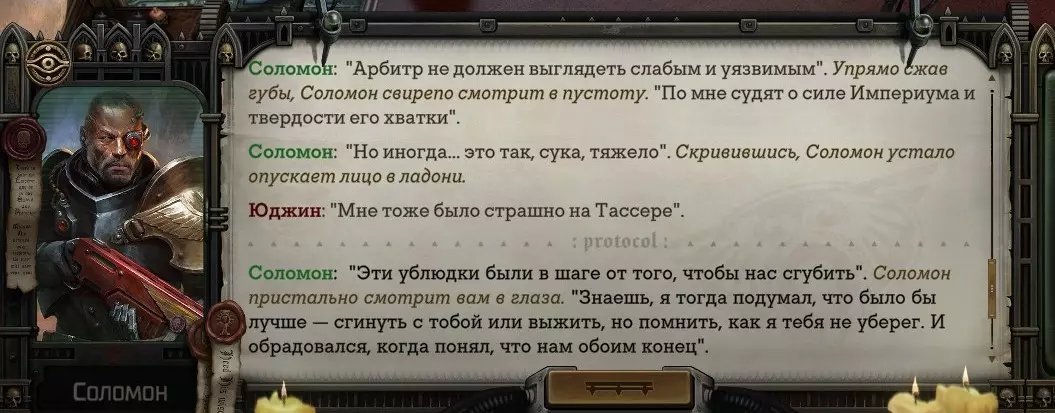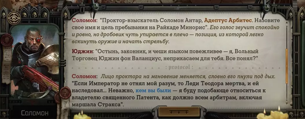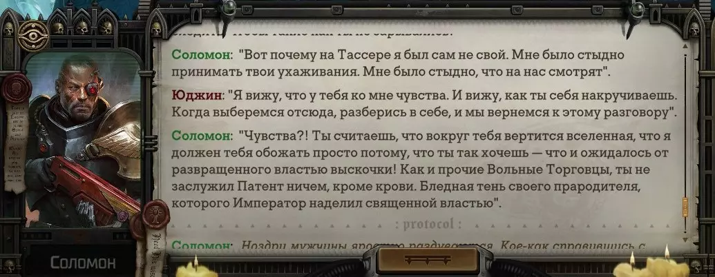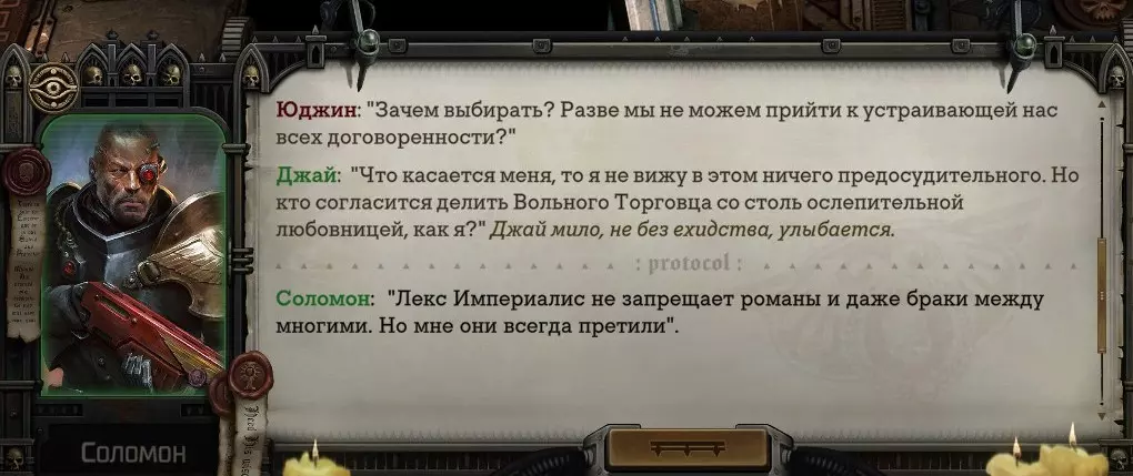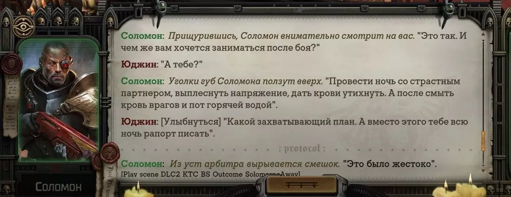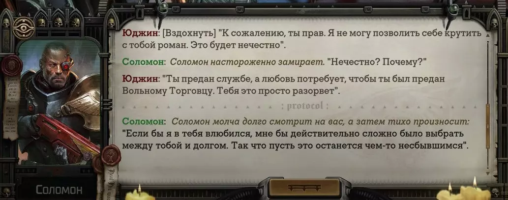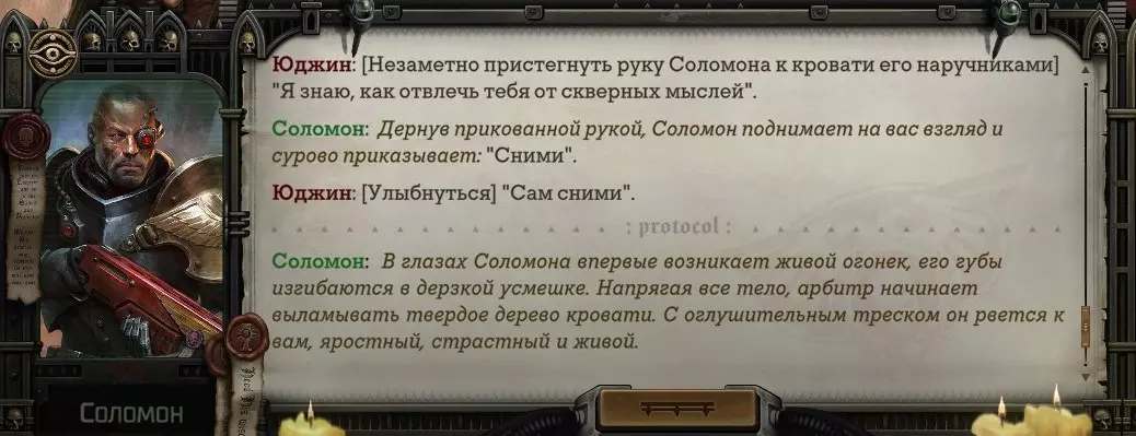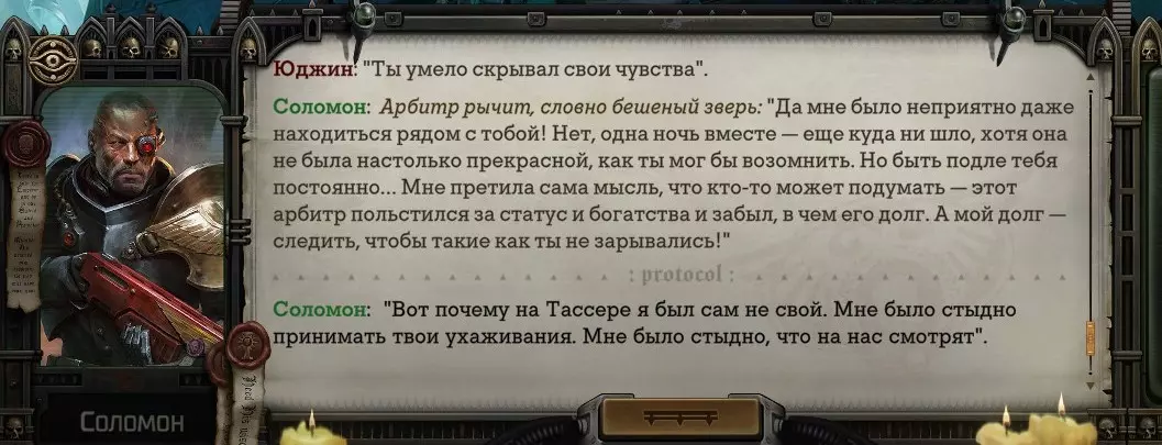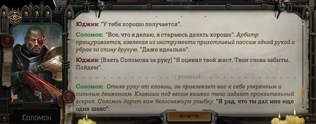 Гайд-обзор на роман проктора Соломона Антара из дополнения Lex Imperialis. С выходом на тру-концов очку и ачивку «Пламя». Предупреждения: гайд 18+, есть одно матерное слово на скрине. Вводные данные Тихого вокса, чегнари. Чё, как жизнь? Не хотите ли поглядеть на роман с новым сопартом из Lex Imperialis, а может и ачивку «Пламя» из него выбить? Если да, то вы по адресу, ведь я на этом, знаете ли, собаку съела. BA-DUM-TSS. Весь гайд состоит из спойлеров, спойлерных текстов, спойлерных скринов, абсолютно весь от и до! Имейте в виду. Что важно знать. Про рекрутинг нового сопарта и вообще Подобрать Соломона Антара можно даже в конце четвертого акта, запустив DLC в настройках игры после закрытия сюжетных квестов. Но это не так интересно, как пройти игру с самого начала (хотя сие и запарно, не спорю). Первая встреча с проктором будет на Райкаде, если вы запустили игру аж сначала. Снова напомнят о себе арбитры на Футфоле, после первой же беседы с наместником Владаймом Токарой. Вас позовут на потную миссию, куда лучше соваться с пати на уровне 20+. Поехать на эту миссию с лоулевельной пати — это жесть. Будете превозмогать и траить бои. Прим.ред: забудьте всё, что я написала. Бой понерфили. Если запустили ДЛЦ в середине прохождения, то проктор вылезет пообщаться после первого варп-прыжка и попросит торговца об аудиенции с маршалом Адептус Арбитес на Даргонусе. Арбитра можно шатать по мировоззрению, от еретика РТ он не сбегает как некоторые лояляхи. Но всё-таки кинуть торговца он может. Просто по другим идеологическим причинам. Сохраняйтесь почаще. Просто во избежание багов. А еще, поставьте себе мод-багофиксилку[www.nexusmods.com]. Это лучшее, что делали для игры сразу после Тойбокса. Атвичаю. Про романсовый контент Роман с проктором доступен как мужчинам, так и женщинам. Перед лицом Лекс Империалис все равны, в кровати с Соломоном тоже. За вывод арбитра на тру-концовку романа отвечает флаг SolomorneImpressed («Cоломон впечатлен», стало быть). И для успеха надо наколотить их как минимум три. Флаги тестировались на версии игры 1.4. Если вы видите, что тексты на скринах в гайде какие-то не совсем те, что у вас в игре получились — не пугайтесь. Два патча с момента релиза дополнения вносили стилистические (но не глобальные смысловые) правки в диалоги на романе Соломона. Суперкраткая выжимка гайда доступна в виде таблицы флагов[docs.google.com] романа мента. А здесь только стены текста, скрины, вещдоки, чушь собачья и полный Флекс Империалис. Я даже не буду скрывать, что писала руководство ради кека. Показывать и рассказывать про подводные камни буду на примере М+М романа. И если вы такое на дух не переносите — сейчас хороший момент, чтобы закрыть гайд, спасибо! СсылкиДругие стимовские руководства по тру-лаву моего пера: тру-роман дознавателя, романсим Кассию, угараем с Джай. И от ToxicBulb: 120 дней Содома с Маражаем, греко-римская борьба в кровати с ассасинкой культа смерти. + общая табла флагов ВСЕХ персонажей[docs.google.com] от ToxicBulb. Хинты по роману с Ирлиэт тоже там есть, добавляйте в избранное и не тормозите. Вопросы по романсовым аспектам также можно сходить задать в тематическом обсуждении, велcum.┌( ಠ_ಠ)┘ Акт 1. Мы встретились в странный период В составлении этого гайда нам помог отпетый крайм-лорд Юджин (Евгений) фон Валанциус. Патент-то он получил, да привычка «нагибать легавых» (во всех смыслах) никуда не делась. Хехе. ( ͡